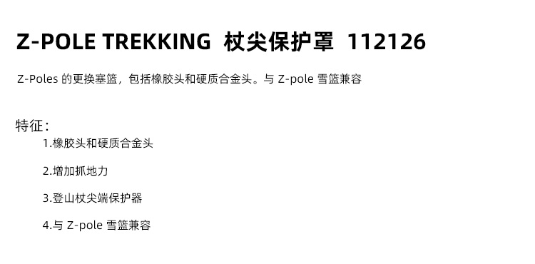 顏色分類 BD Distance Z Straps M-L Z杖護腕 112118-一對橡膠技術杖尖 112119-碳化合金技術杖尖-一對 112126-Z-杖阻泥籃(含橡膠杖尖和金屬杖尖各一對) 112524-Z杖杖尖-一對(含橡膠杖尖和金屬杖尖) 阻泥藍一對(適配Distance摺疊杖) 112122-z杖阻雪籃(卡式)