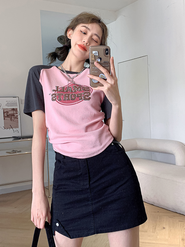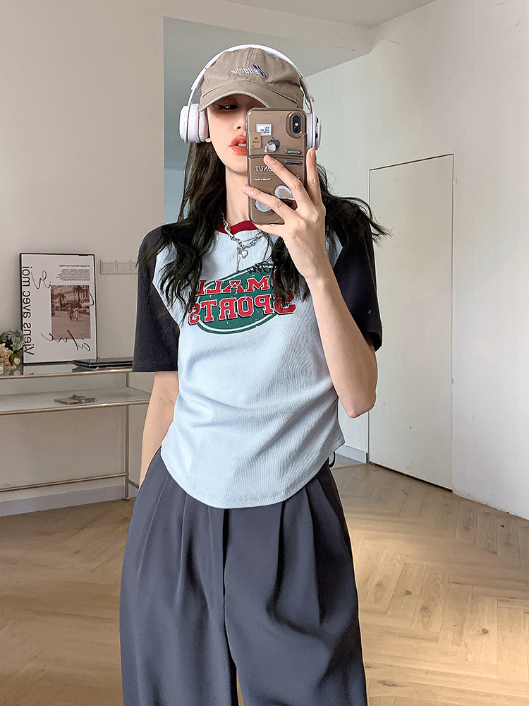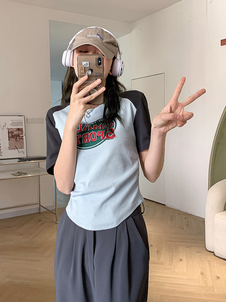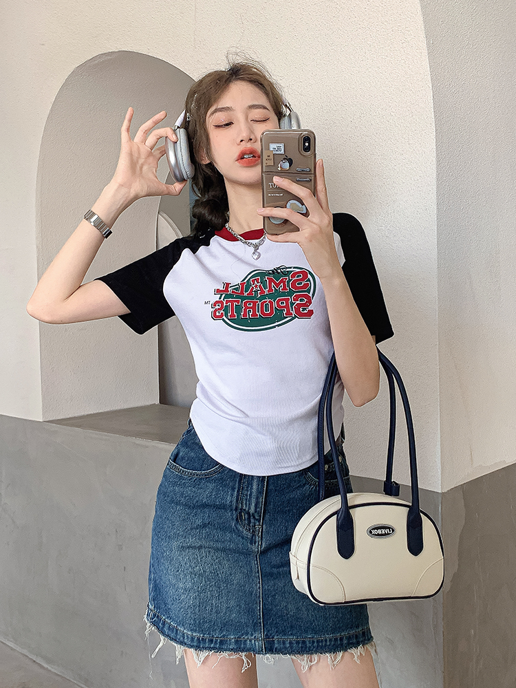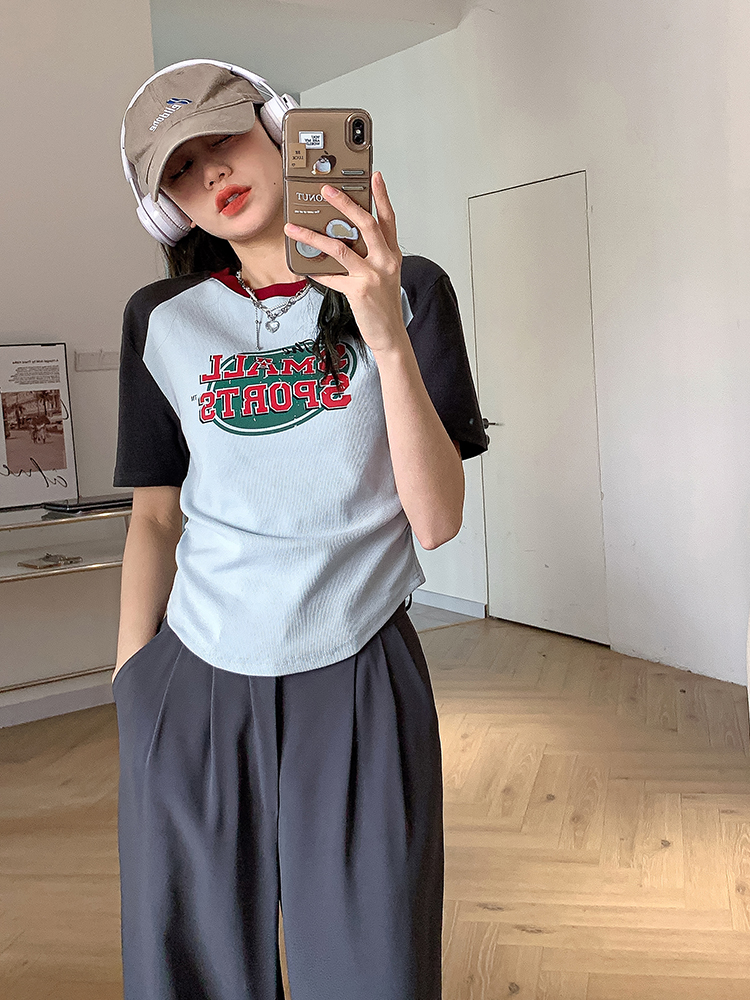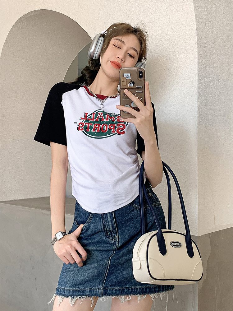 美式復古T恤女2023夏季新款插肩短袖打底衫收腰純棉圓領短款上衣