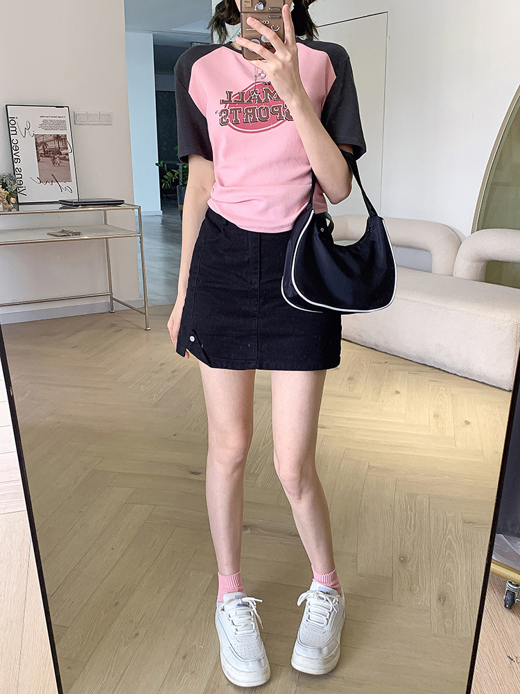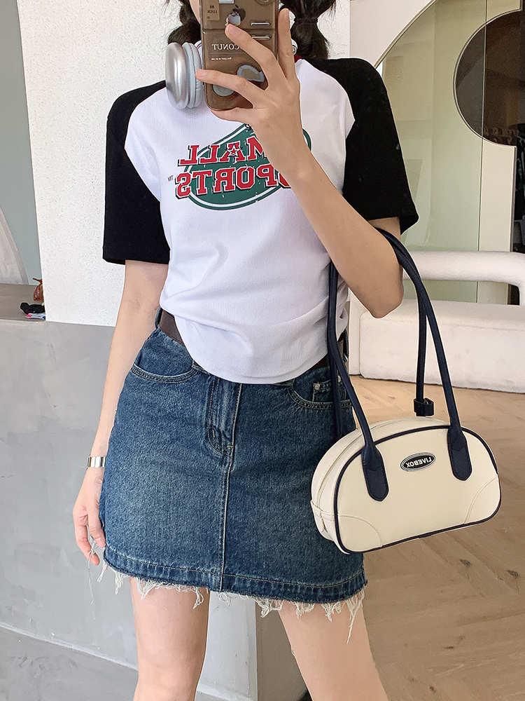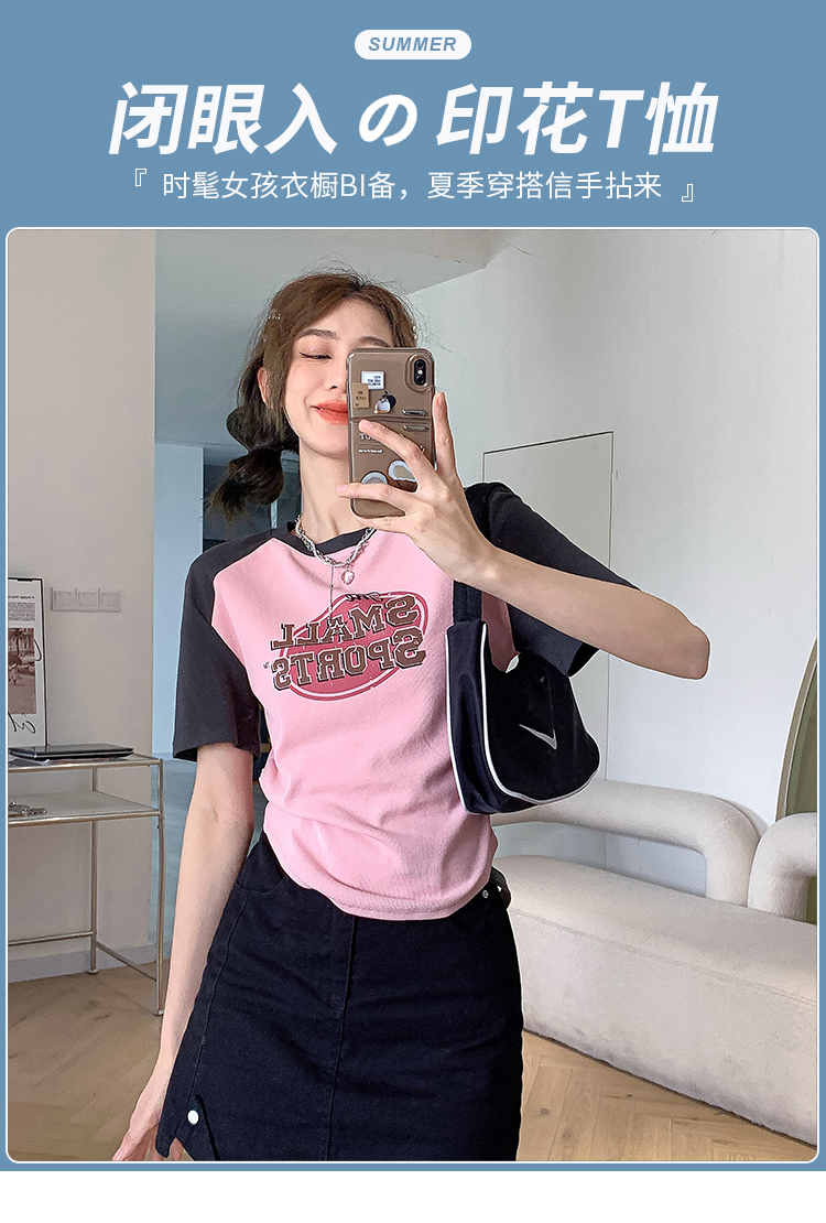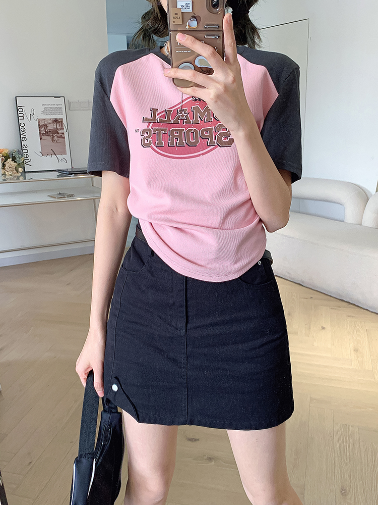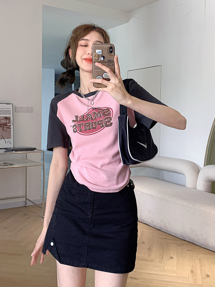 美式復古T恤女2023夏季新款插肩短袖打底衫收腰純棉圓領短款上衣