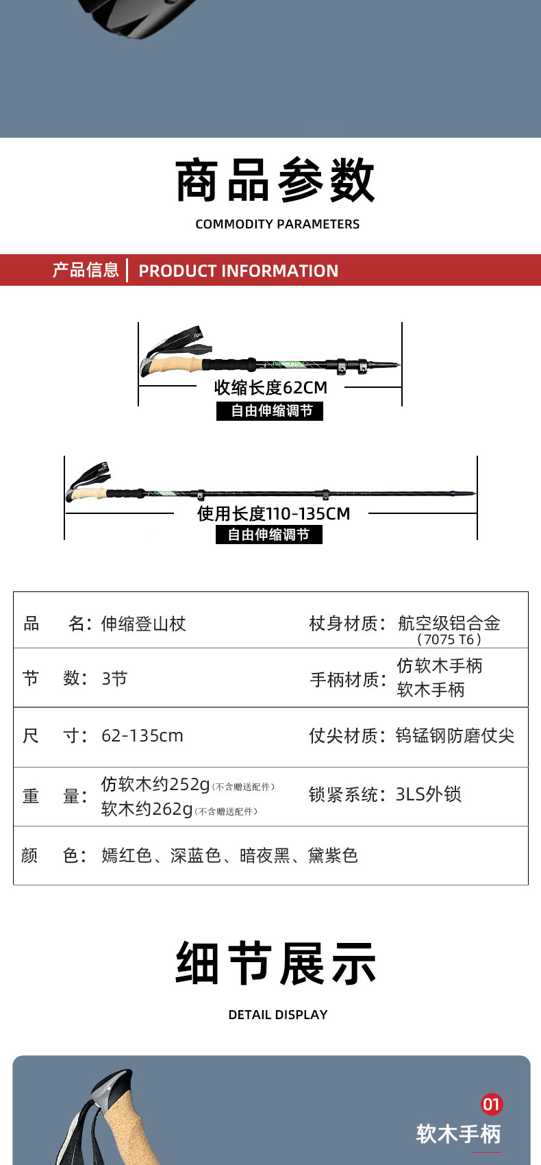 顏色分類 暗夜黑-伸縮款【7075鋁合金伸縮-輕盈可攜式】僅252g 深藍色-伸縮款【7075鋁合金伸縮-輕盈可攜式】僅252g 黛紫色-伸縮款【7075鋁合金伸縮-輕盈可攜式】僅252g 嫣紅色-伸縮款【7075鋁合金伸縮-輕盈可攜式】僅252g 黑綠色-T柄伸縮【軟木手柄-更輕更短】僅246g 黑黃色-T柄伸縮【軟木手柄-更輕更短】僅246g 暗夜黑-伸縮款【軟木手柄+鋁合金杖身】僅262g 深藍色-伸縮款【軟木手柄+鋁合金杖身】僅262g 黛紫色-伸縮款【軟木手柄+鋁合金杖身】僅262g 嫣紅色-伸縮款【軟木手柄+鋁合金杖身】僅262g