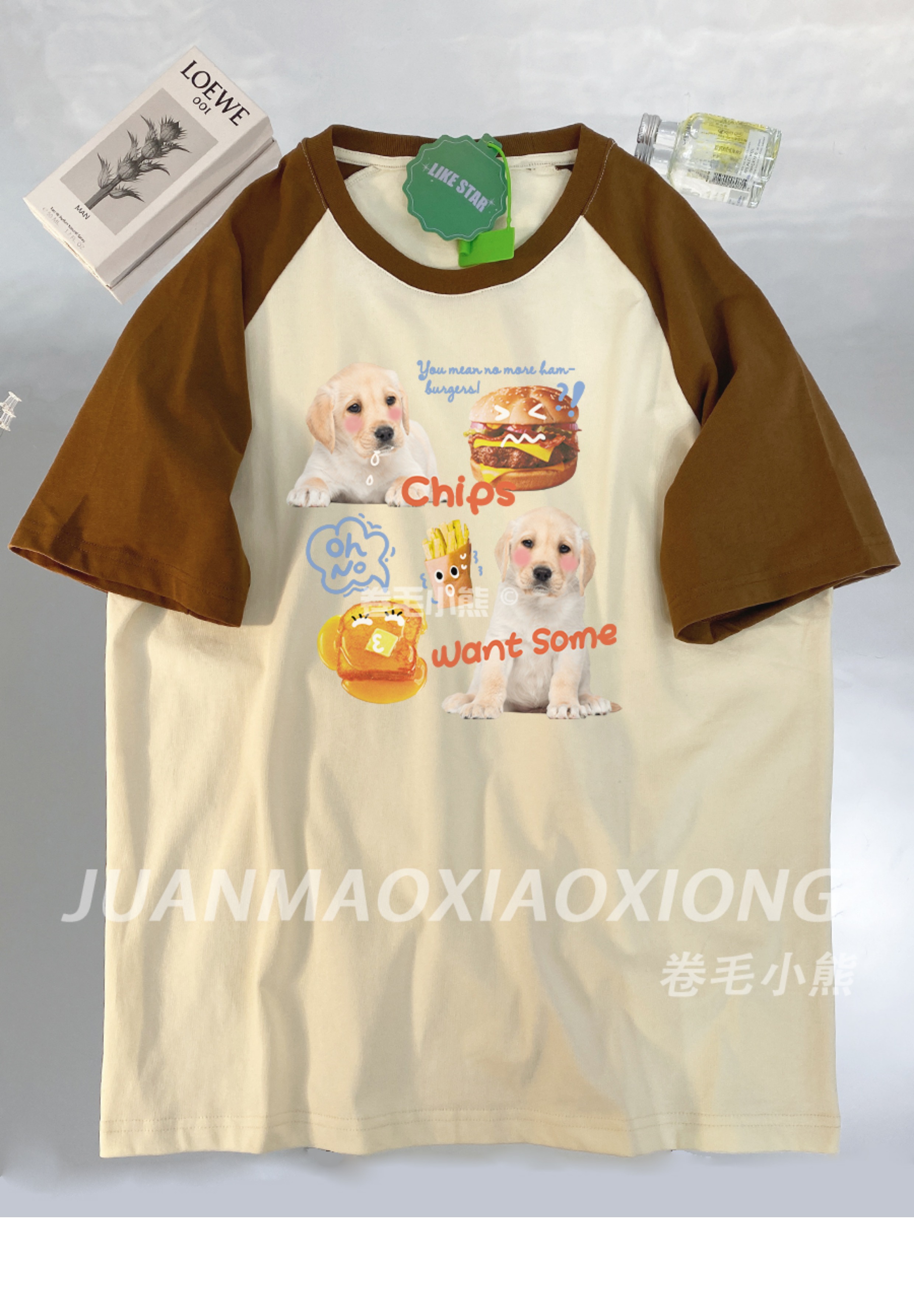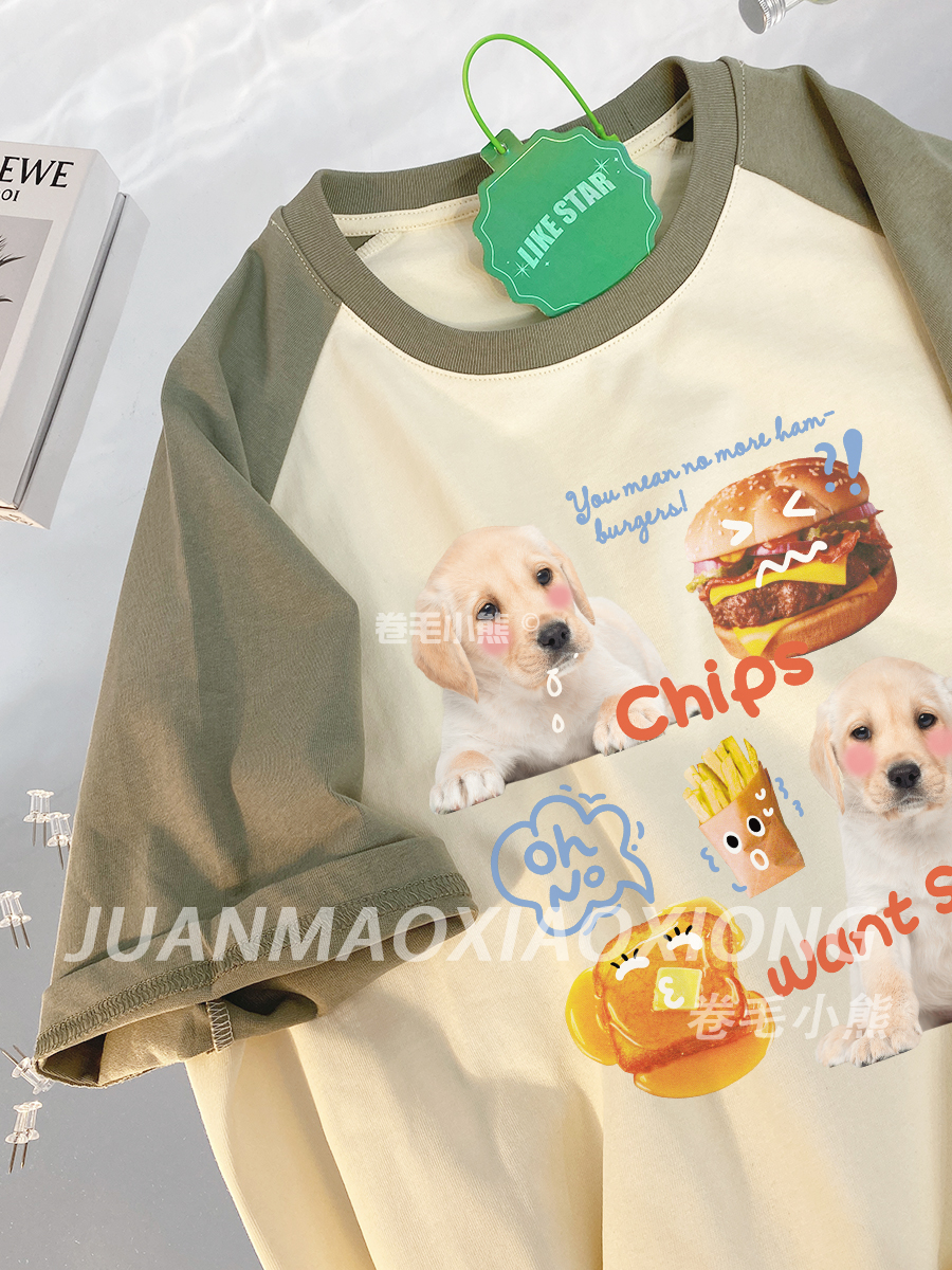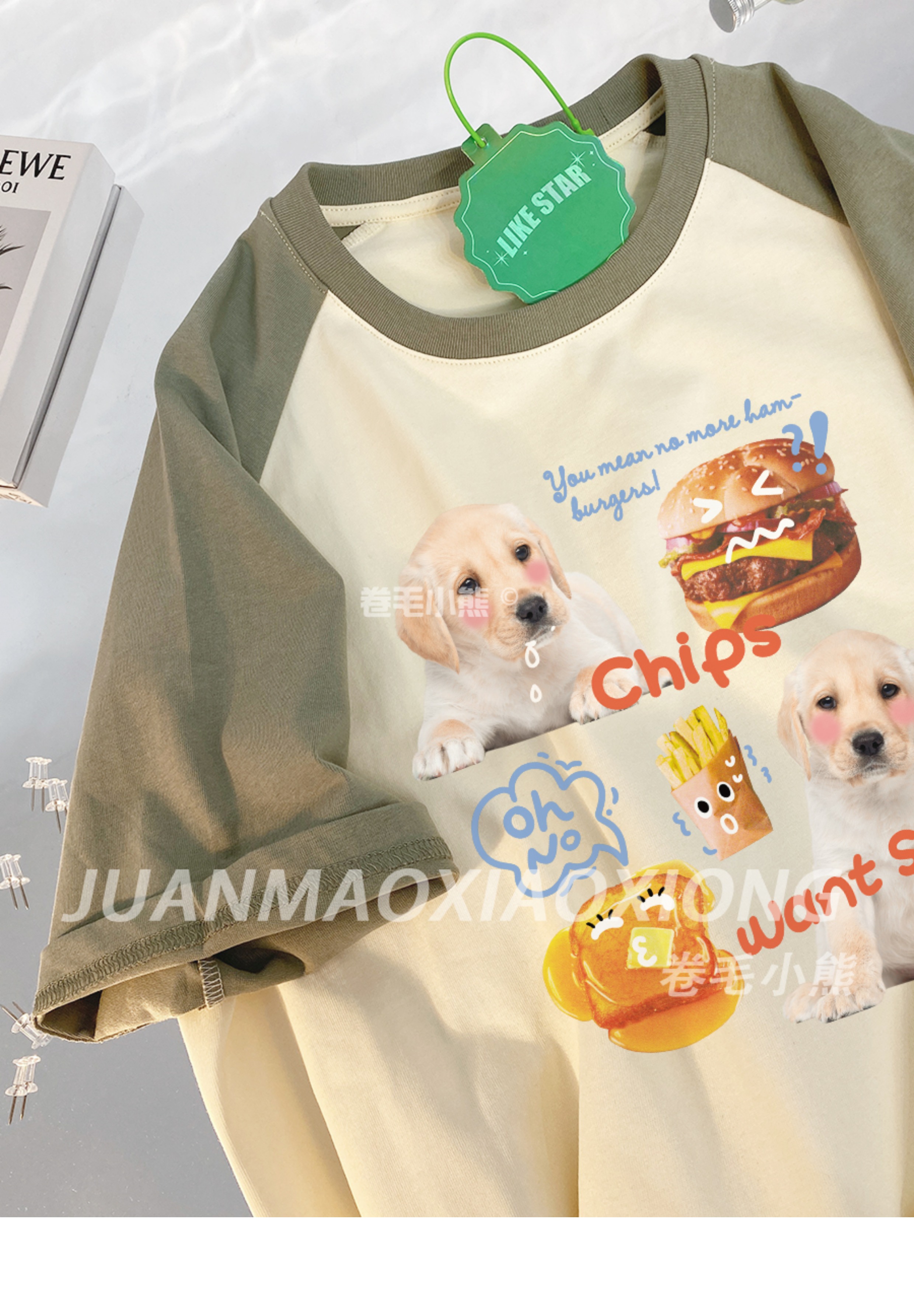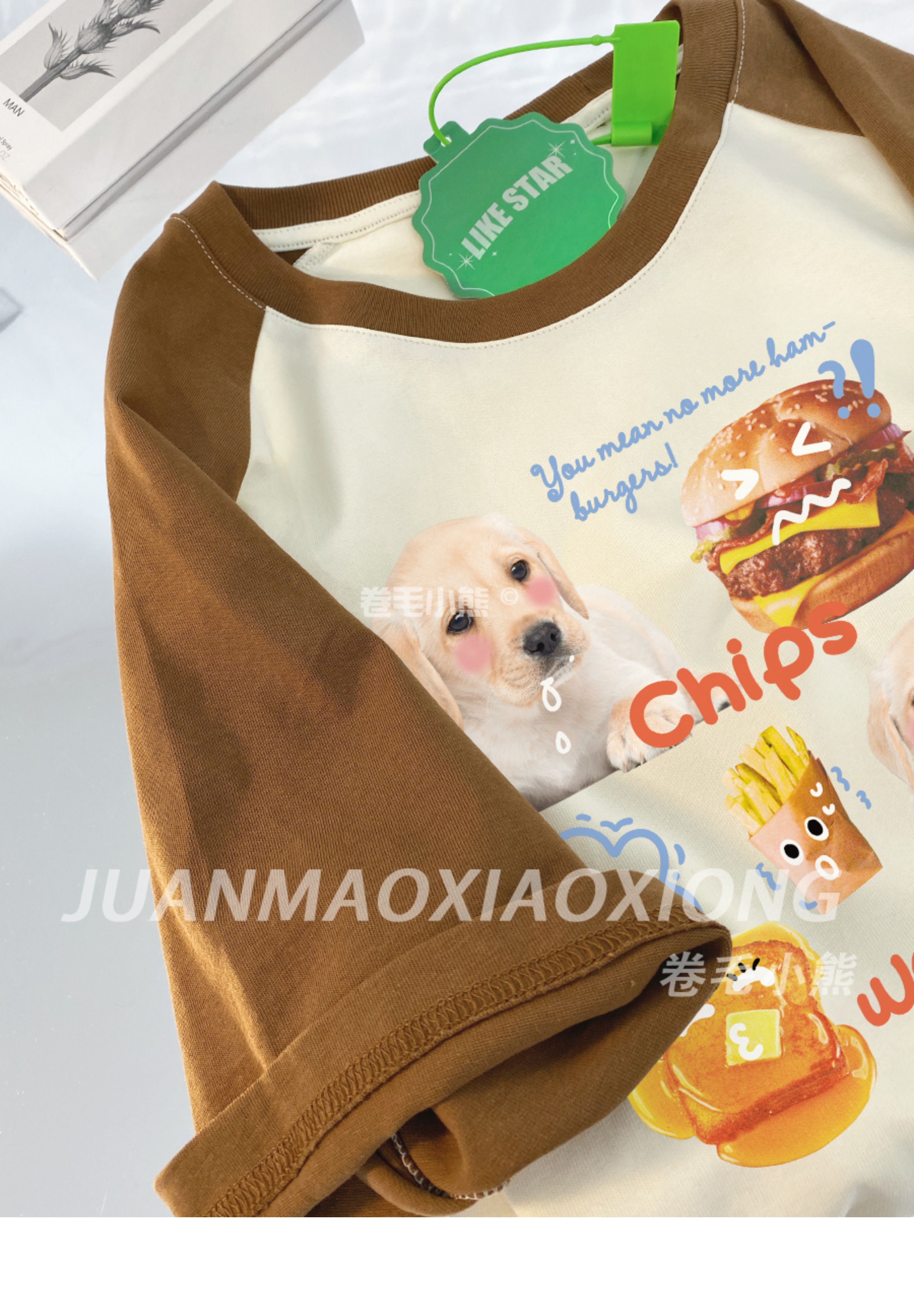 burger修狗拼接撞色插肩短袖小眾T恤夏季美式純棉寬鬆情侶T五分袖