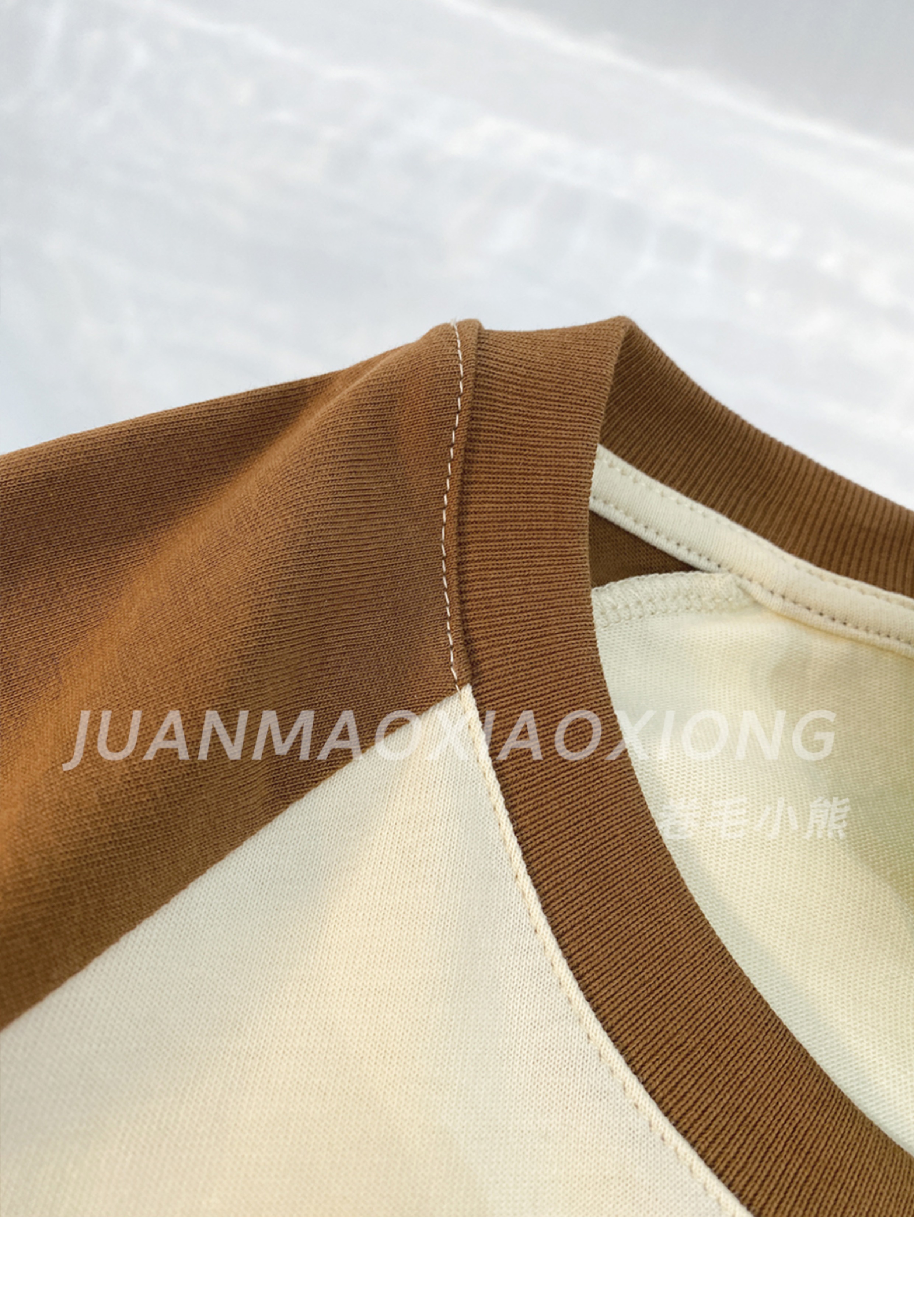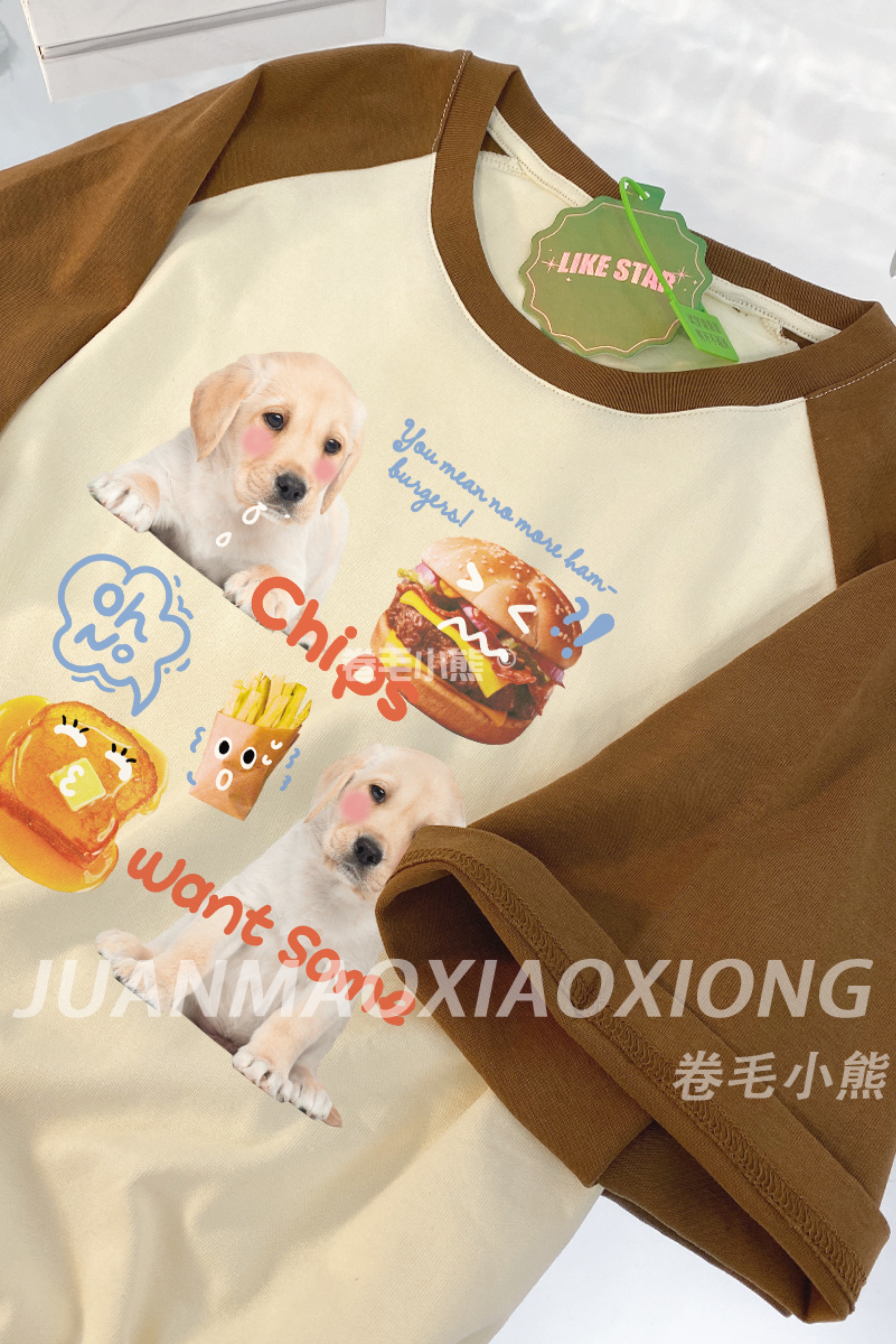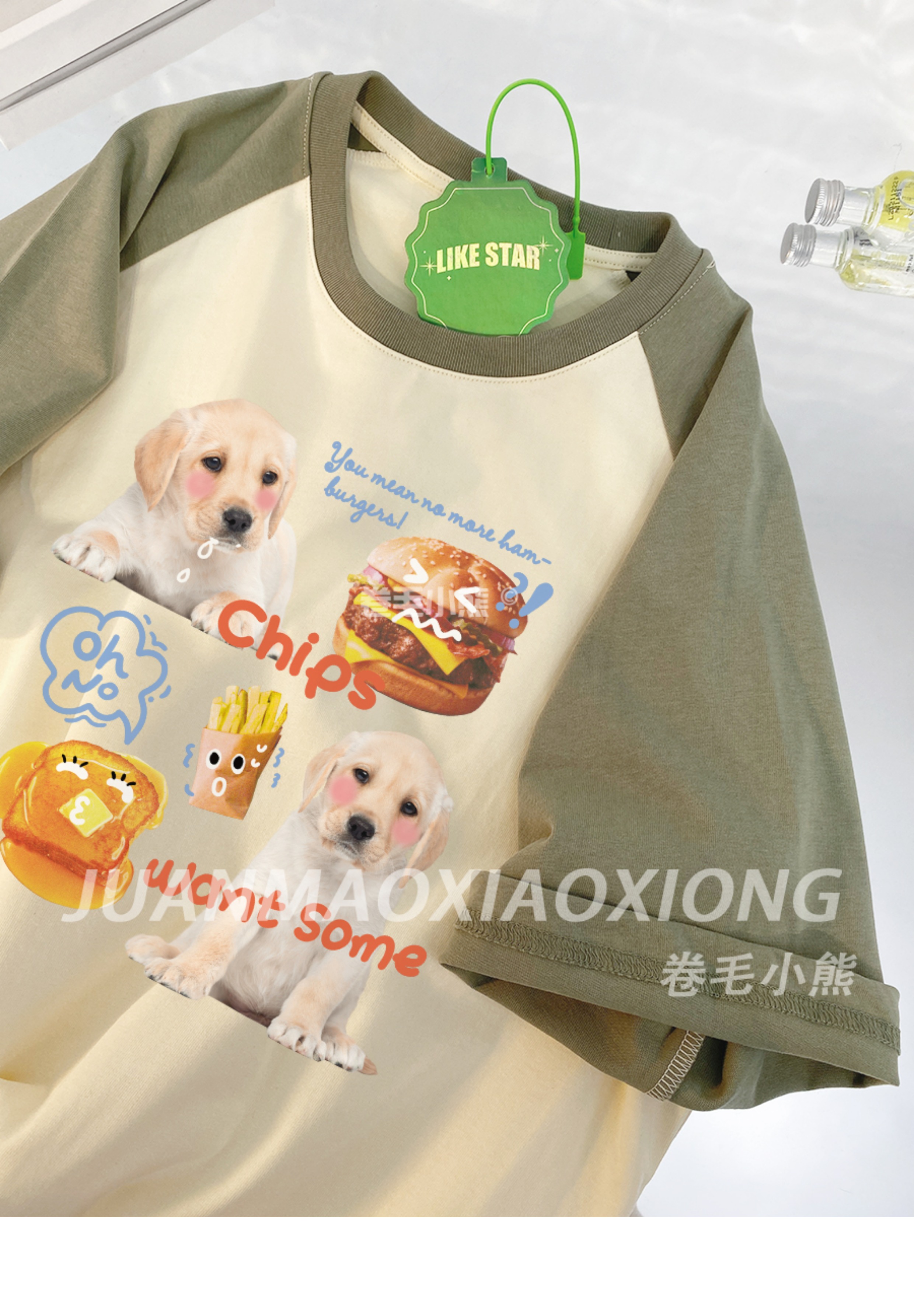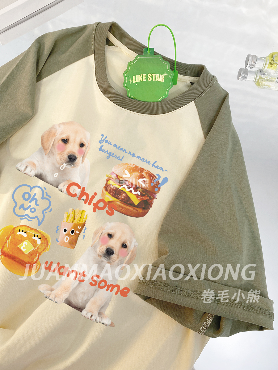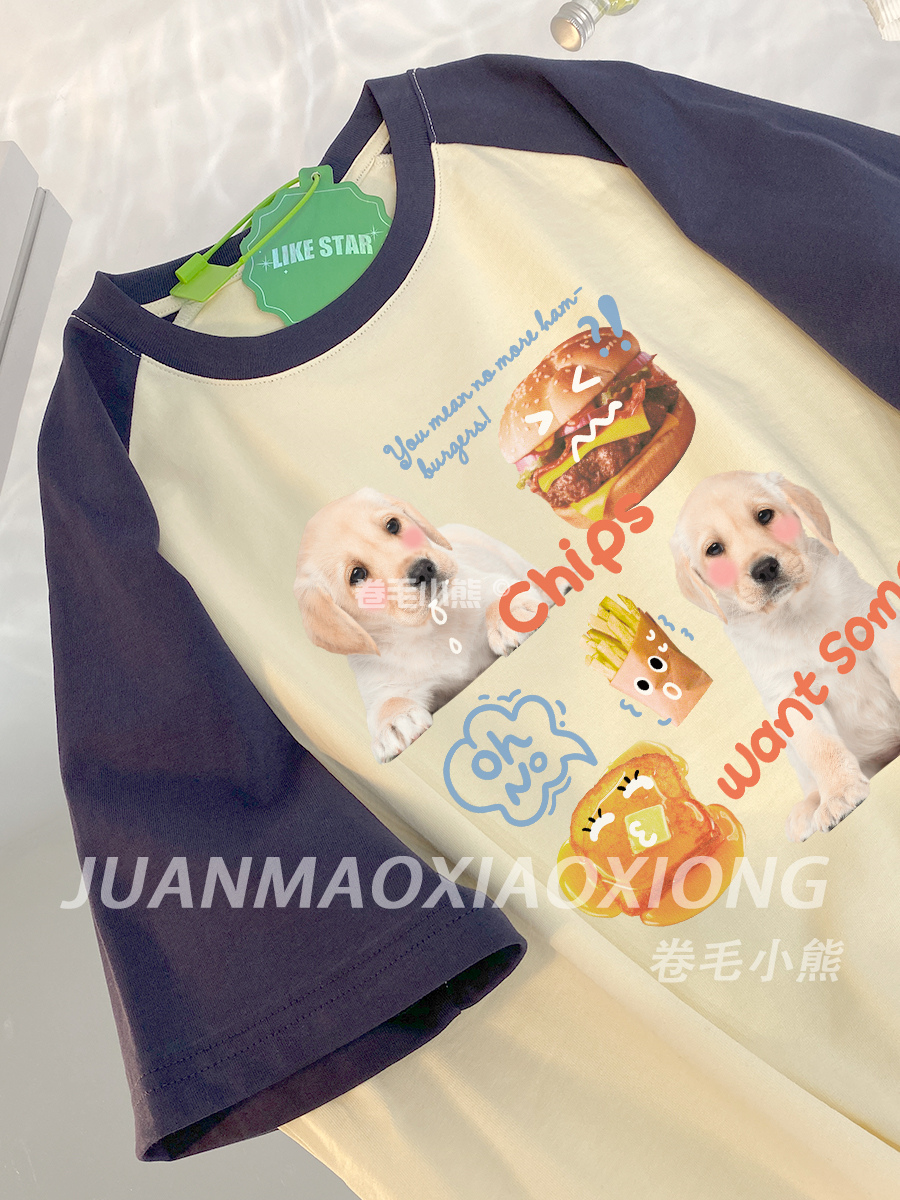 burger修狗拼接撞色插肩短袖小眾T恤夏季美式純棉寬鬆情侶T五分袖
