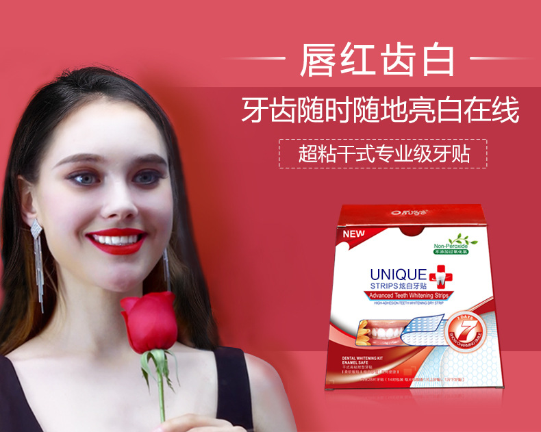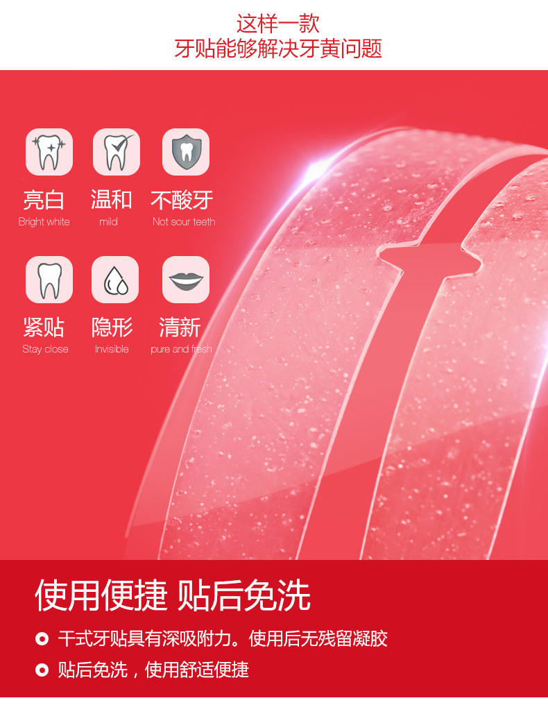 3.干式牙贴呈现干式状态,与牙齿接触时,特殊的配方能瞬间产生超强的粘附力,这种特殊的超强粘附力,可以达到1-2个小时以上的贴附时间,从而提供了很好的牙齿美白效果。