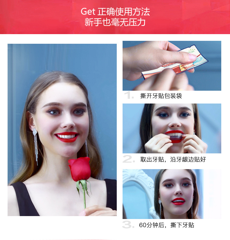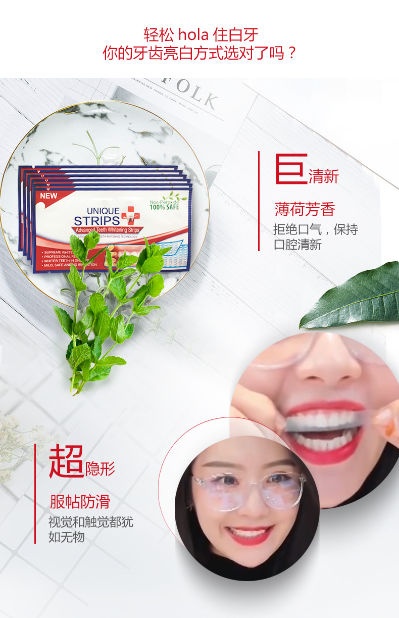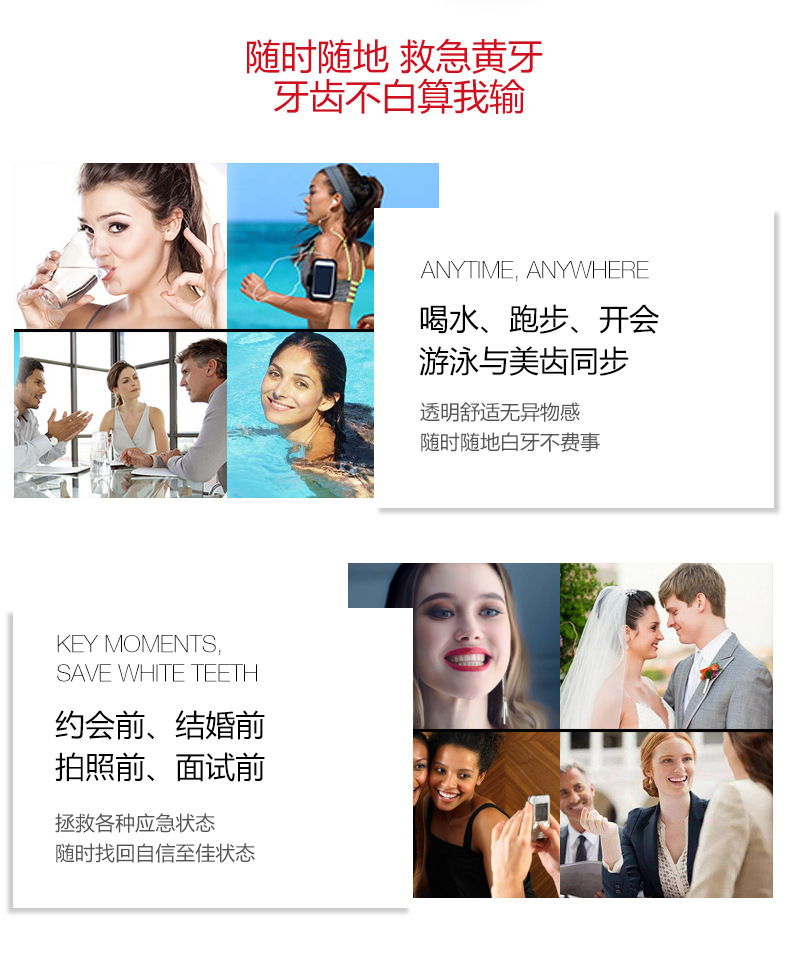 4.干式牙贴的高粘附特点,有着比凝胶牙贴更加自由舒适的使用体验,游泳、跑步等激烈运动也不会从牙齿上脱落,高科技带来优越的牙齿美白享受。
