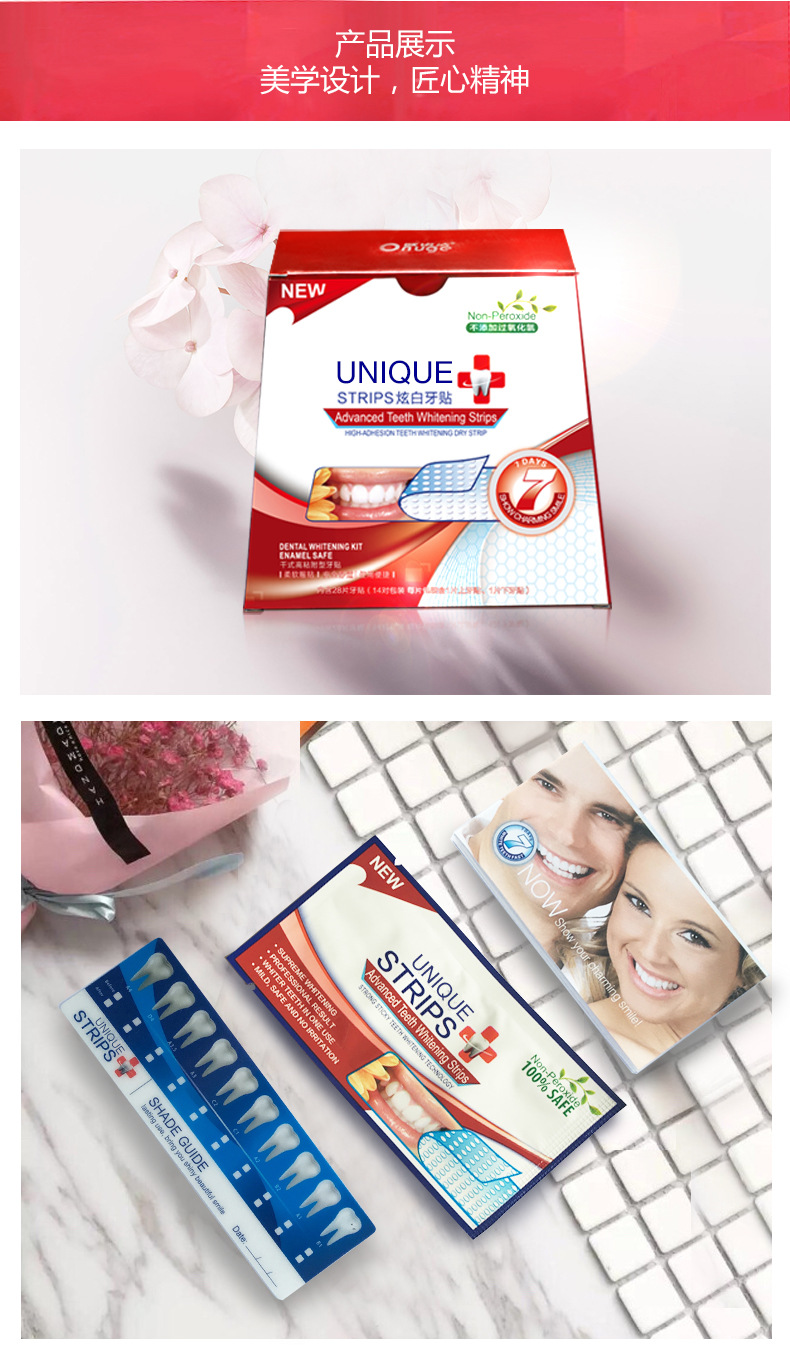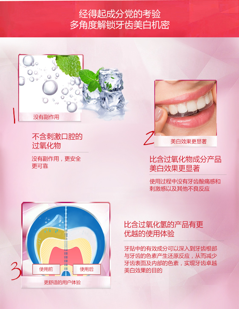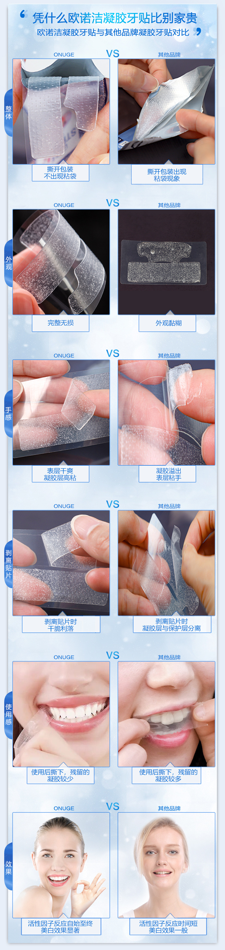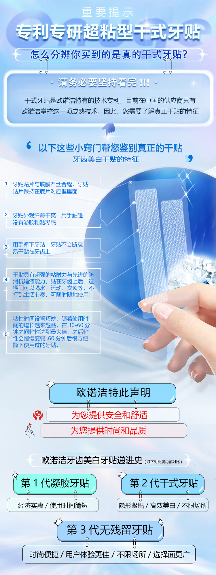 2.目前干式牙贴是行业里优越的一款产品,国际上也只有欧诺洁掌握这种专利的技术,而且是不使用过氧化氢稳定剂的一款美白牙贴。