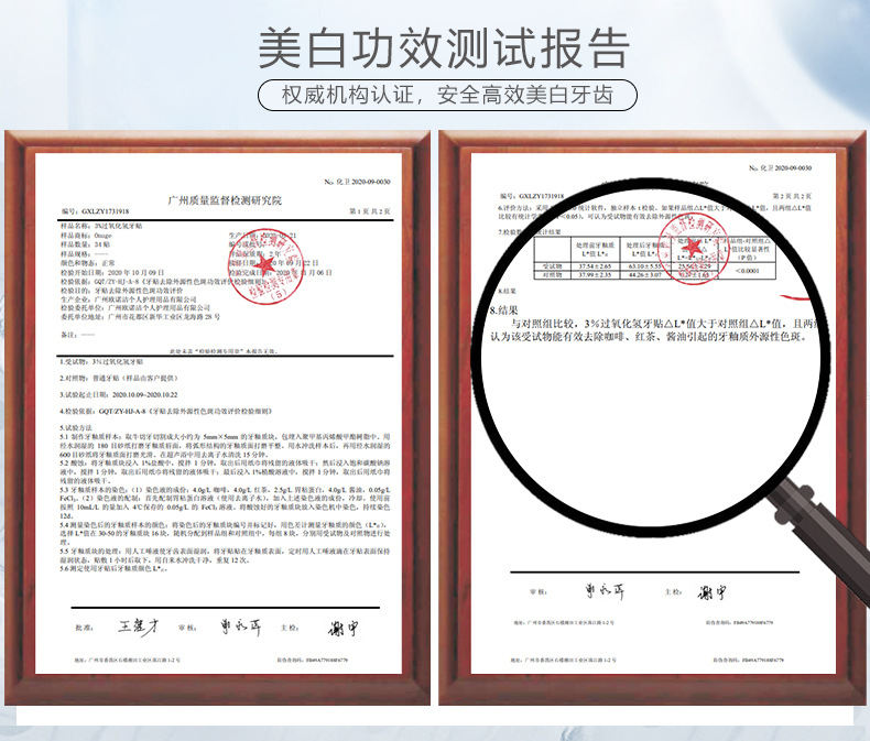 5.干式牙贴有着超强稳定性,高温天气存放也完全不会分解和涨气,保质期可长达3-5年,从而保证了产品有着牙齿美白效果。
