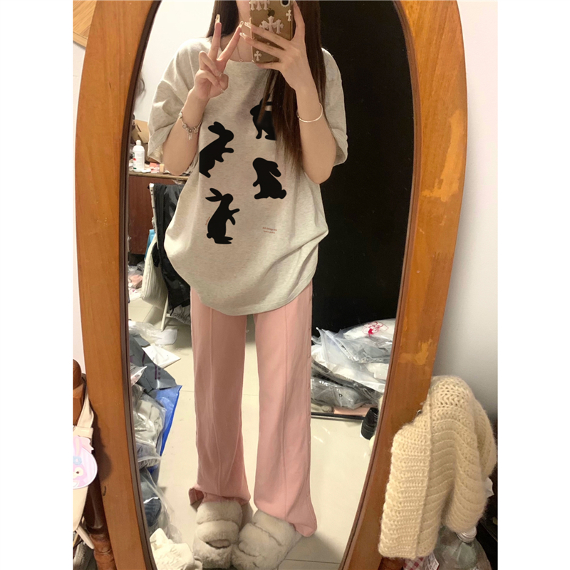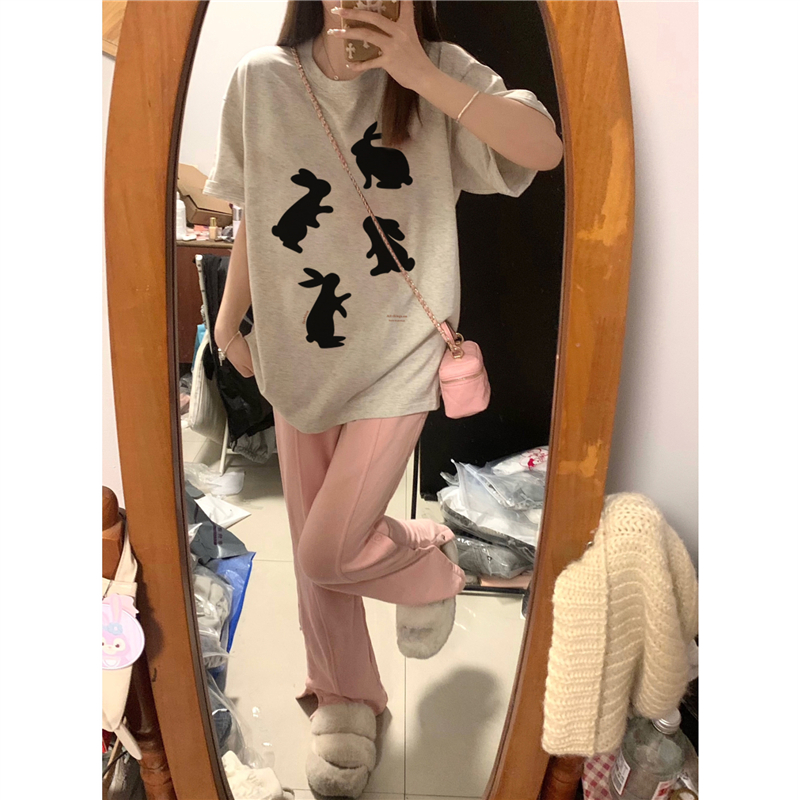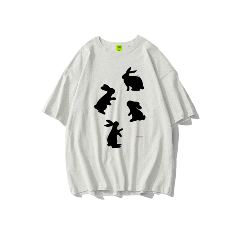 100%純棉設計感卡通兔子正肩短袖t恤女夏季小眾慵懶港味chic上衣