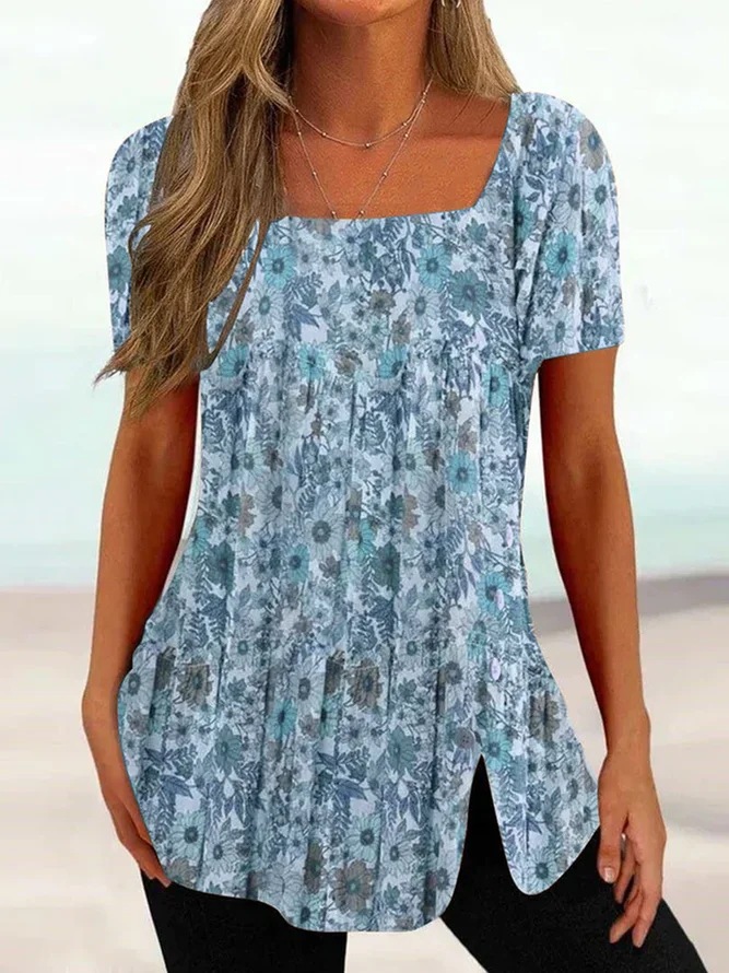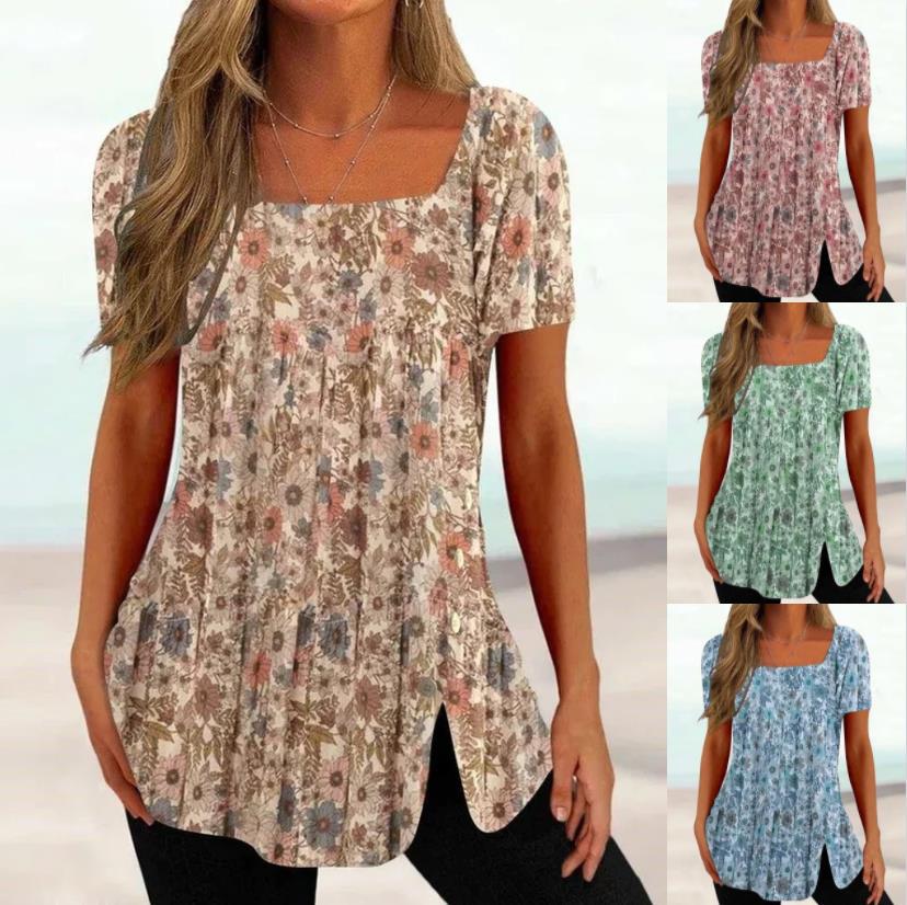 亚马逊独立站欧美女装2023夏季新款方领短袖碎花开叉T恤上衣女装