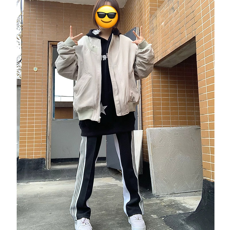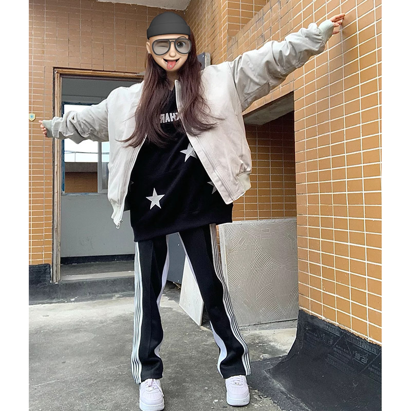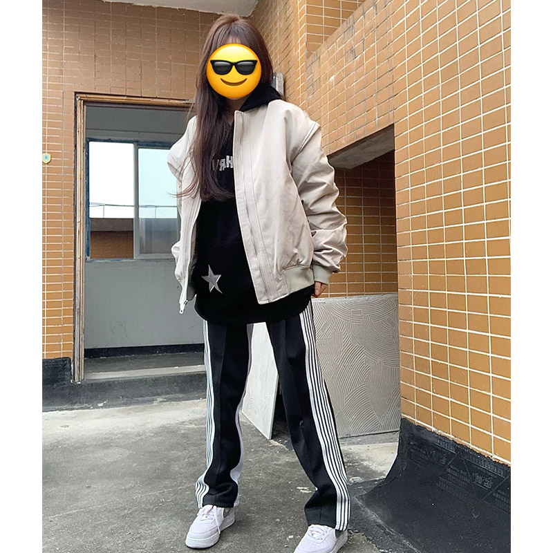 韓版運動闊腿褲女2023春秋新款寬鬆顯瘦高腰垂感拖地黑白多條紋褲