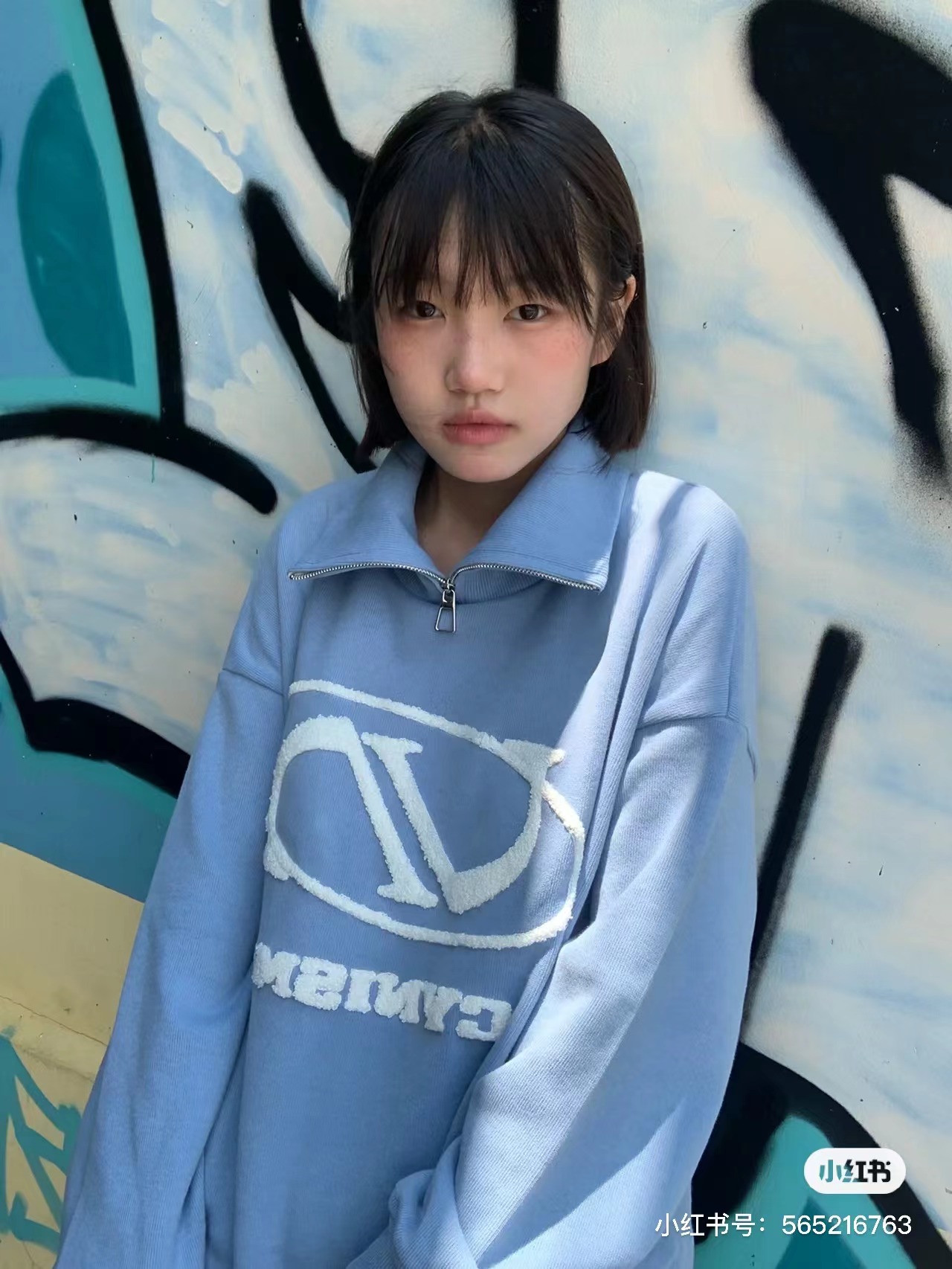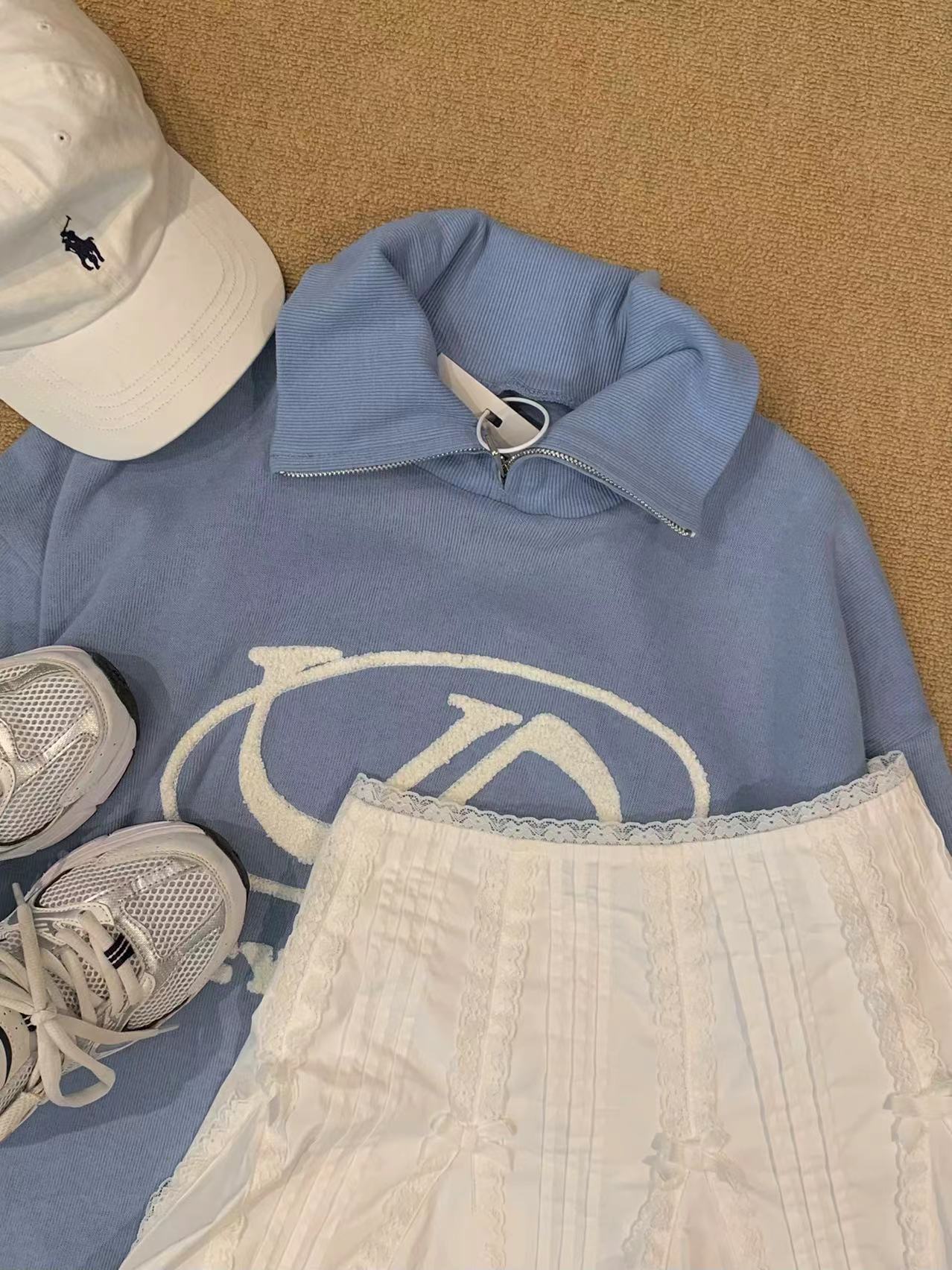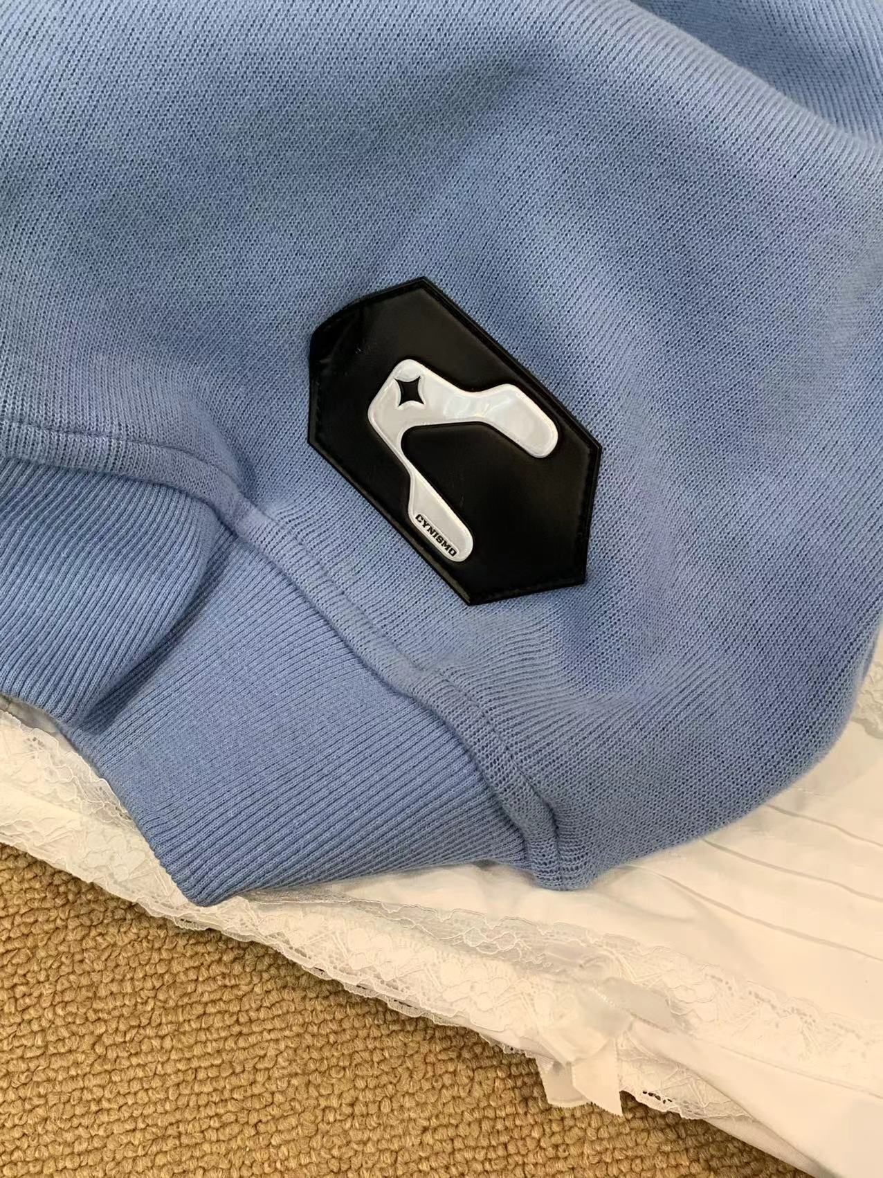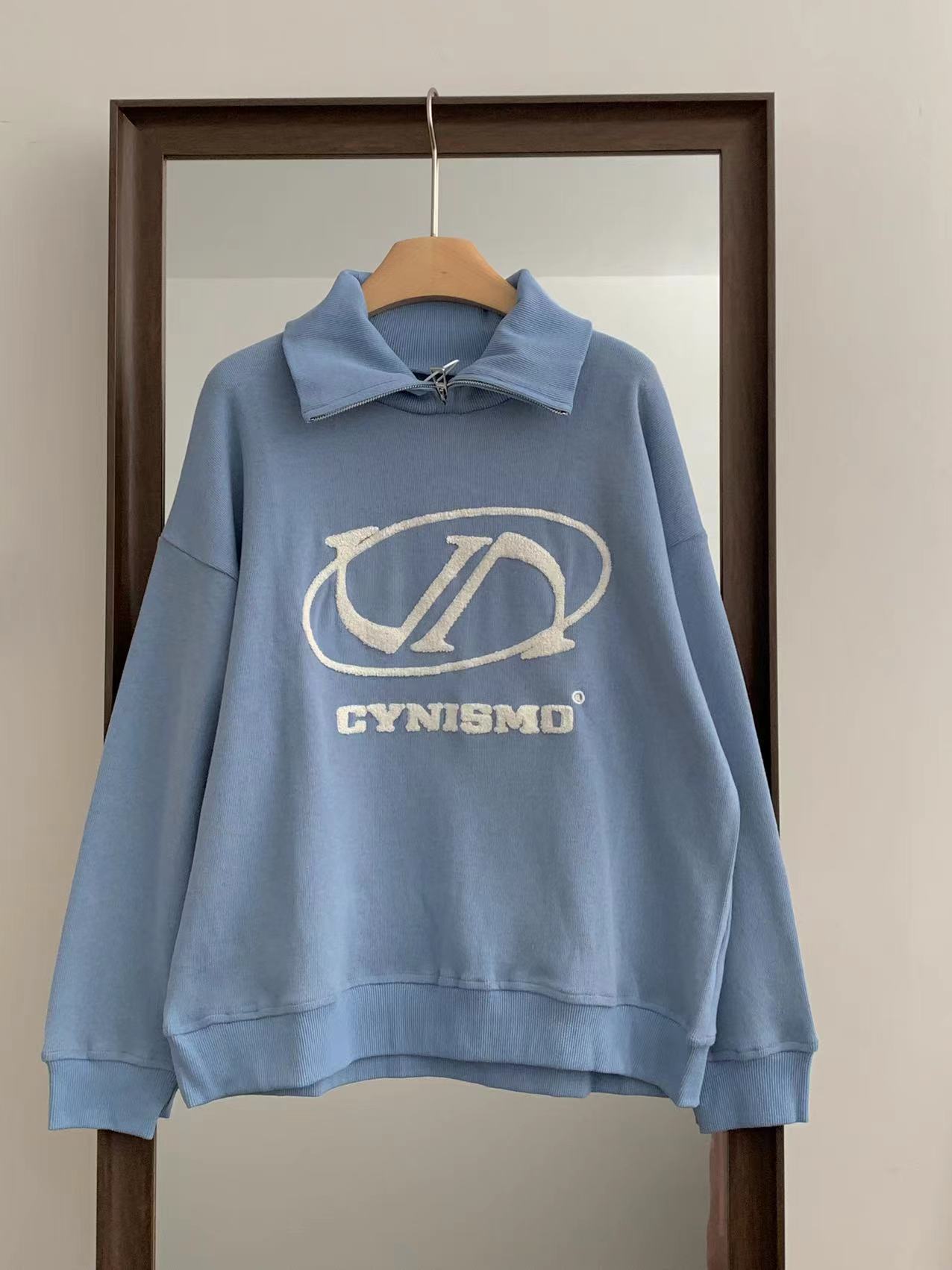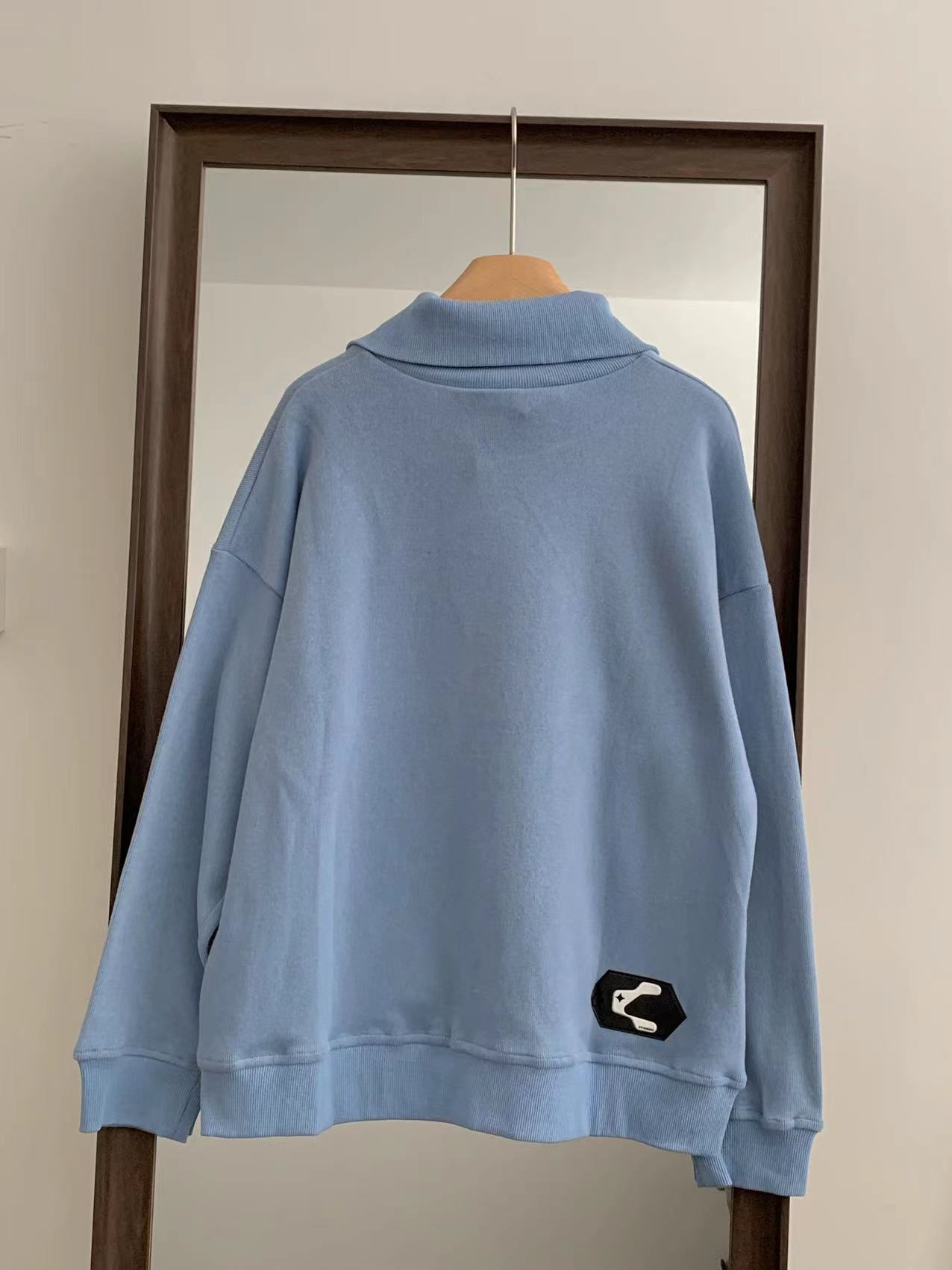 @Cy* 這個藍色好清新~甜美國潮拉鍊立領立體刺繡寬鬆套頭休閒上衣