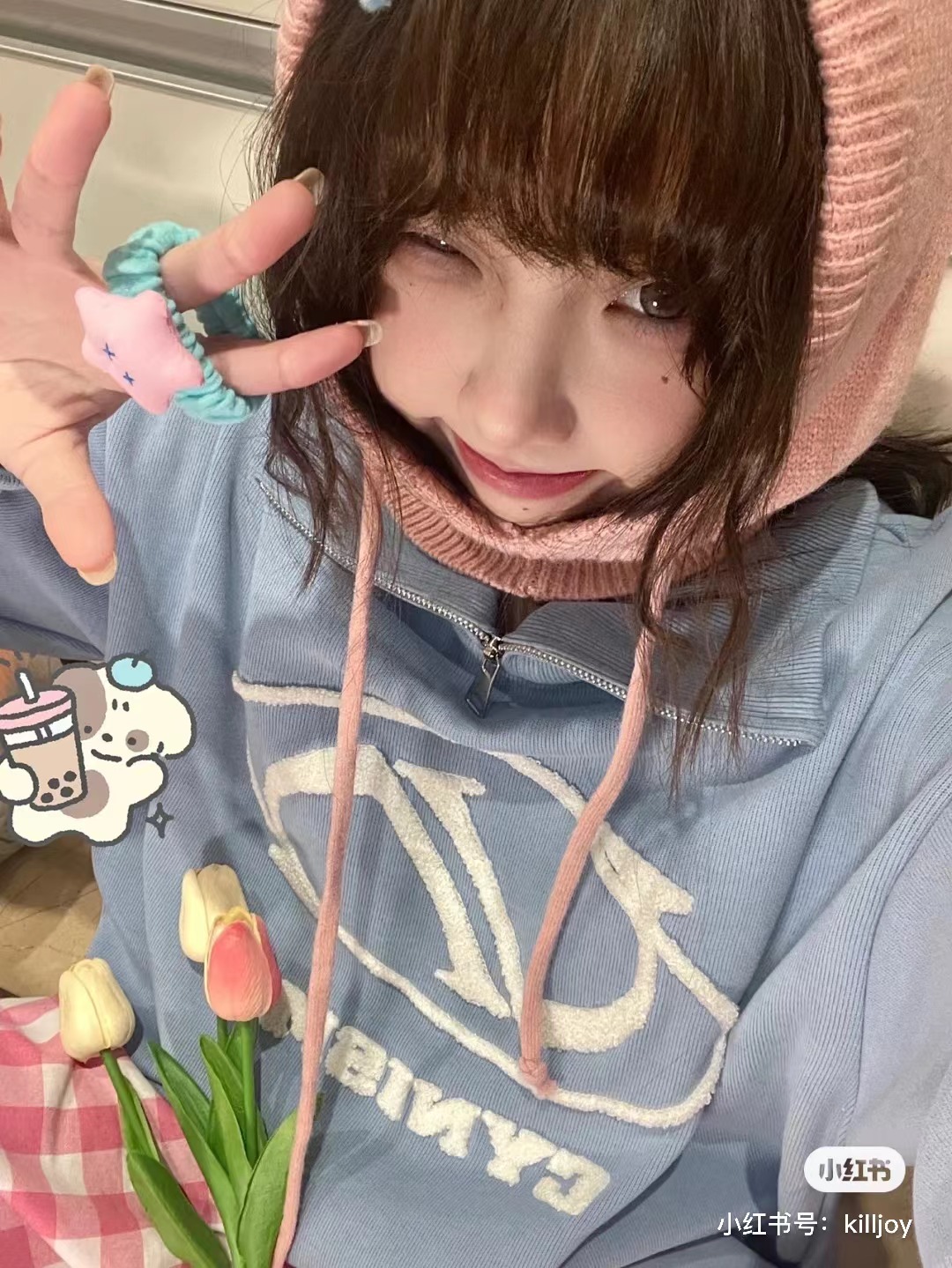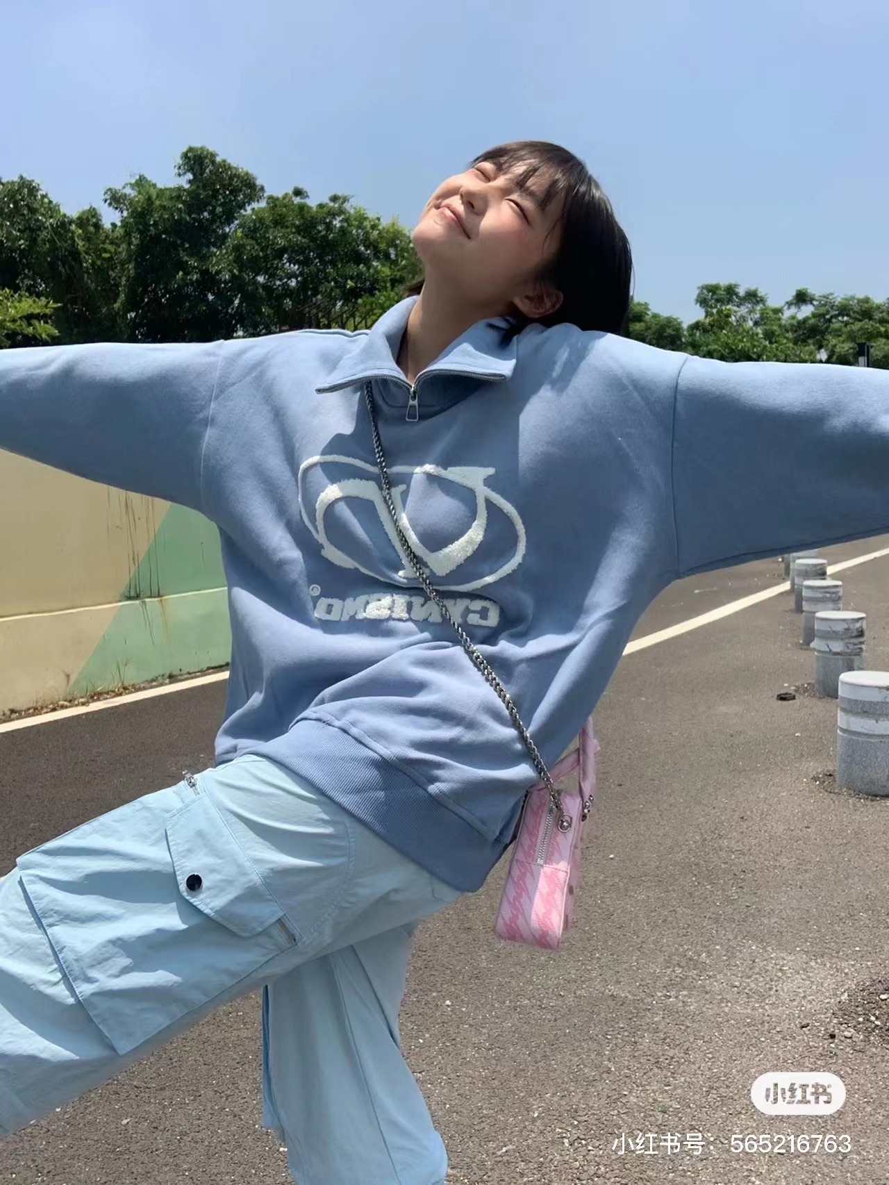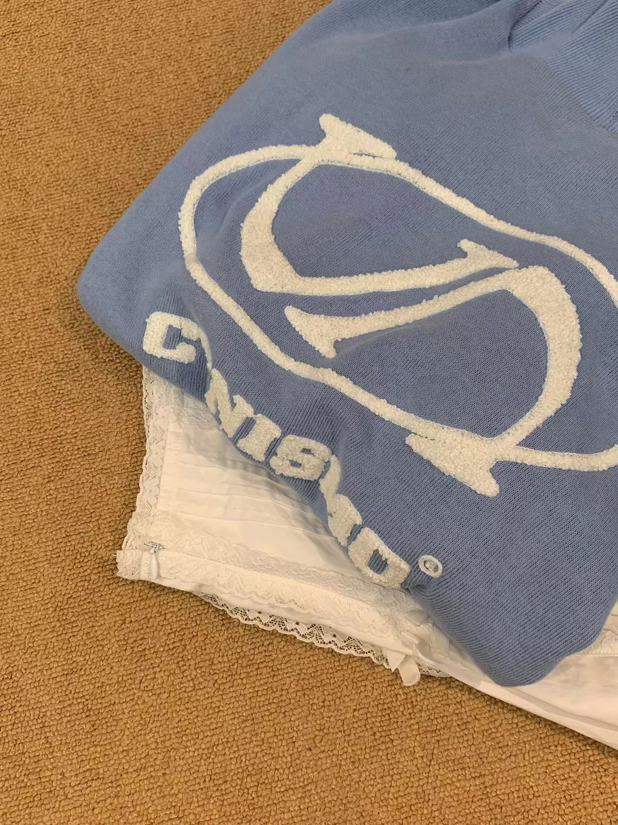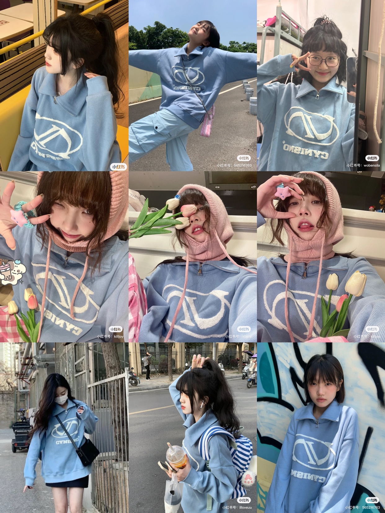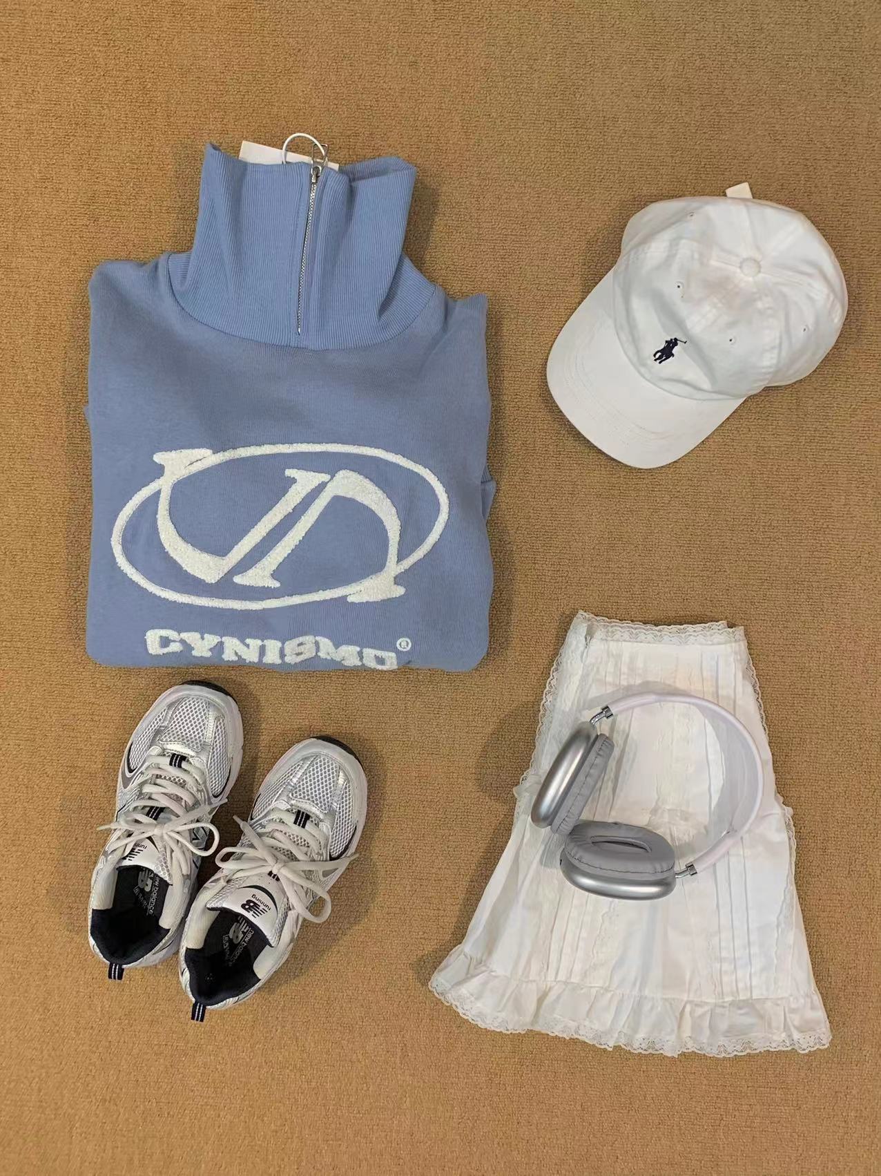 @Cy* 這個藍色好清新~甜美國潮拉鍊立領立體刺繡寬鬆套頭休閒上衣
