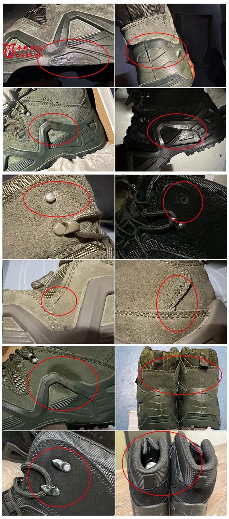 下面介绍下瑕疵特惠处理款情况,这个选项内的鞋,都是在前期销售过程中,在本店二次复检中挑出来的外观有瑕疵的鞋,这些鞋都是没有影响穿着的质量问题的,材质功能也都和全品鞋一样。主要有以下几个情况:1、由于生产设备原因中底注胶过程中注射不匀,使得边框出现形变、塌陷情况,而后工人手工补料注射打磨补色,使得外观表面出现比较明显的变形、变色、粗糙、胶痕等情况。2、压模时由于鞋楦压力不均导致左右脚鞋帮产生比较明显的高低差异。3、车线有不齐、跳线。面料衬料原残及车缝不齐。表面有较为明显污渍情况。基于本款的这个价格水平,这类不影响穿着质量的产品在工厂都是通过质检的,我们也是以全品的价格采购的,但是在本店对于质量有着更高的要求,因此战术鞋发货前每双都是要进行复检,这类明显影响外观的产品都会被挑出,不能作为全品出售,只能优惠处理。目的是为了让大家拥有更好的购物体验。下面图中,是我们挑选出来的比较严重、比较明显问题的照片实拍,大家可以看一下。这是比较不好的状态,多数情况下没有这么严重。鞋本身没有影响穿着的质量问题,上脚之后不特别注意看不出来,脏了就更不明显了。可以便宜几十块,比较划算。请大家注意,优惠处理产品,随机发出,无法挑选,售出后非影响正常穿着的质量问题不退不换(在没有穿着痕迹的情况下,穿着尺码不合适换号除外),介意的朋友勿拍,请选择全价款,拍下即认可本情况,请周知。