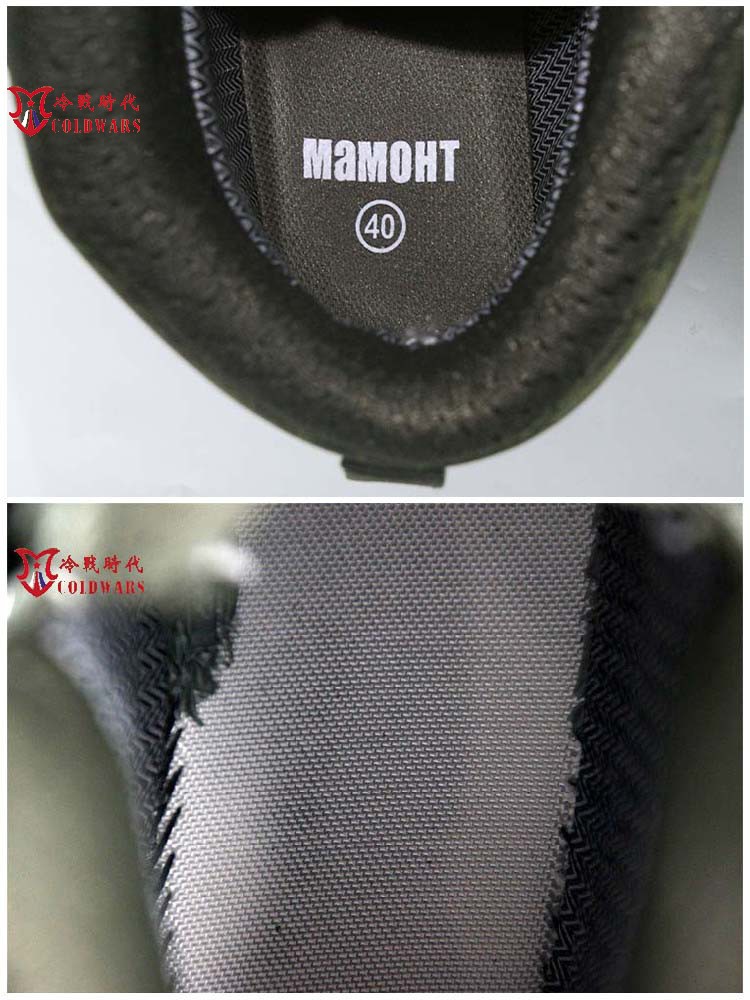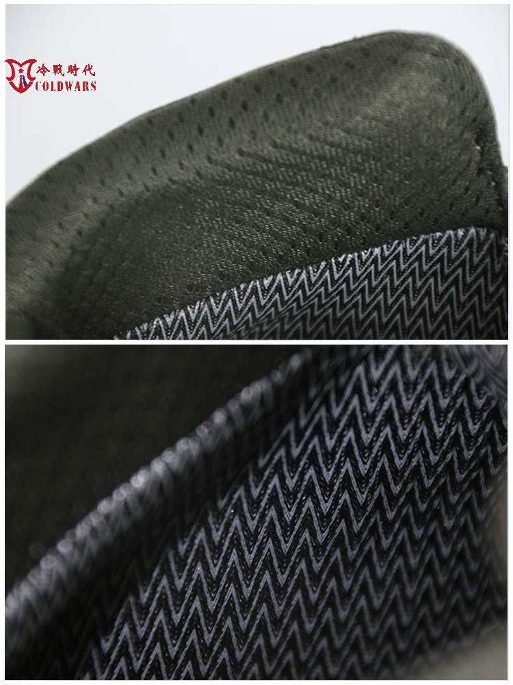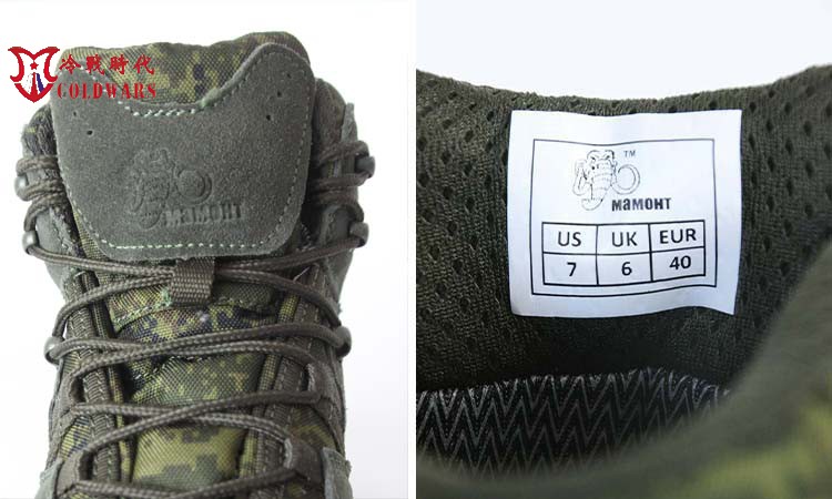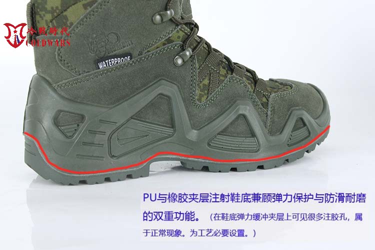 先看看细节,做工抗的住微距拍摄,还是很不错的。系鞋带的快开金属挂钩是与鞋同色系喷漆的,不是电镀的,保证了整体一致性,细节处理。皮质是牛二绒的,质量可以,里面衬料是600D的牛津布。注意,所谓GTX防水膜,这种价位是不可能有的。EMR迷彩面料是带优力胶涂层的本身是防泼的,单色面料是不带涂层不防泼的。掌柜实测,这鞋踩个水坑啥的没问题。因此,在防水方面不要过高期待,和一般运动鞋差不多。但同时优点是要比市面上所谓防泼水的那些用PVC涂层牛津布的更透气点。实际上防泼防水的问题,在网上买瓶防水喷雾,时常喷喷基本也就日常够用了,毕竟此款定位是多用途特种作战靴,不是野战靴,没人天天拿他当雨鞋用。连体式的鞋舌头,可以有效防止沙尘灌入。鞋舌正面有压印LOGO,反面有尺码标。鞋码是欧码的,掌柜试了比较准。按国外产阿迪耐克之类的EU/EUR码选即可。比标准国码大个一码大概,但是这个不精确,最好还是按欧码选。下面开始说干货,这个鞋可圈可点的地方在于其鞋底,这个底材用料和工艺水平,在我们选品时候经过横向比较应该说是相当可以的。图里红线上面是PU,软质的具备弹力,同时采用外部支撑骨架设计,能形成整体缓冲,传导在鞋里面,穿着比较舒适。红线下面是耐磨橡胶,提供不错的耐磨性和摩擦力。同时,从鞋帮上的圆形注射孔可以看出其注胶的一体成型工艺,结实耐用。鞋头和后跟均有塑性材质上返加固保护。鞋侧面带有压印LOGO橡胶大底花纹内衬材质,采用透气网眼织物和内衬。比较有意思的是下面图里这种银色闪电格内衬材料与俄军公发的VKBO冬靴的内衬面料一致,不知道VKBO系统是否也采购了国内的原料。鞋垫为保利优材质3D立体成型的,脚感不错。鞋垫下面的中底垫层是防刺穿材料的,不知道是不是芳纶的,感觉很像,但是不确定。不过防刺性能很好。可划可扎,没有问题。