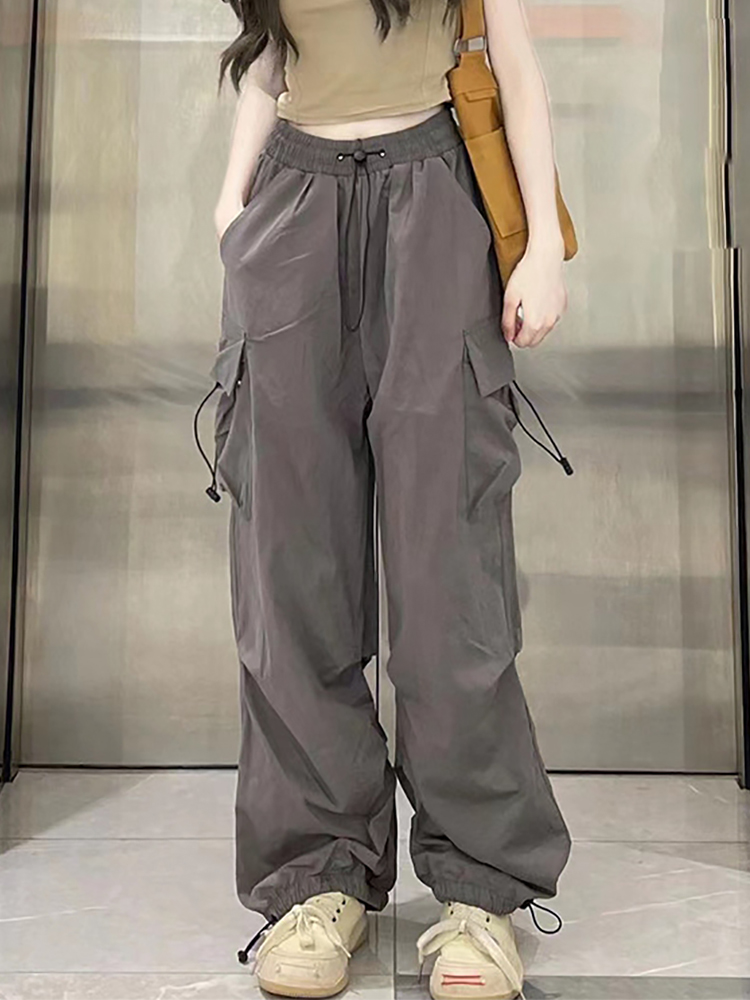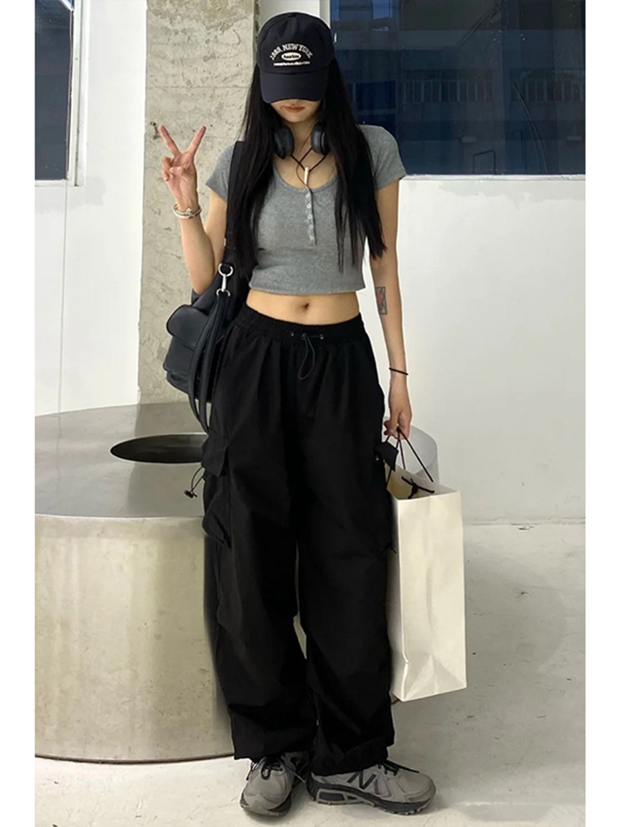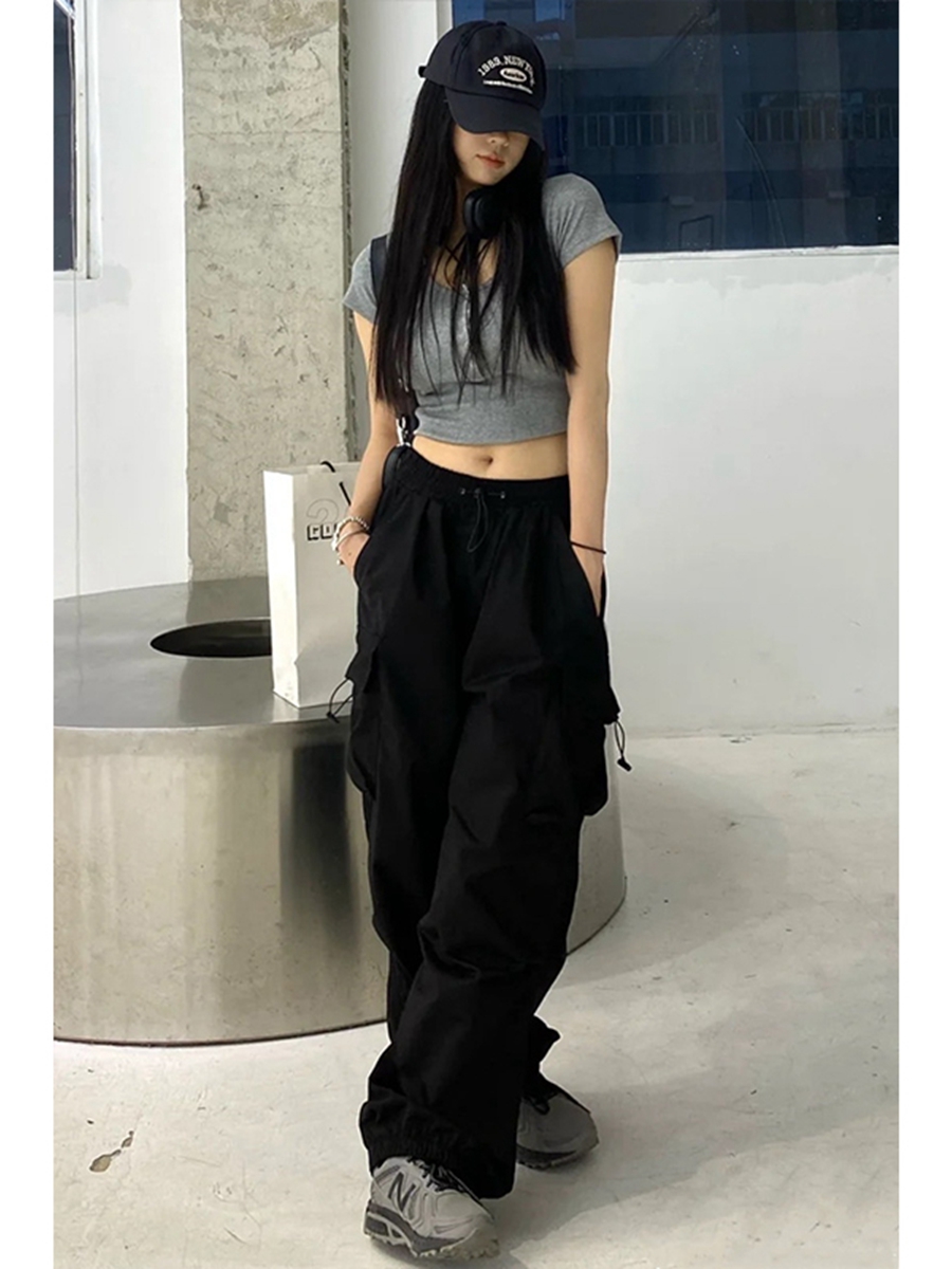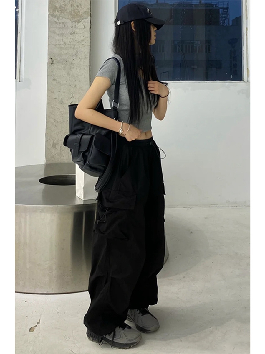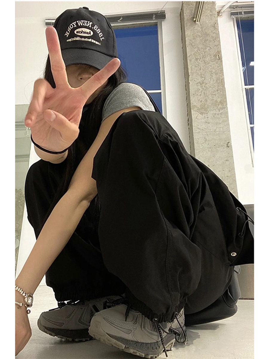 美式復古黑色闊腿工裝褲女大尺碼胖mm高腰寬鬆直筒抽繩束腳休閒褲子