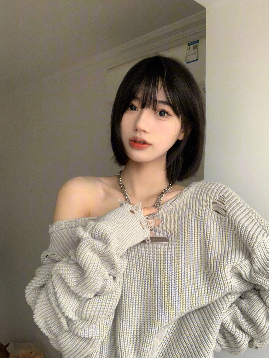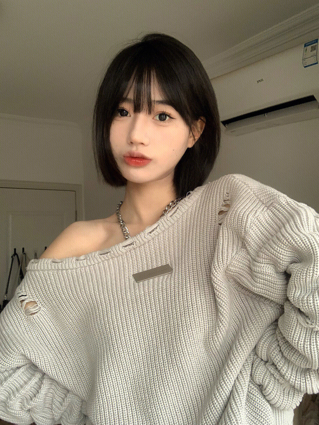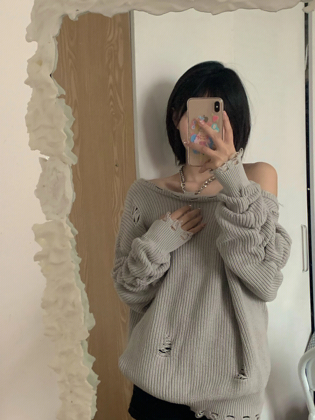 美式慵懶chic設計感炸街灰色露肩毛衣女秋冬寬鬆外穿2022新款爆款