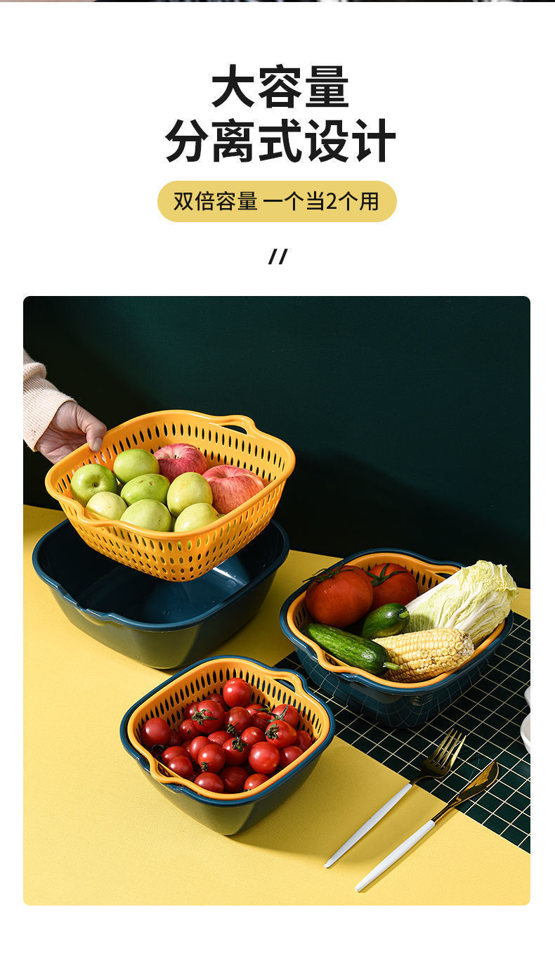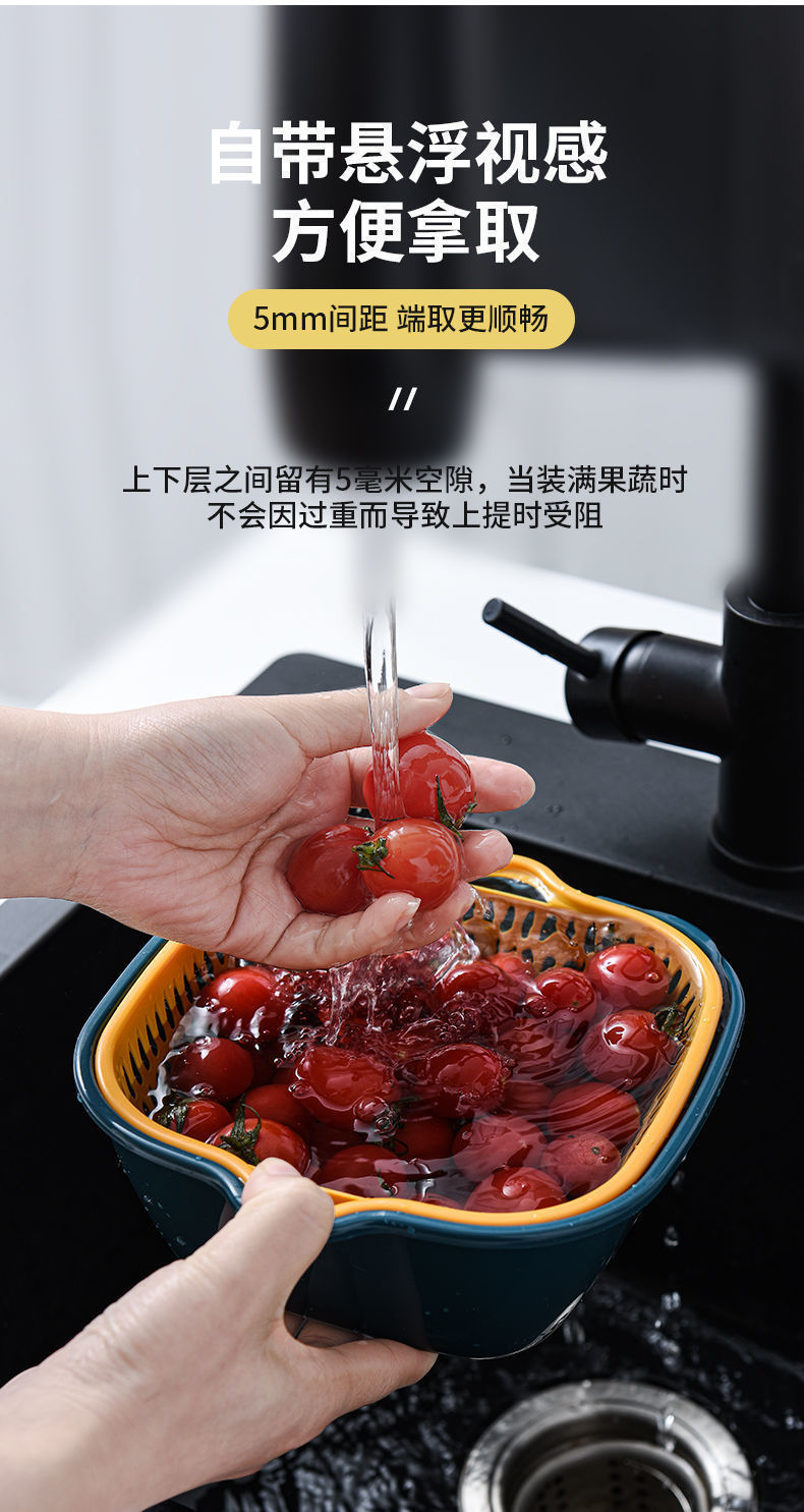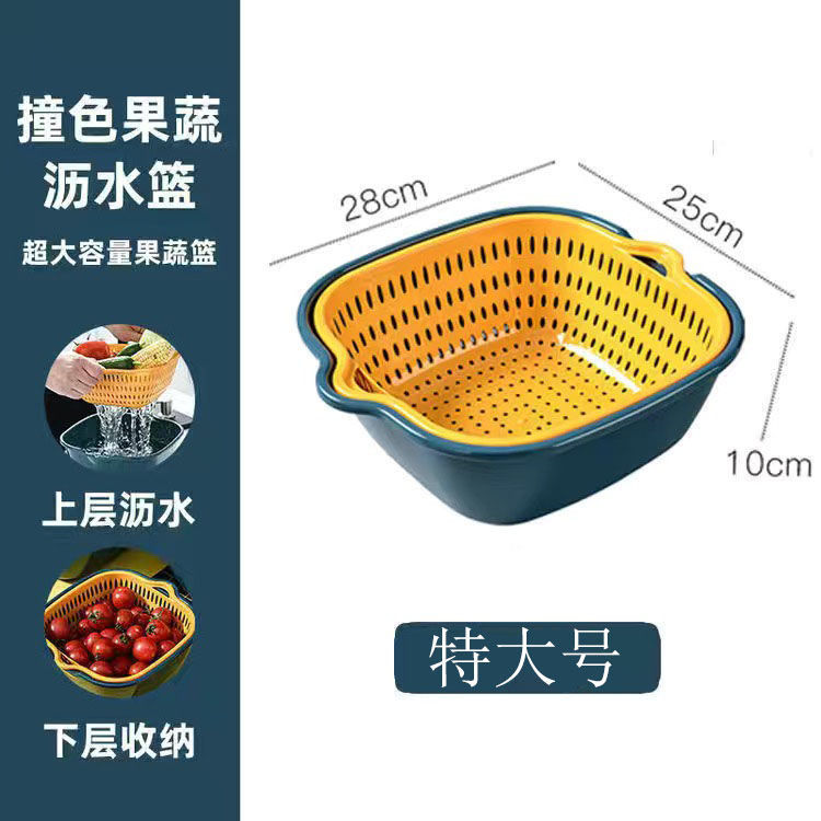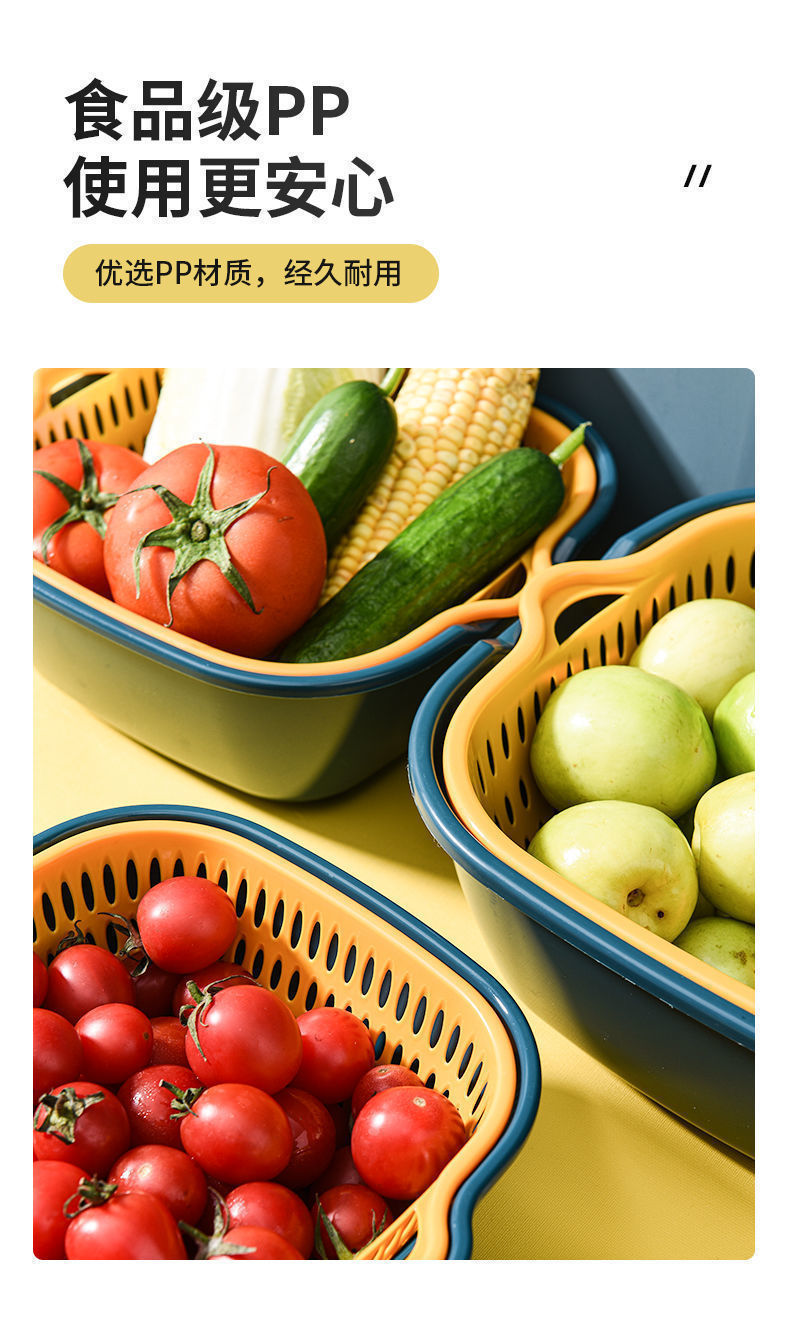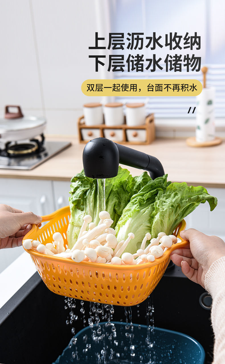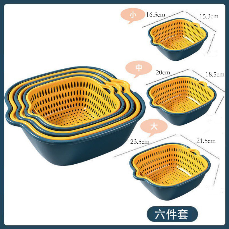 加厚双层沥水篮六件套塑料洗菜篮洗菜盆家用厨房洗菜框洗水果蓝