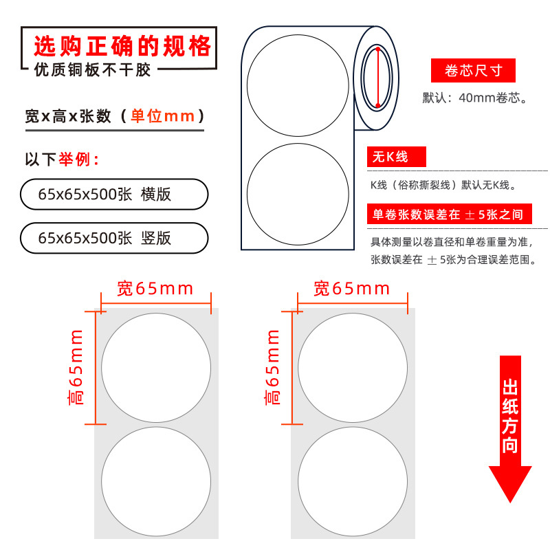 热卖现货圆标65mm铜板不干胶标签贴纸圆形封口贴纸65*65*500张/卷