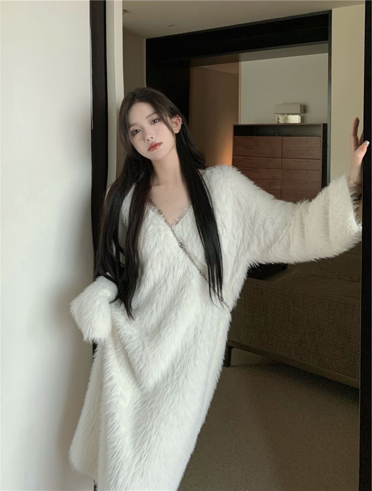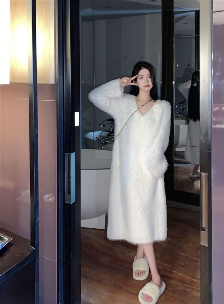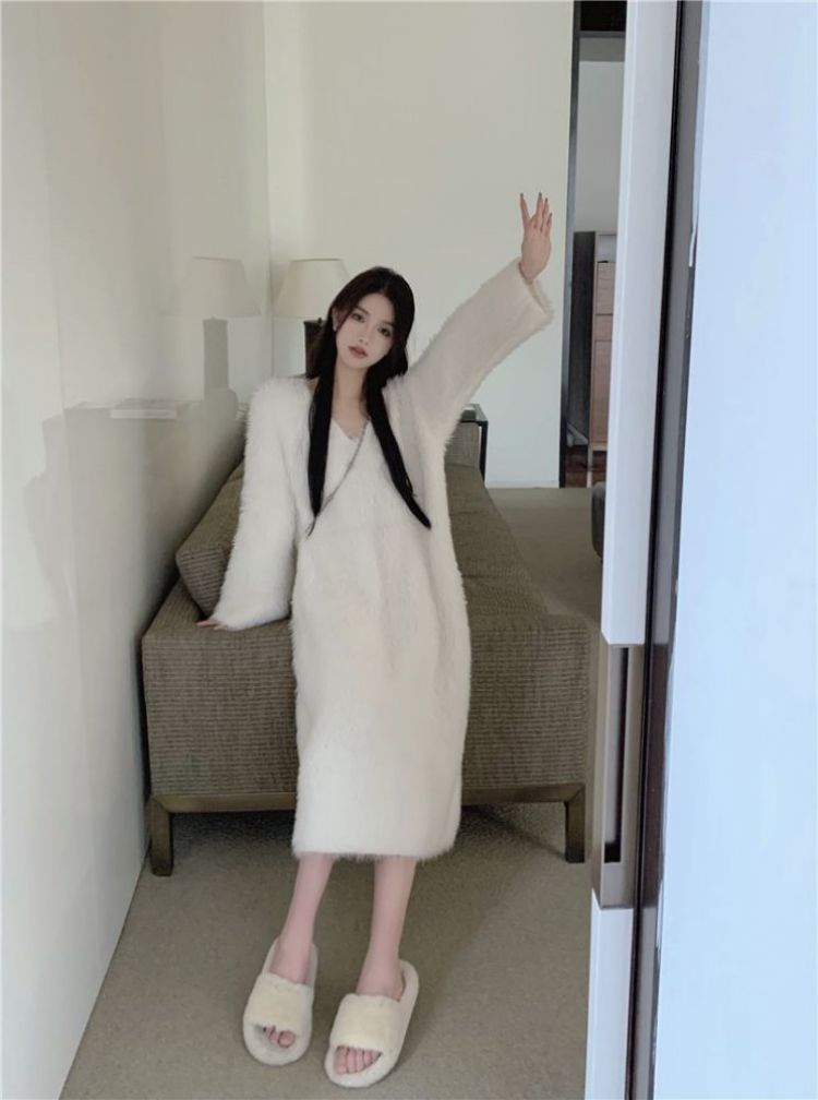白色水貂絨馬海毛毛衣針織洋裝女秋季2023新款溫柔風寬鬆長裙子