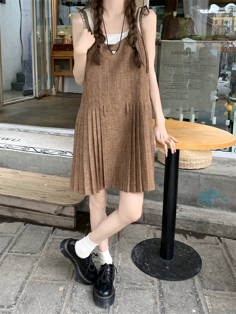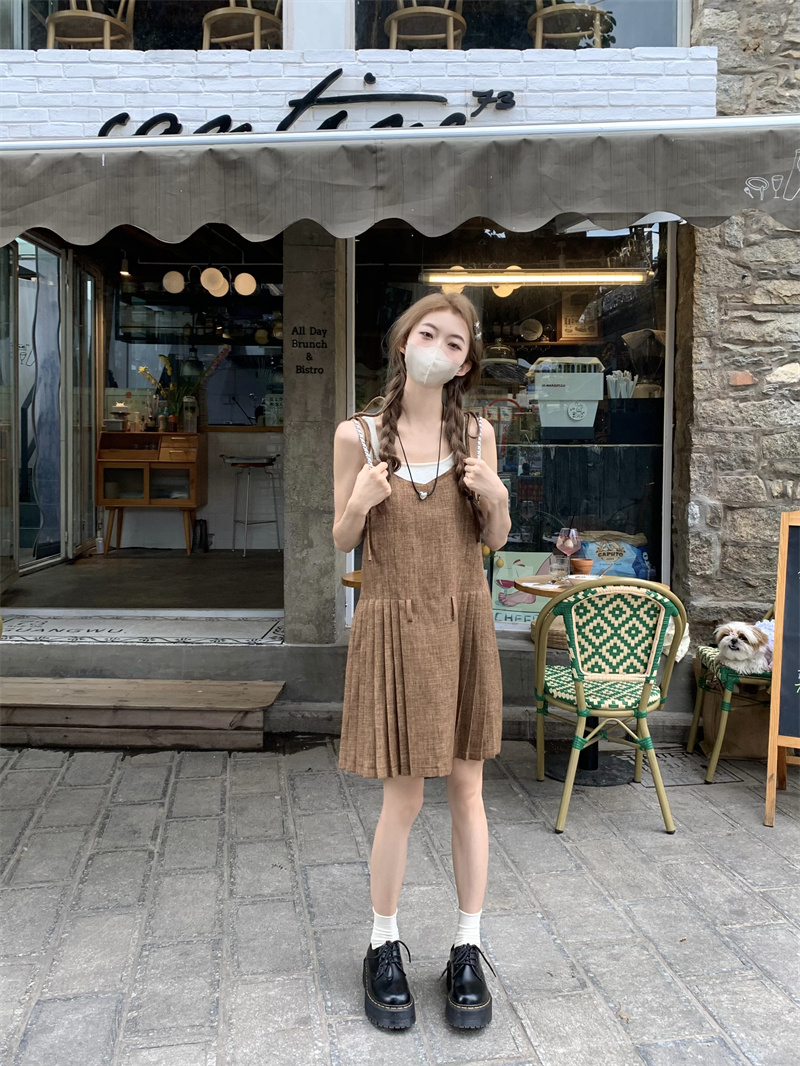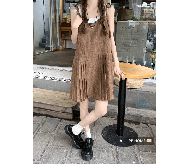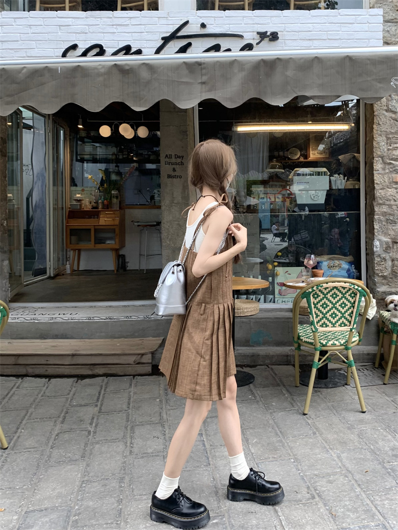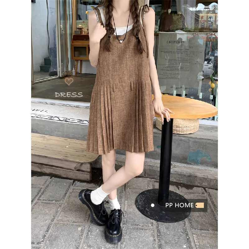 PPHOME中古巴黎~新款潮韓版夏日法式別致慵懶風格紋無袖吊帶長裙