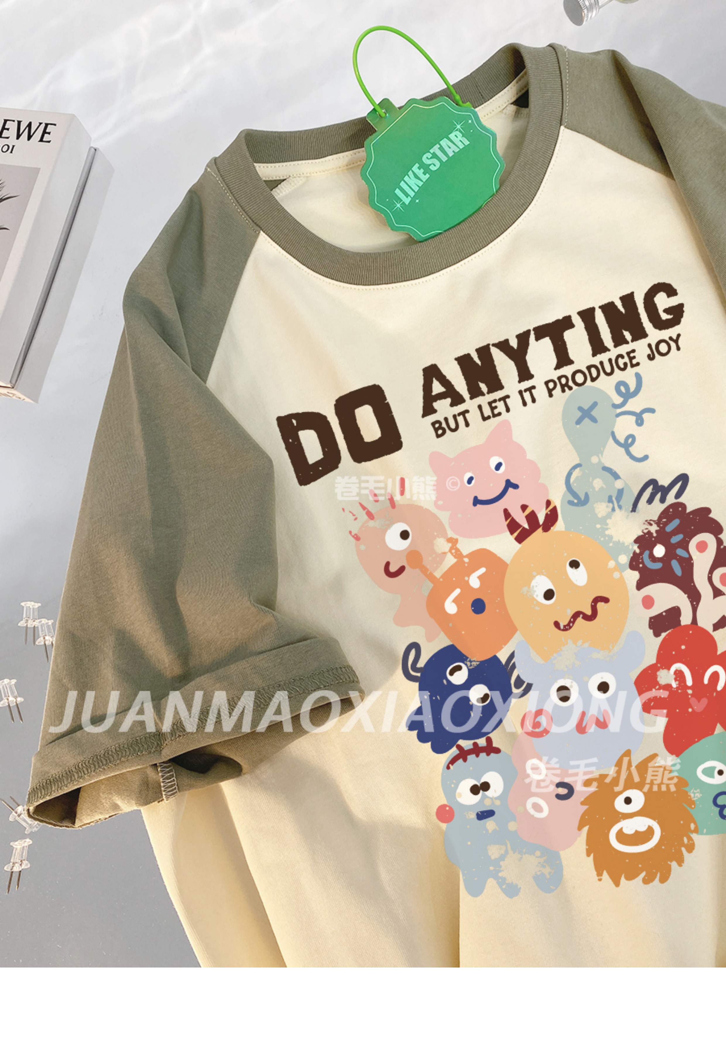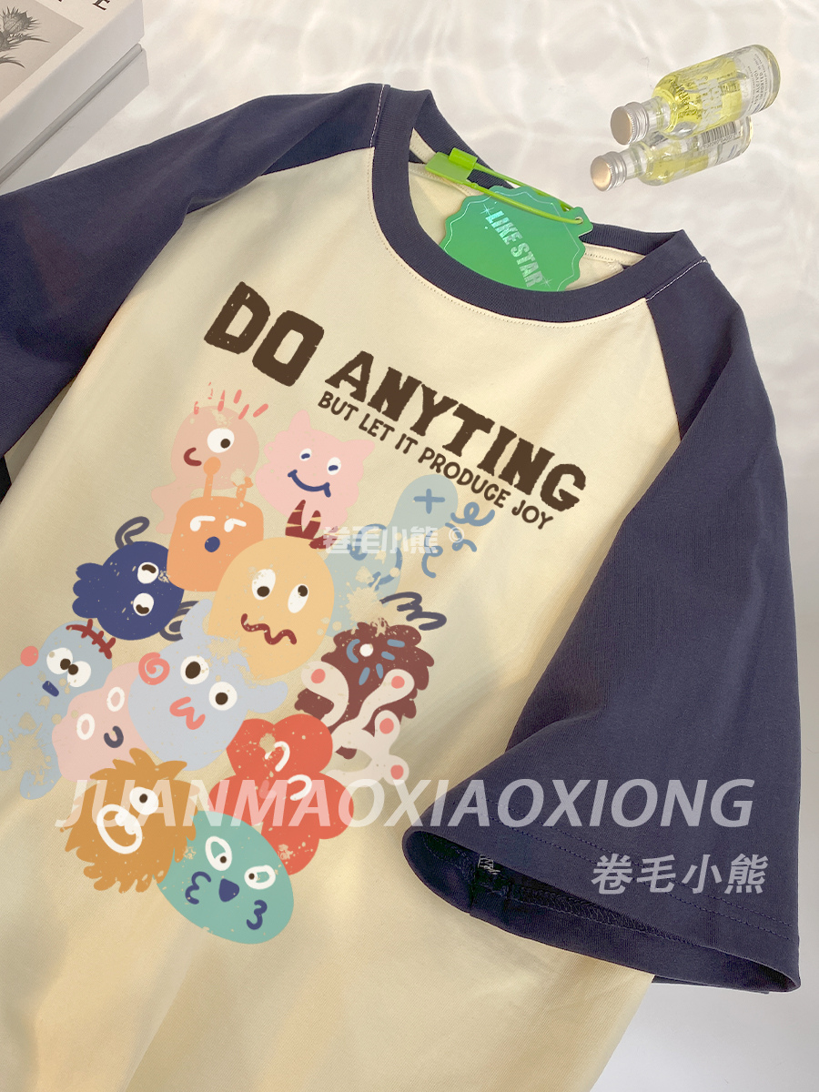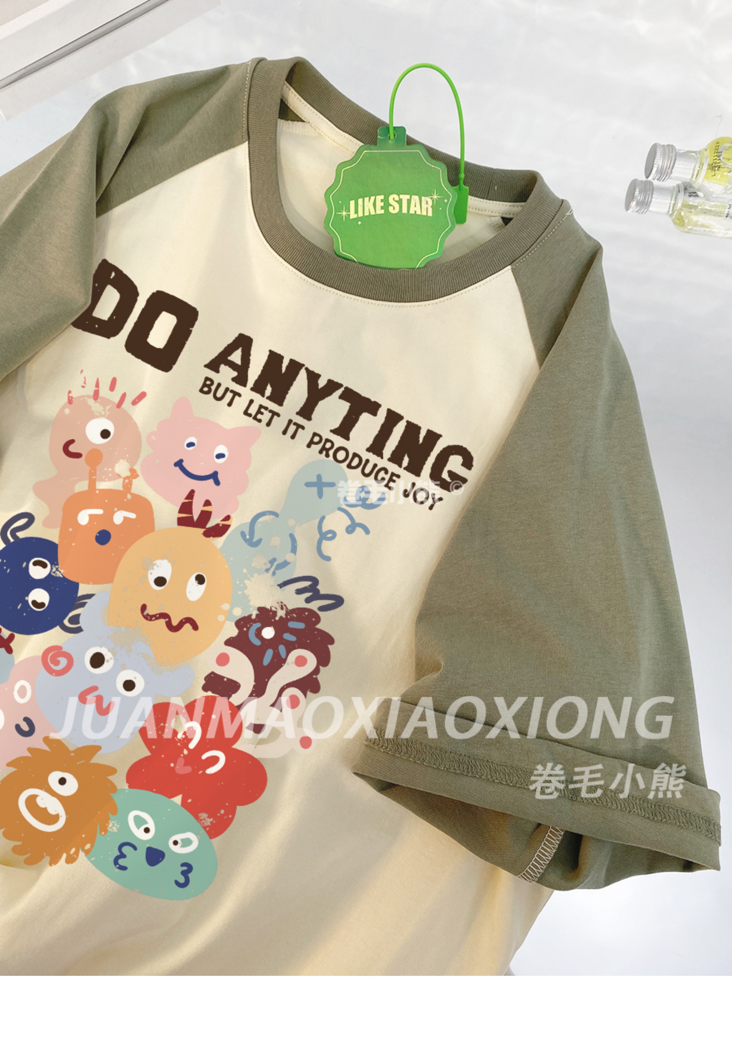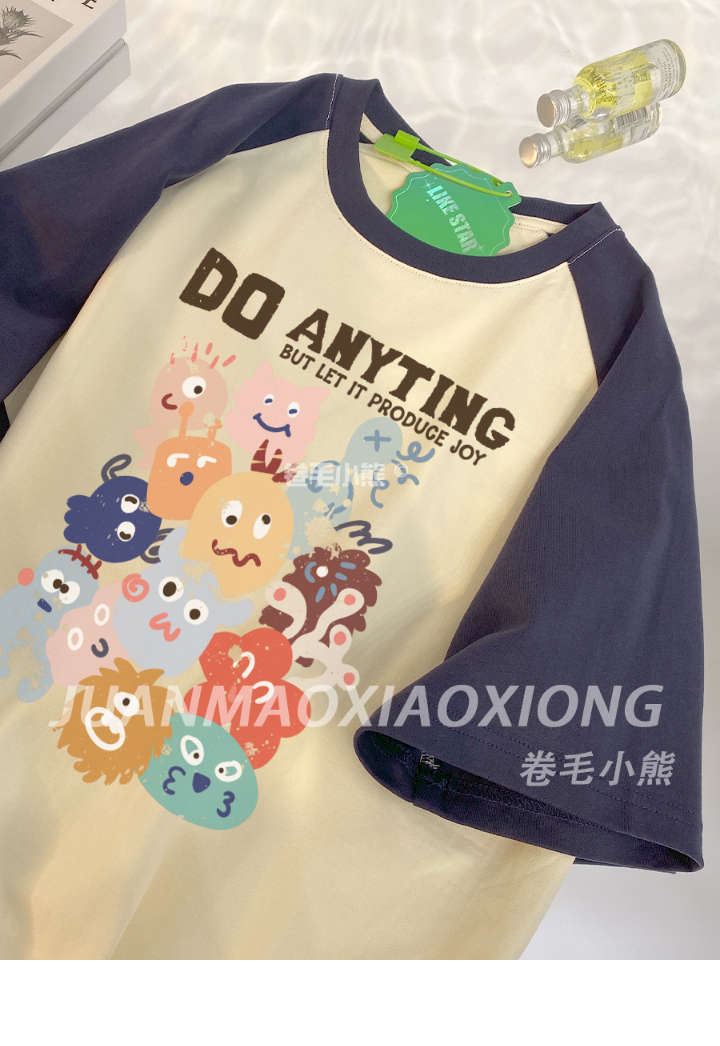 mon-ster拼接撞色插肩短袖印花T恤夏季美式純棉寬鬆情侶T五分袖
