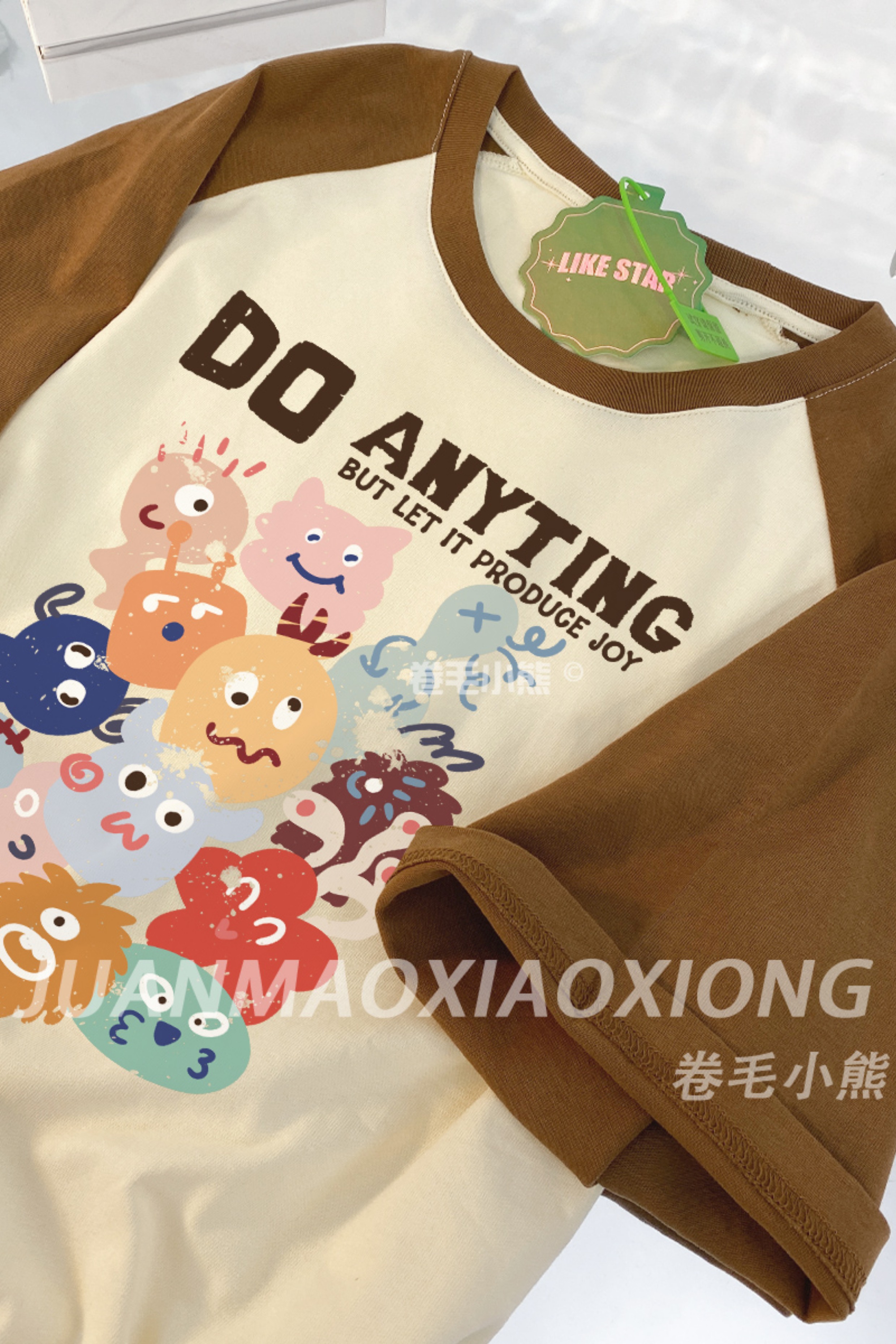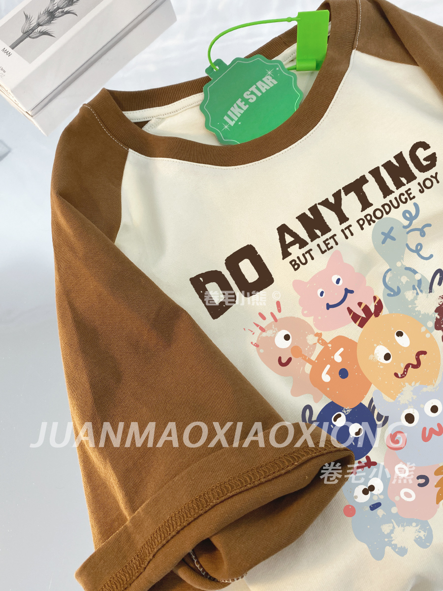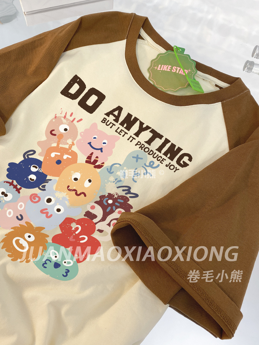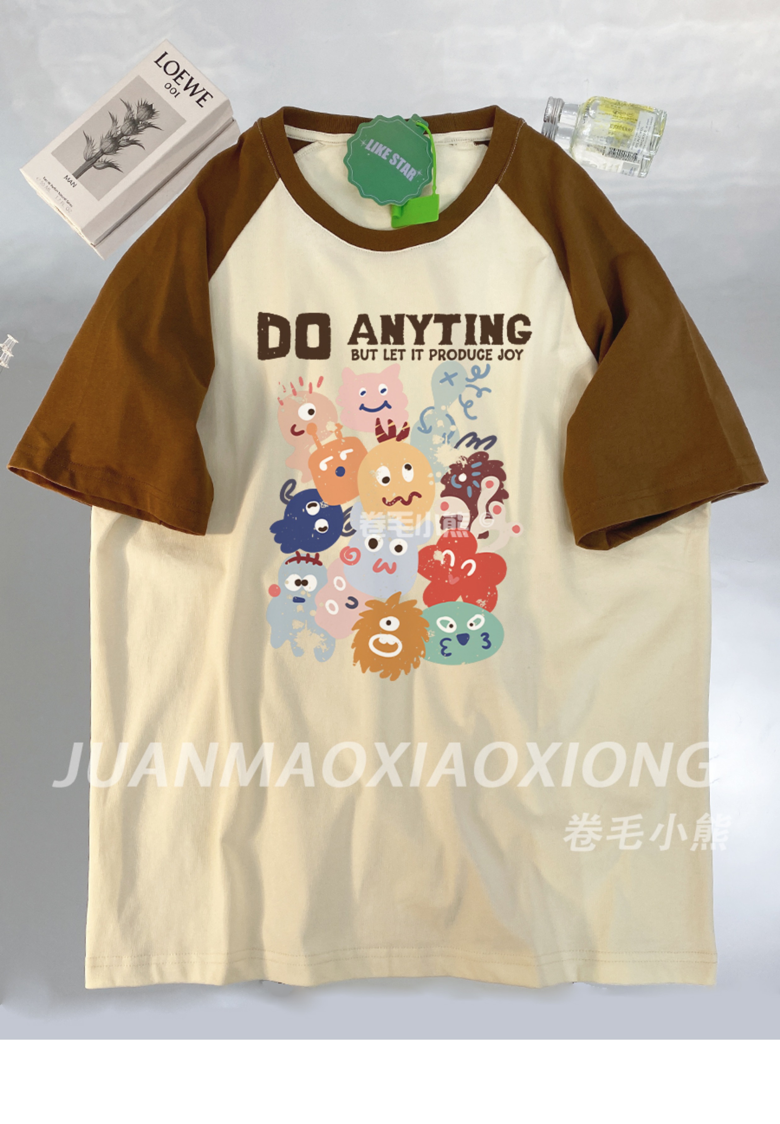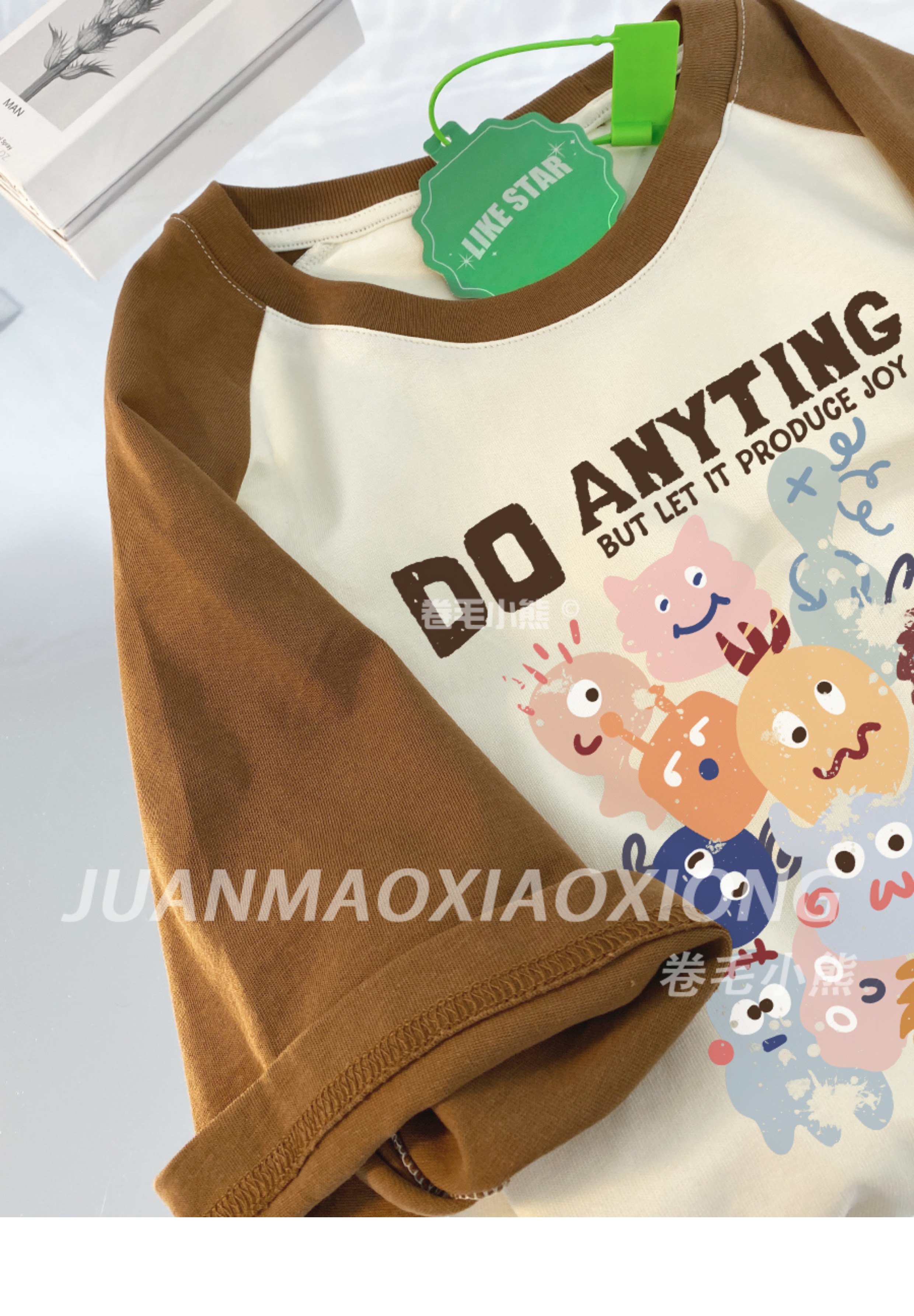 mon-ster拼接撞色插肩短袖印花T恤夏季美式純棉寬鬆情侶T五分袖