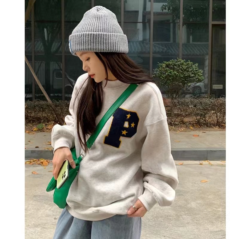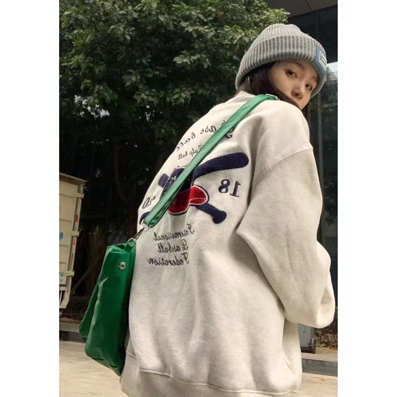 春秋薄款美式復古oversize圓領厚棉T女秋冬季加絨潮牌vintage上衣