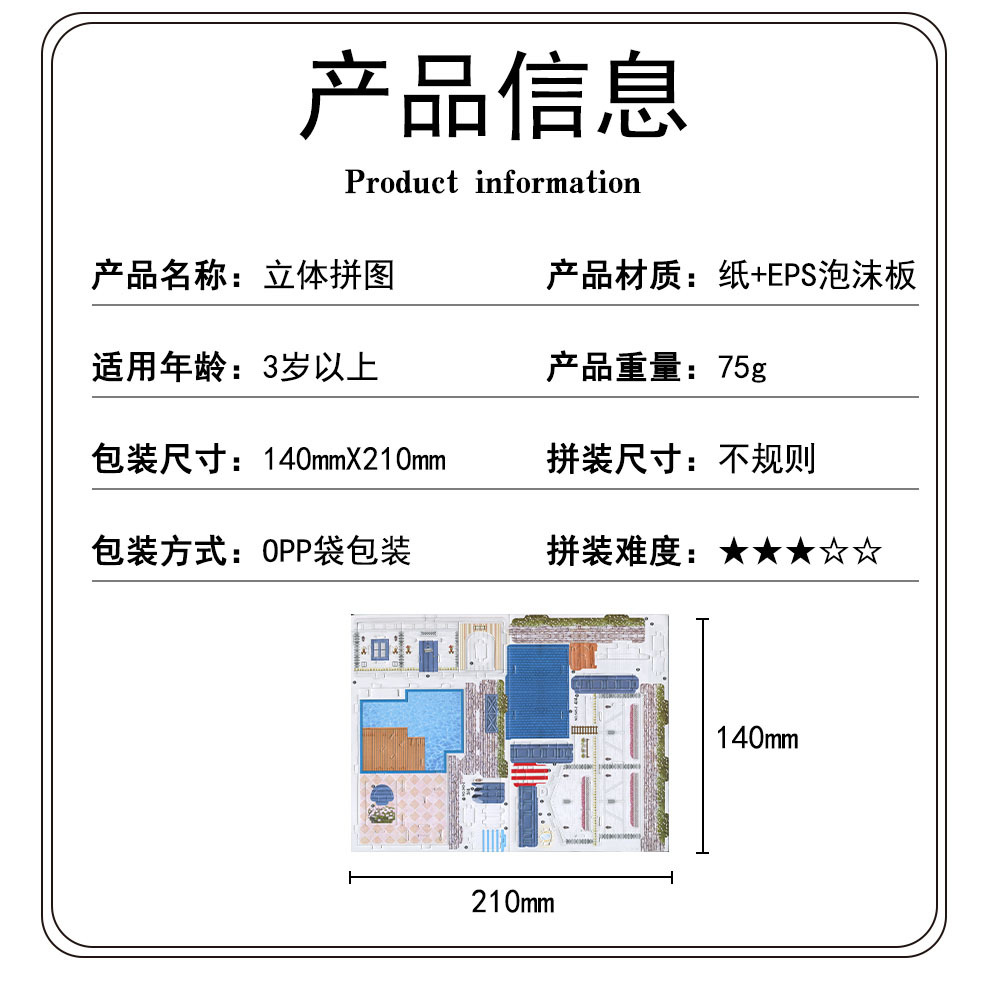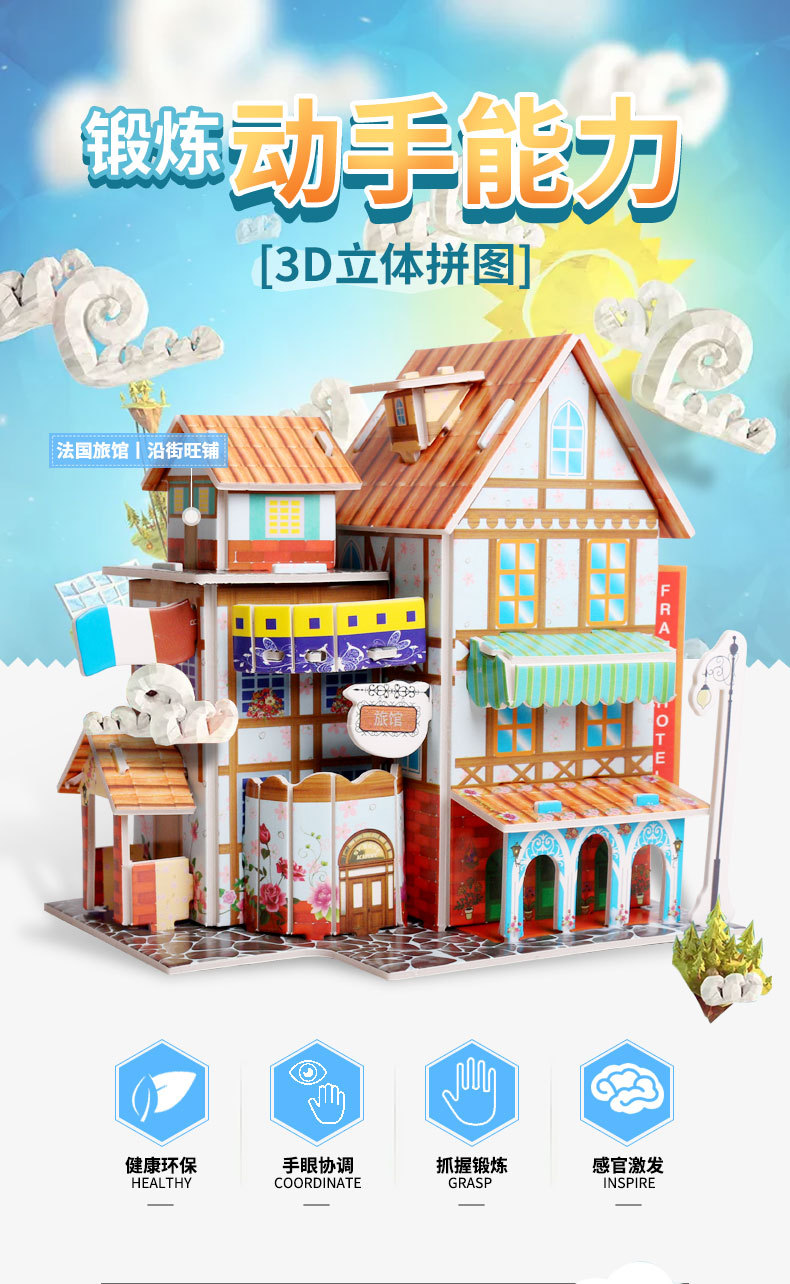 简介       立体拼图,是经典平面拼图玩具发展的进化再生。它的出现,不仅为生活增添了多样的乐趣,更是将在拼图娱乐中锻炼的平面化思维转向了立体化思维体验,拼装过程趣味性十足,快乐的成就感让人津津乐道。         拼图玩具是一种集娱乐、知识、欣赏于一体的DIY玩具。         无论是快乐的休闲小趣,还是幸福的美好纪念,立体拼图摆在家中不仅为家居装饰增添艺术的美化效果,提升品位格调,更是用双手创造精彩生活的美好记忆。