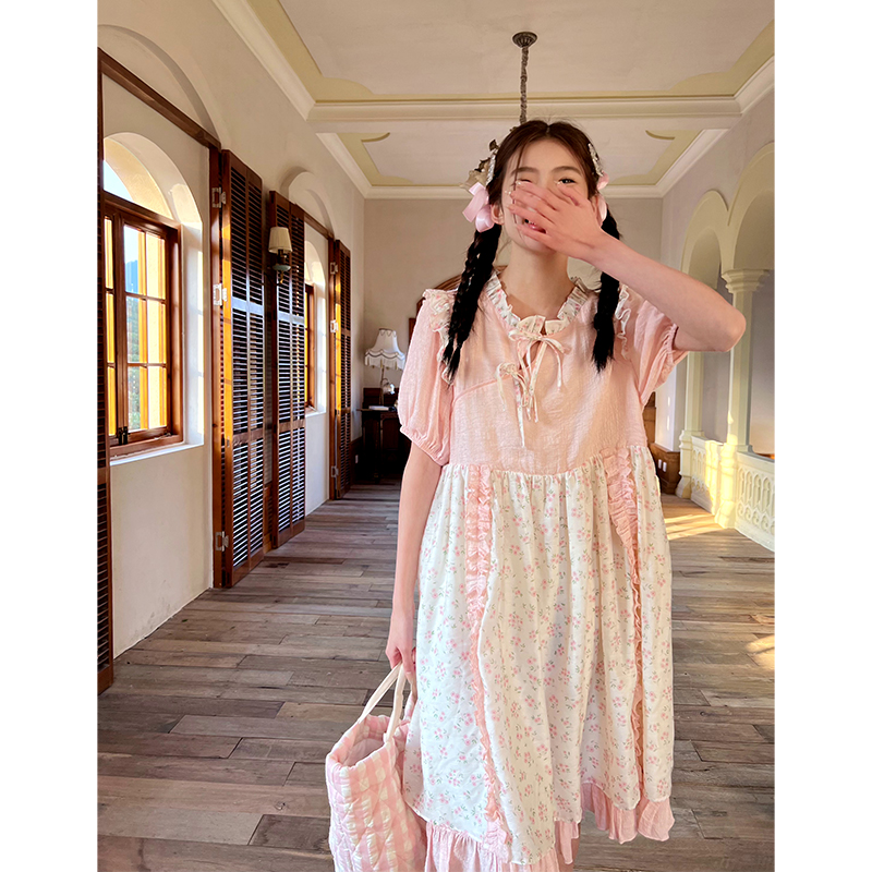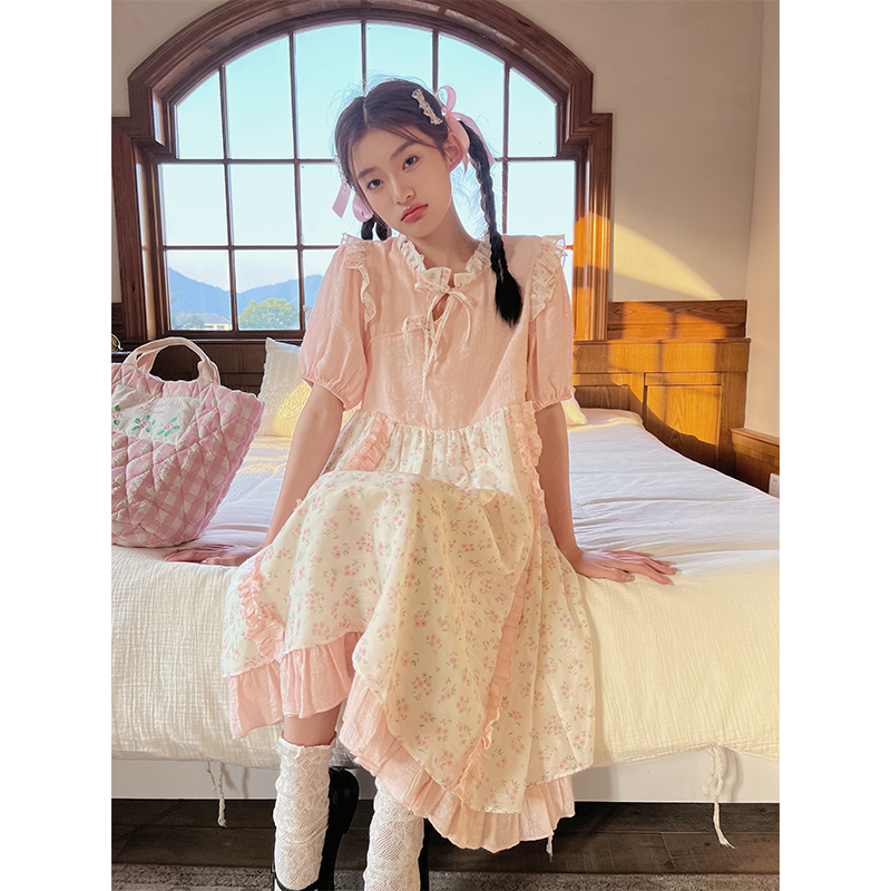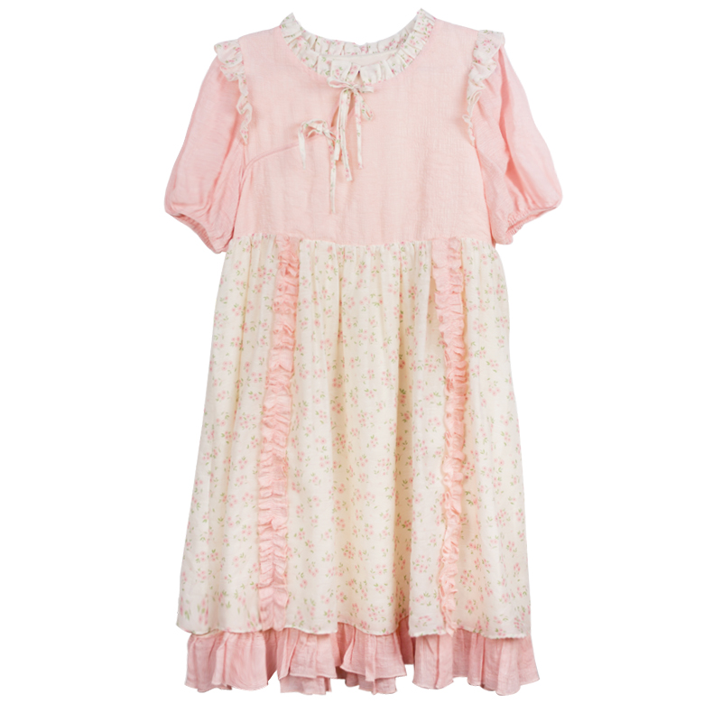 裙身对称花边装饰,底摆拼接花边,与碎花相映成趣,涤棉面料,坚牢耐磨,不易起皱。