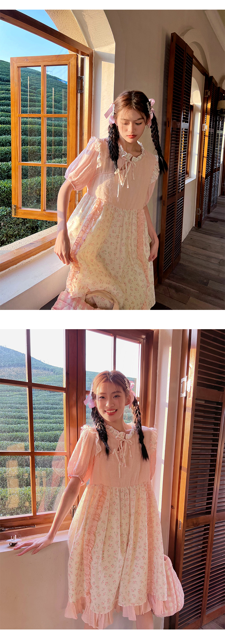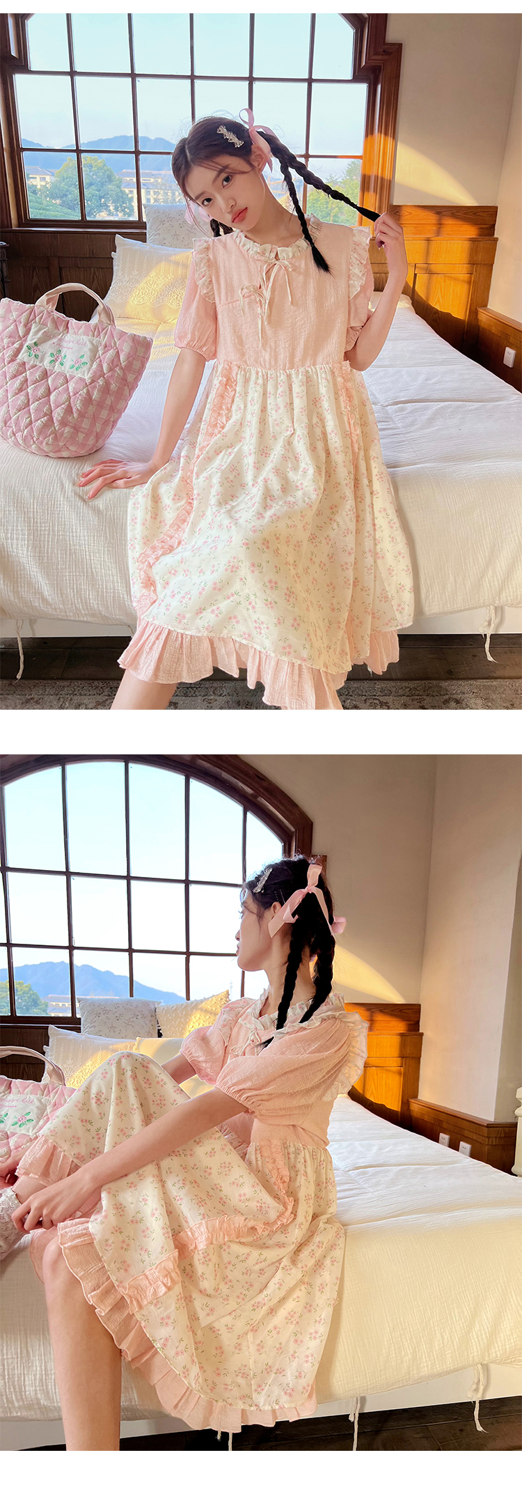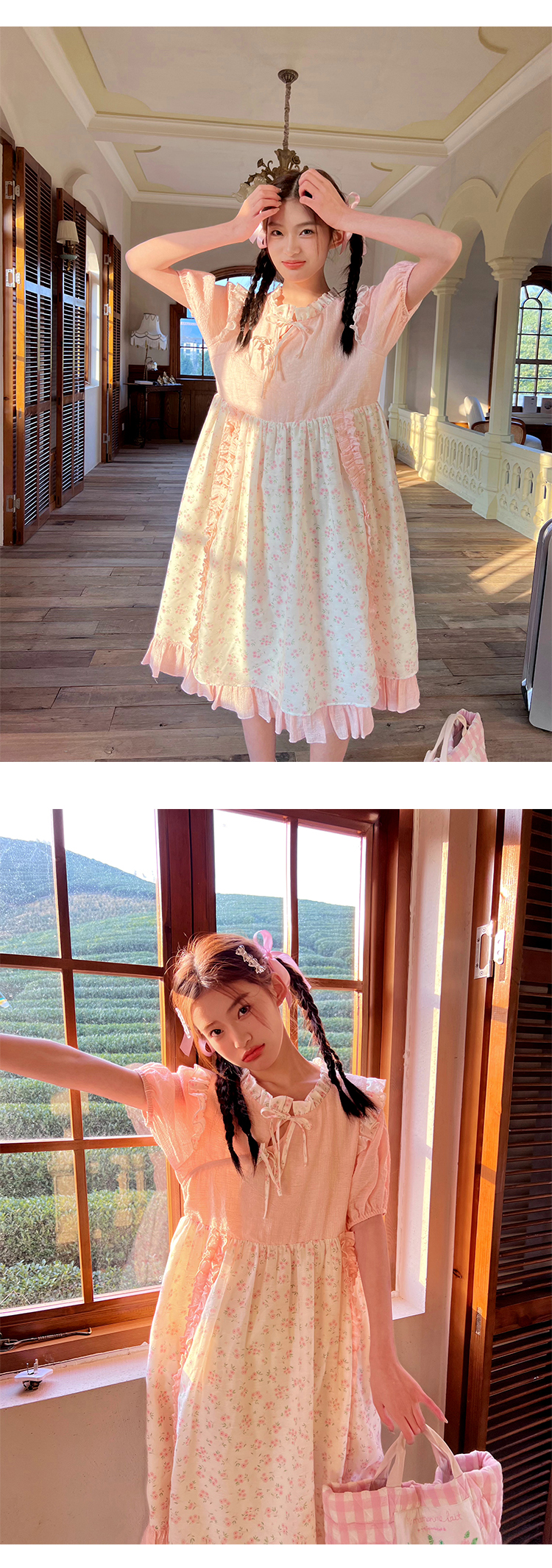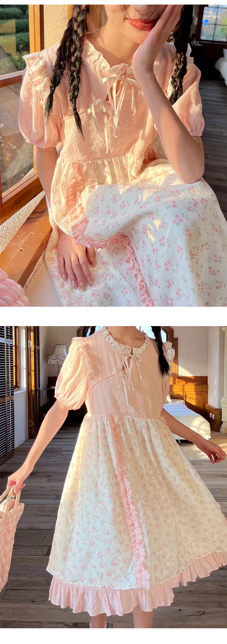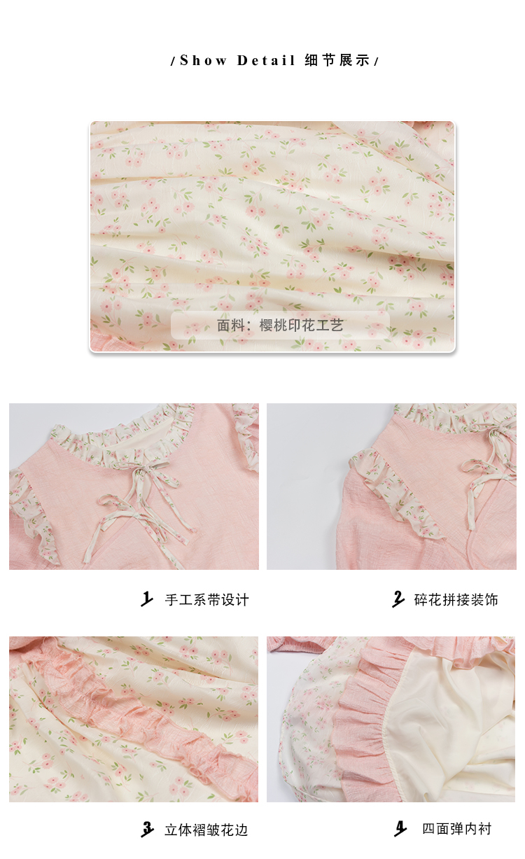 领口及两边袖肩均以立体褶皱花边装饰,巧妙地与裙身碎花相呼应,