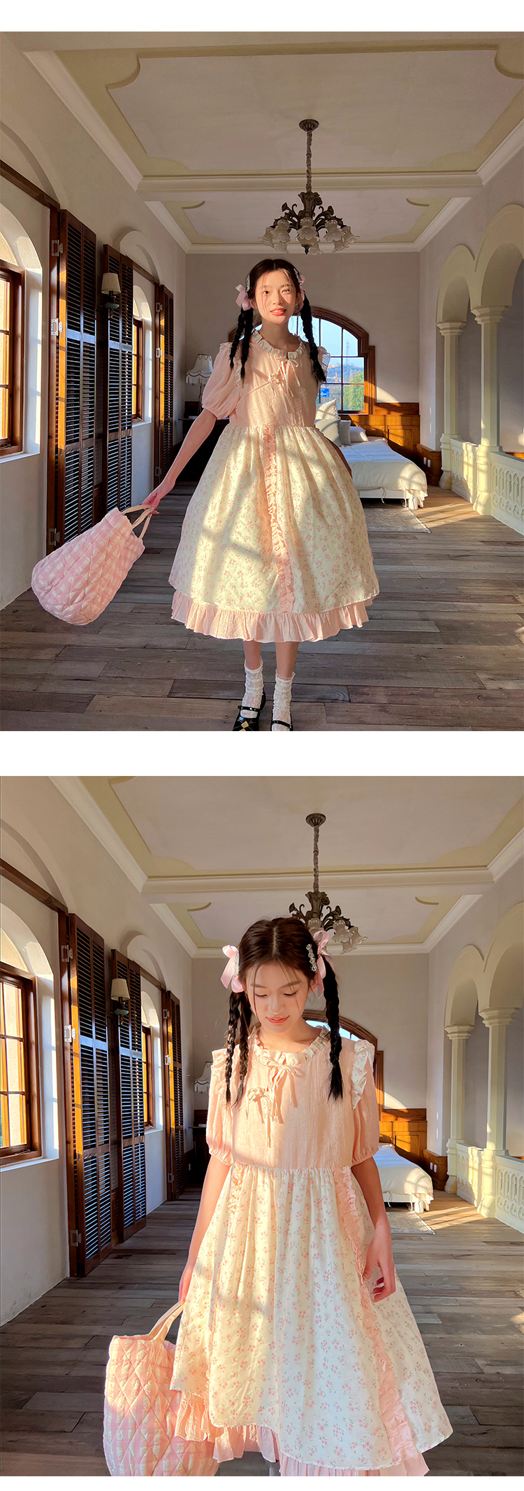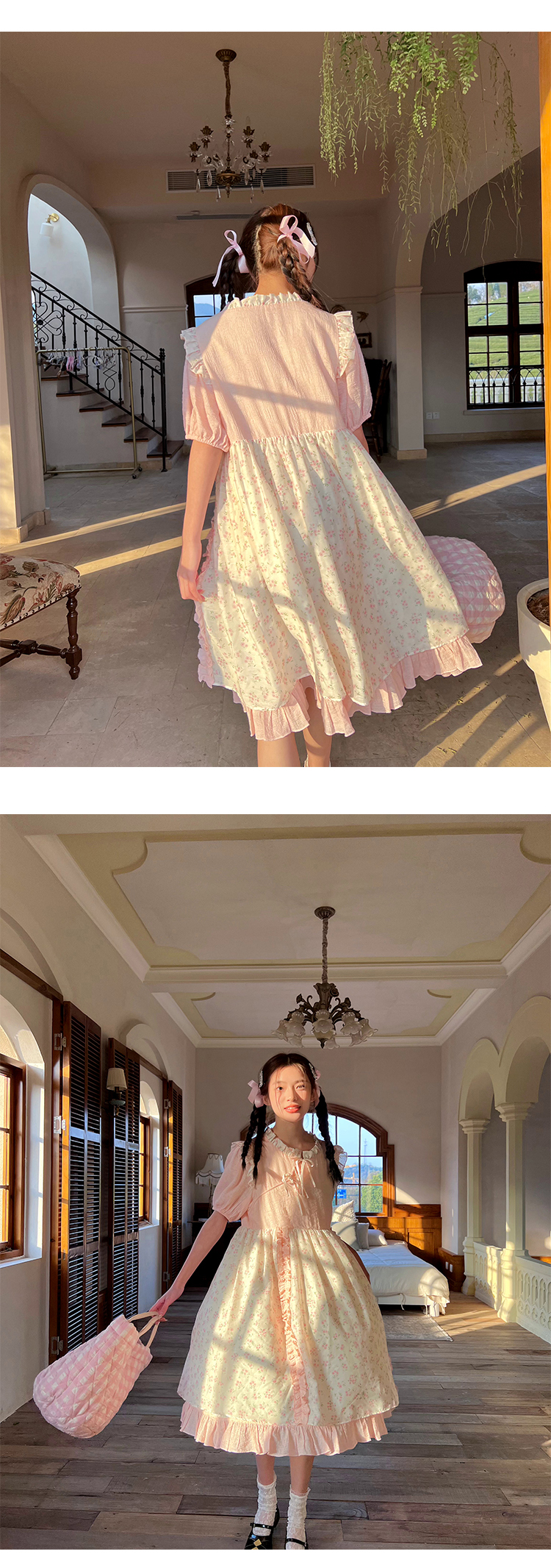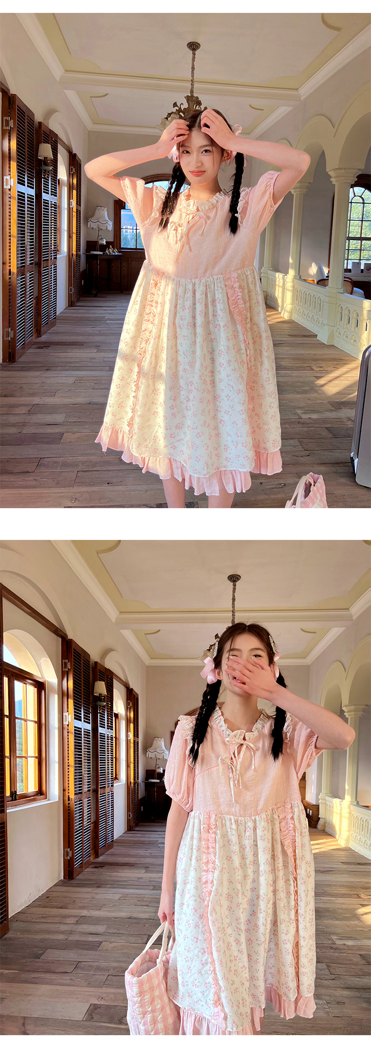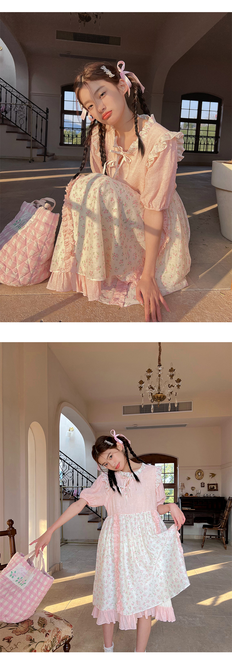 领口及两边袖肩均以立体褶皱花边装饰,巧妙地与裙身碎花相呼应,