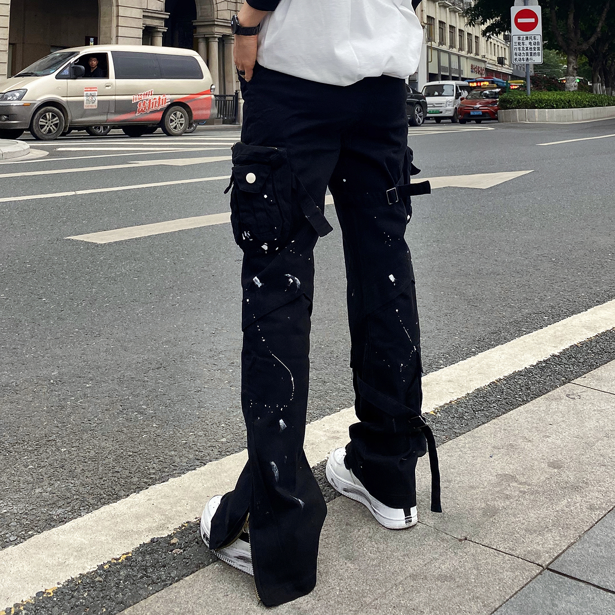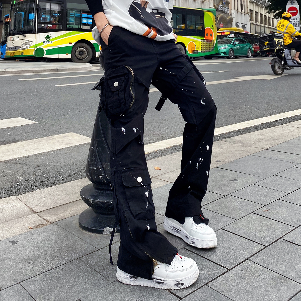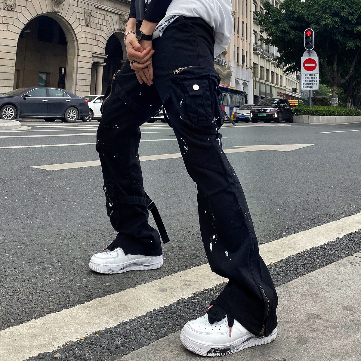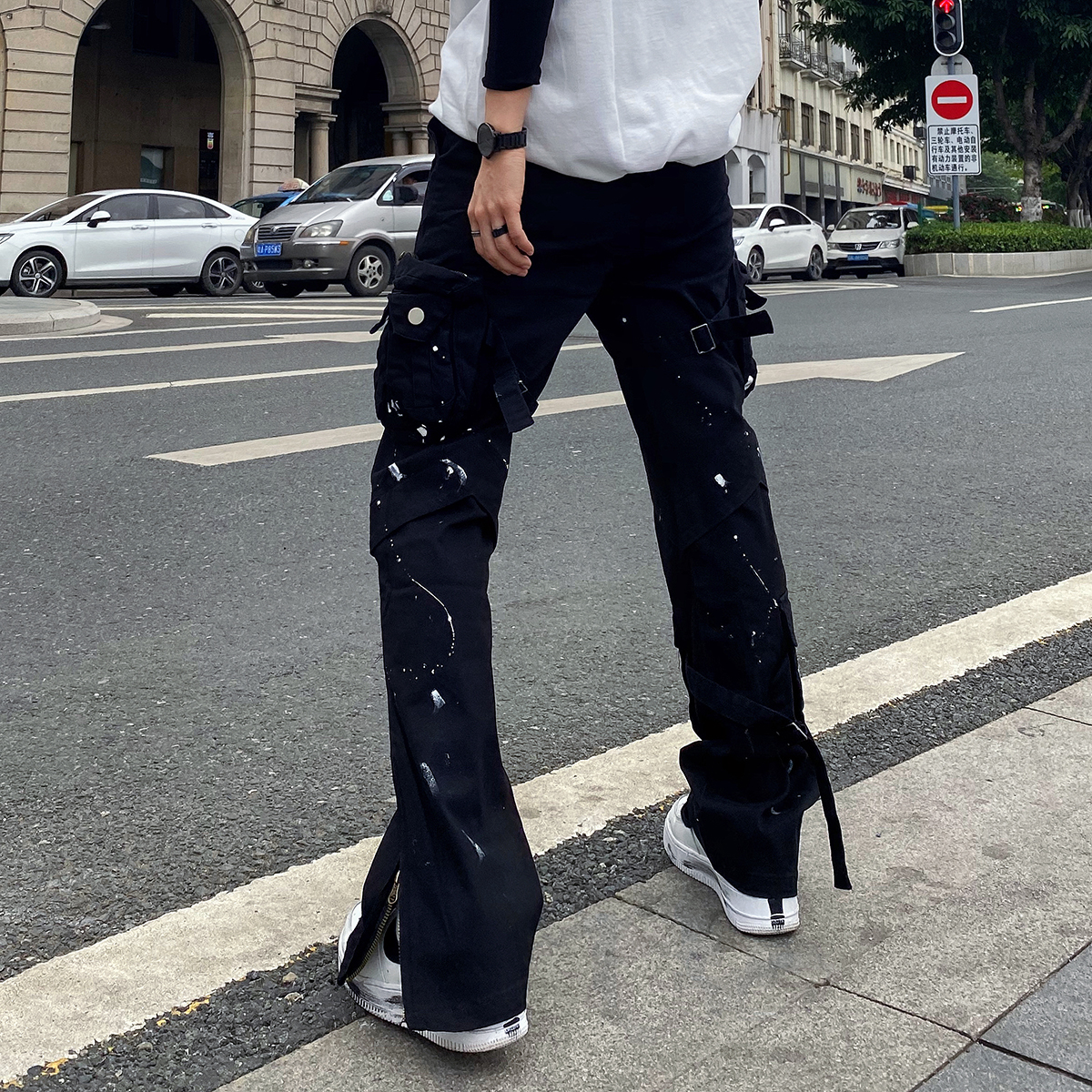 潑墨褲腳拉鍊喇叭vibe風工裝褲大口袋機能戰術綁帶休閒褲顯瘦男女