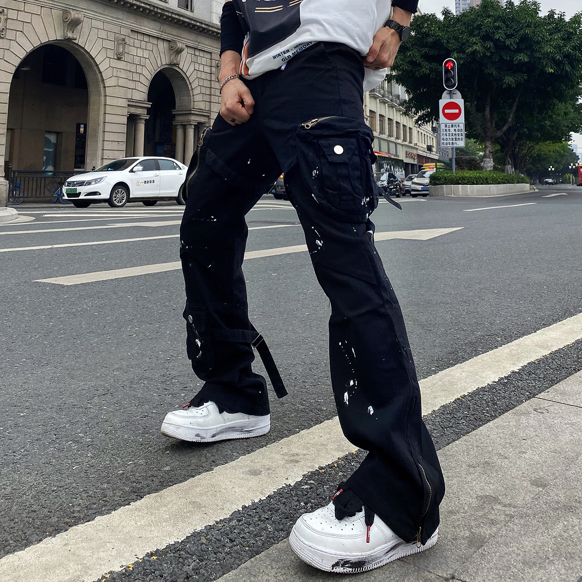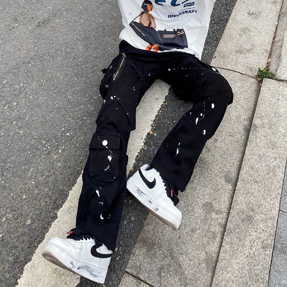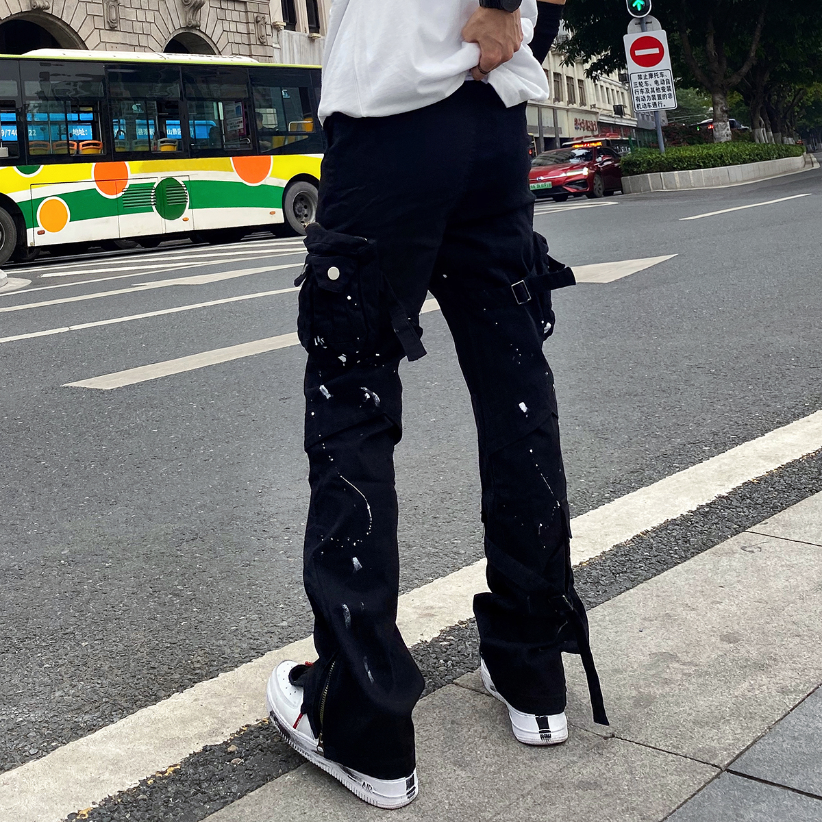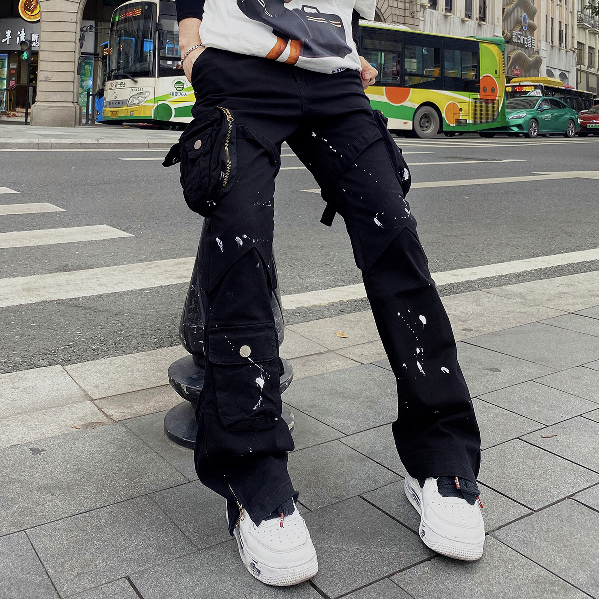 潑墨褲腳拉鍊喇叭vibe風工裝褲大口袋機能戰術綁帶休閒褲顯瘦男女