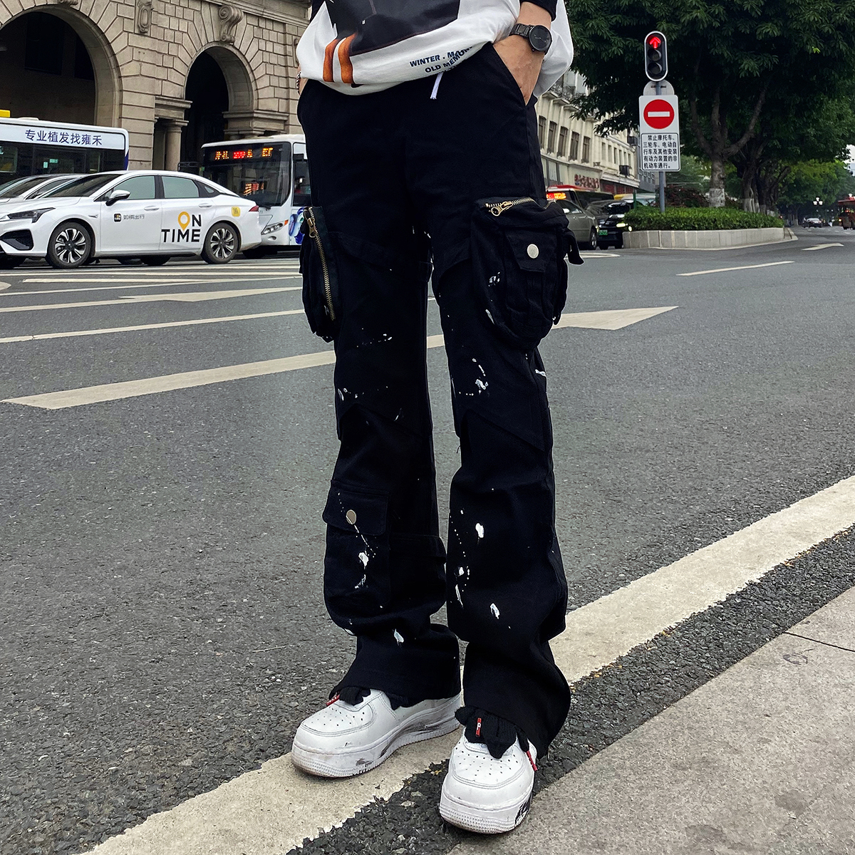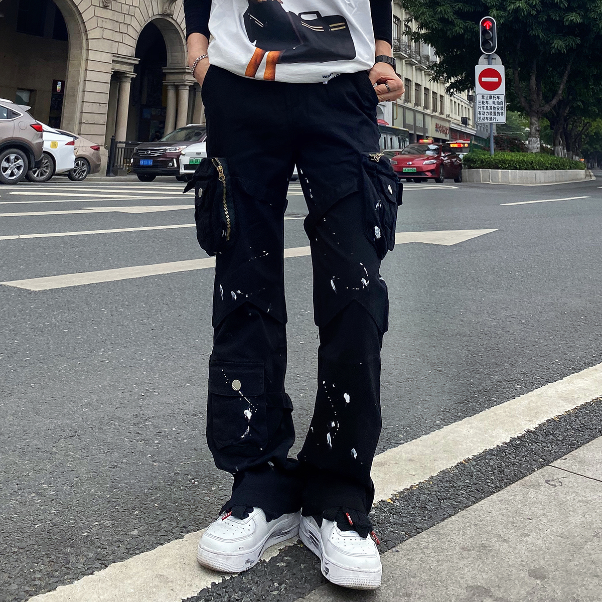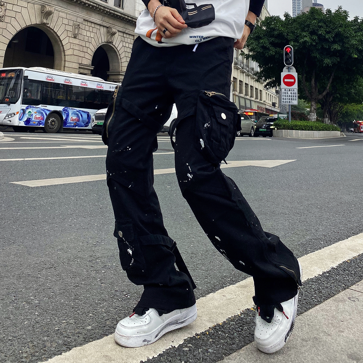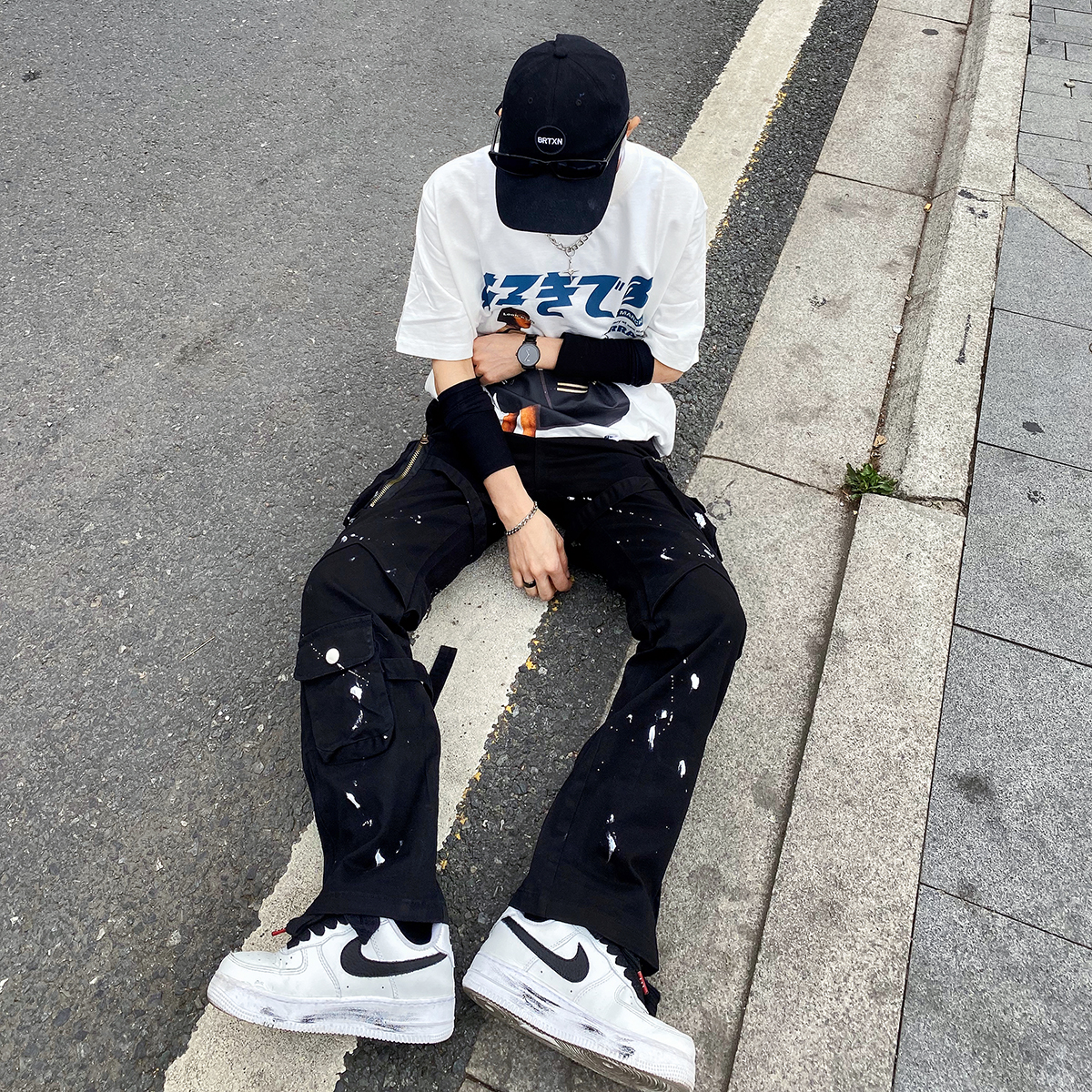 潑墨褲腳拉鍊喇叭vibe風工裝褲大口袋機能戰術綁帶休閒褲顯瘦男女