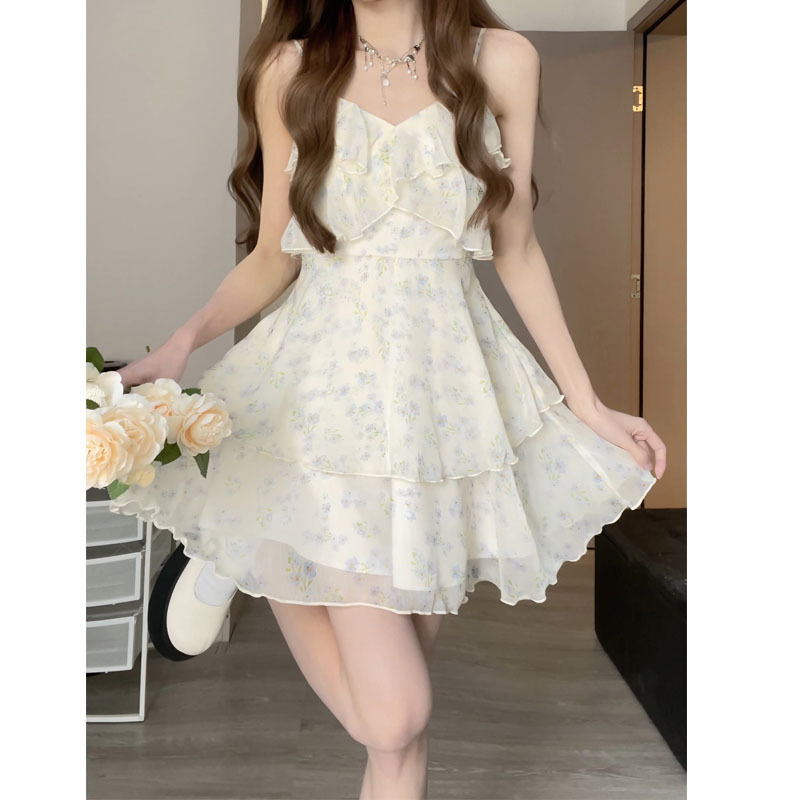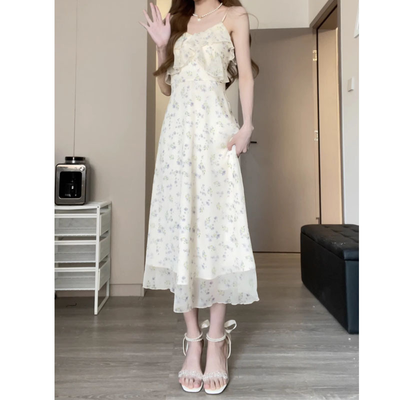 网红 2023夏款茉莉花温柔风碎花吊带连衣裙春季薄款吊带裙子