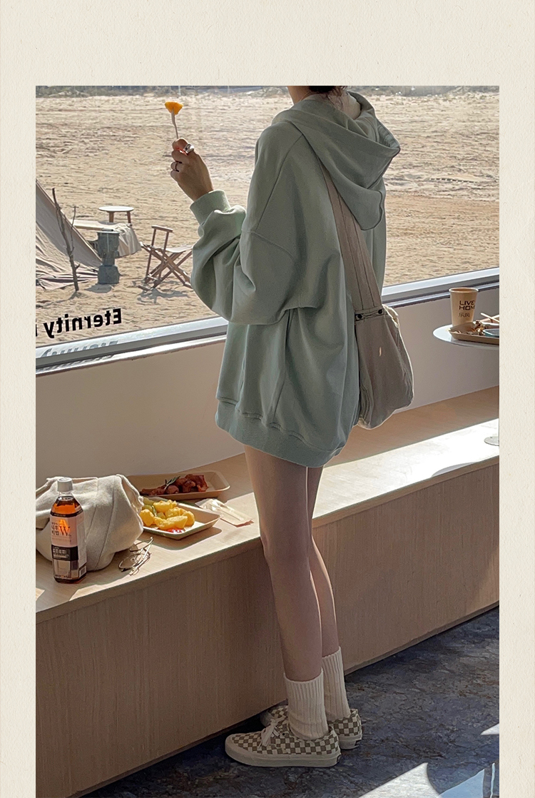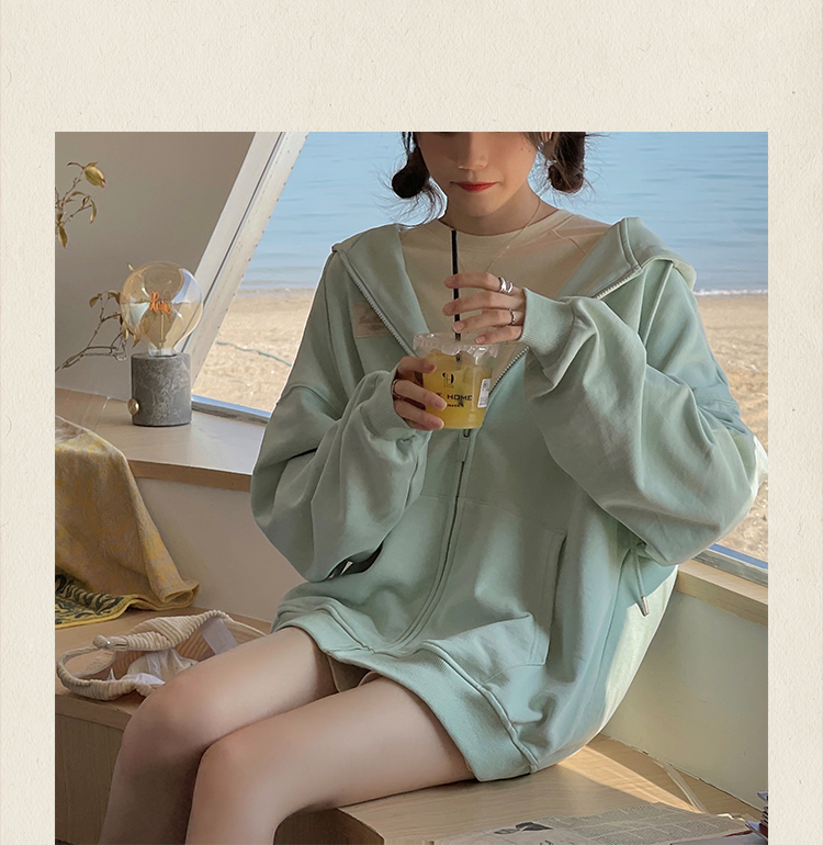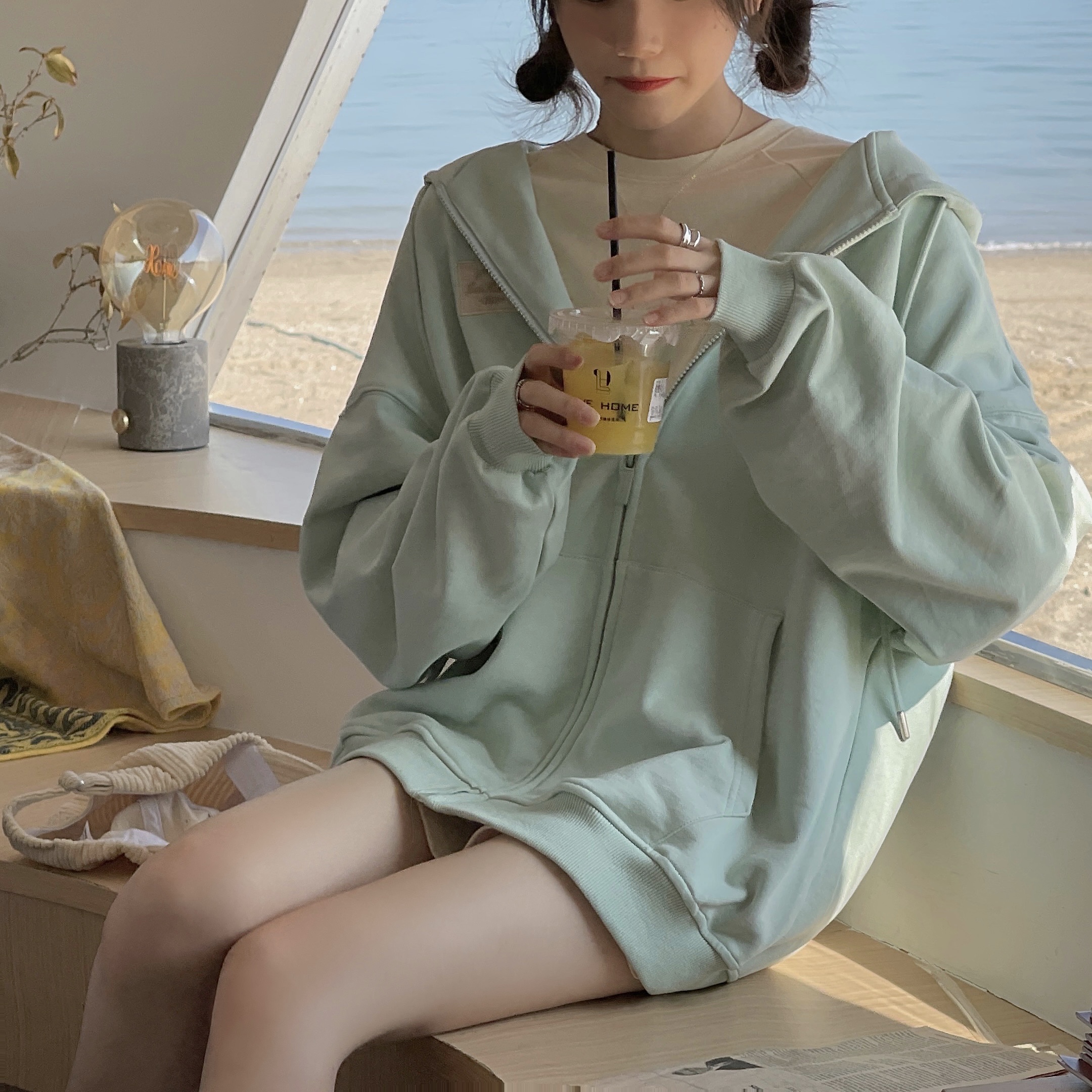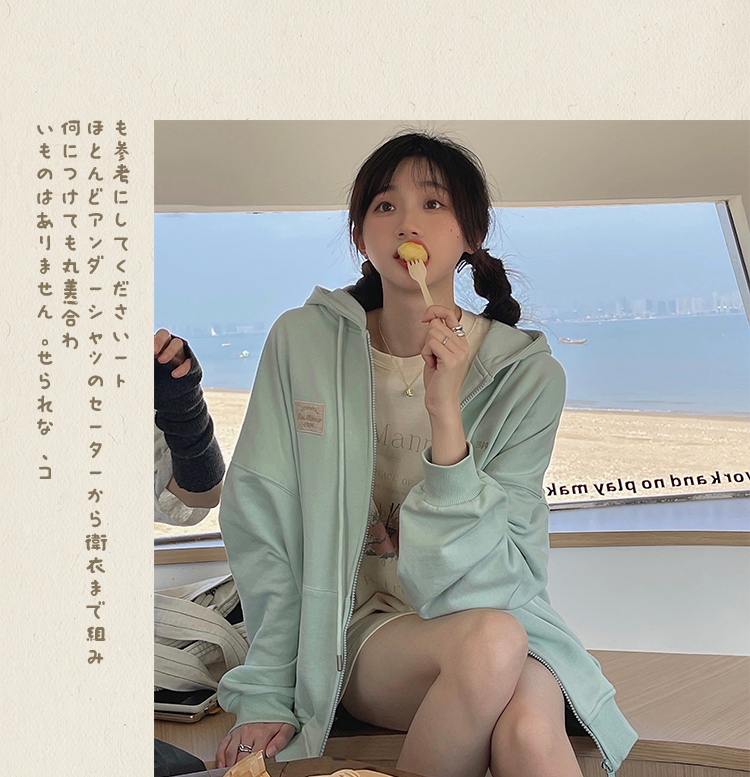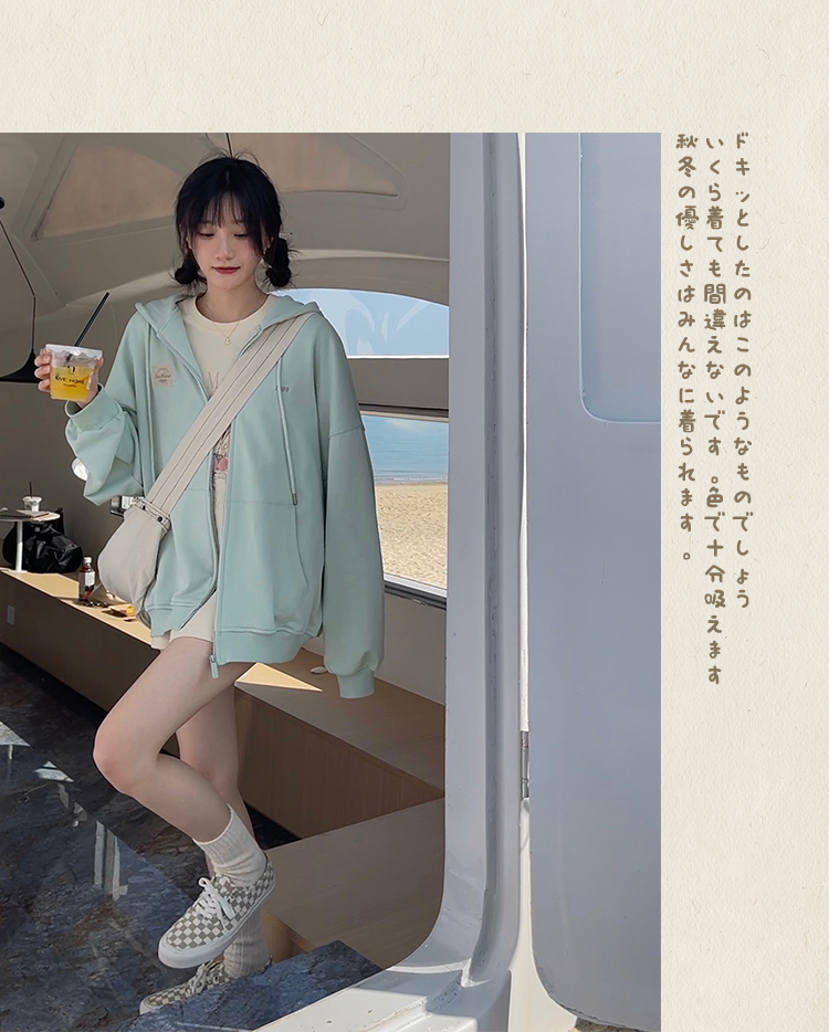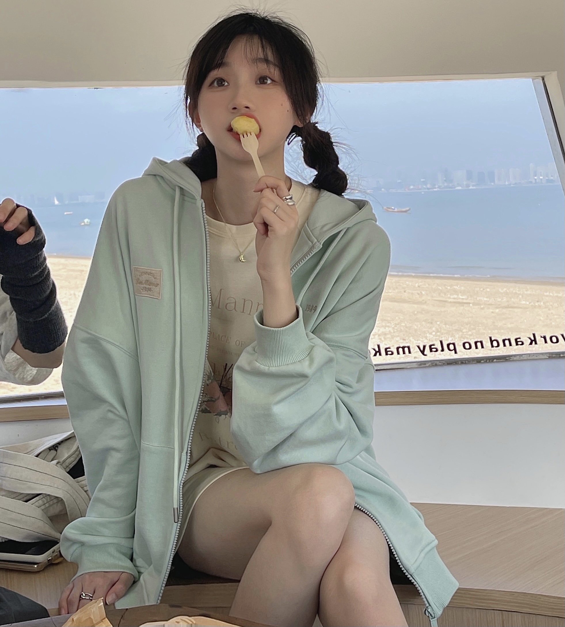 jmwomen綠色連帽運動衫外套女小個子寬鬆2023春秋日系慵懶開衫上衣