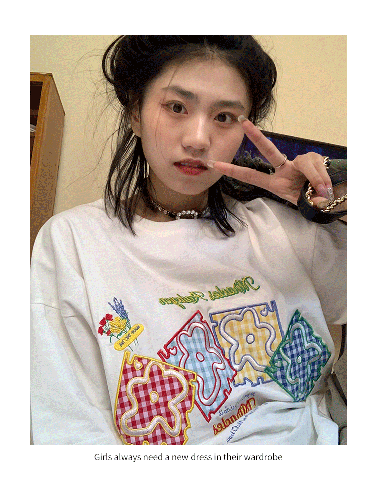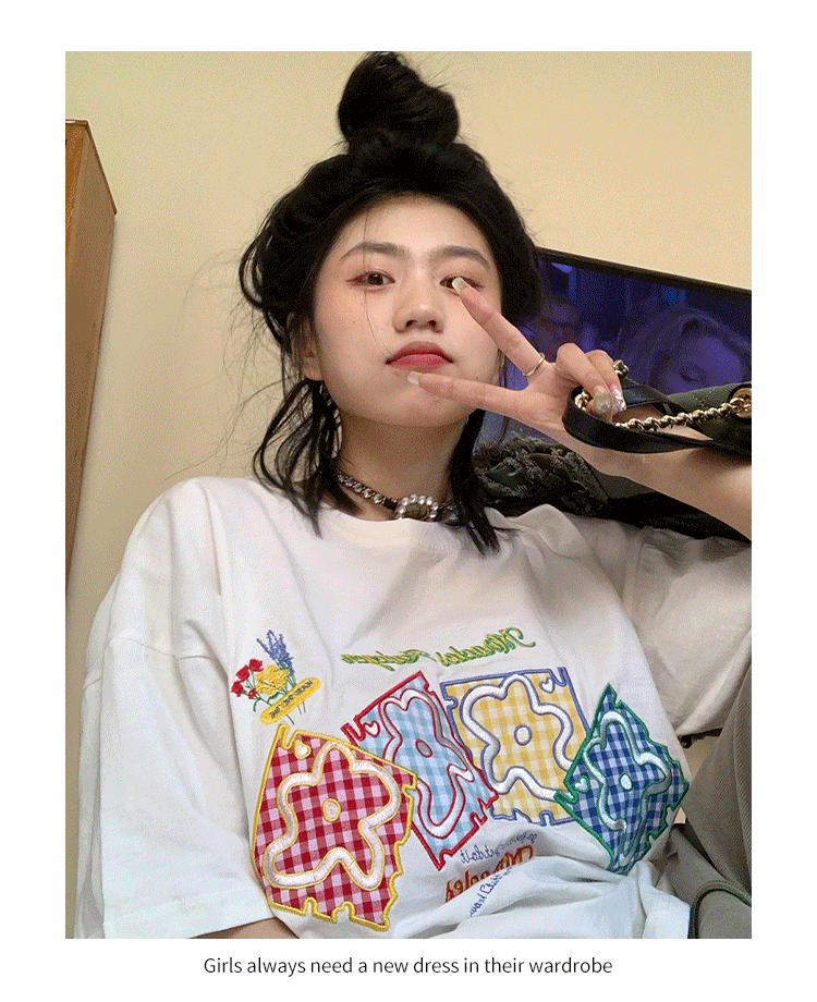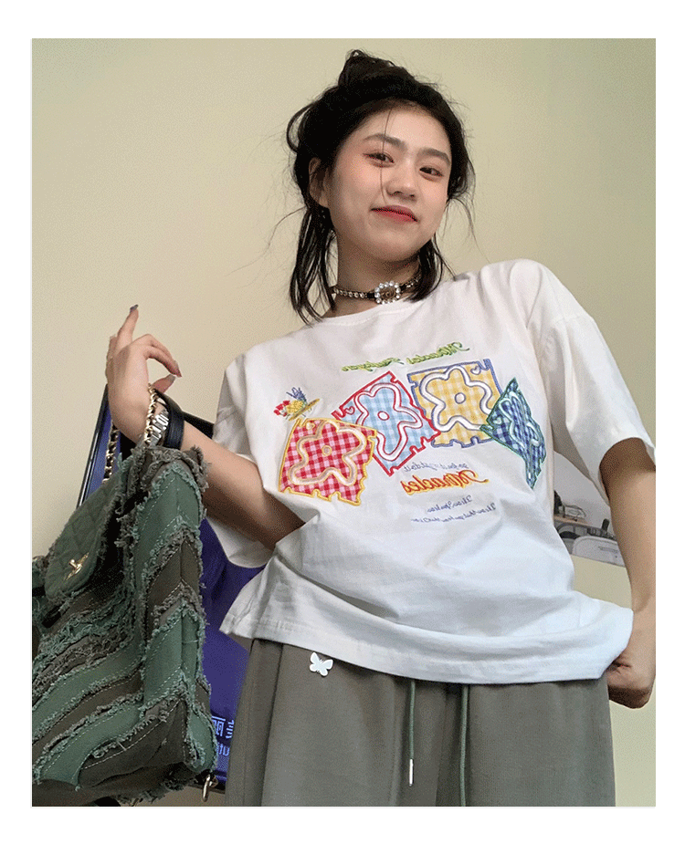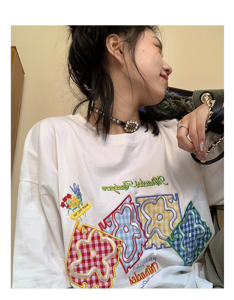 橘子樹在哪兒 方塊繡花短袖T恤女夏寬鬆白色T恤學生甜美可愛半袖