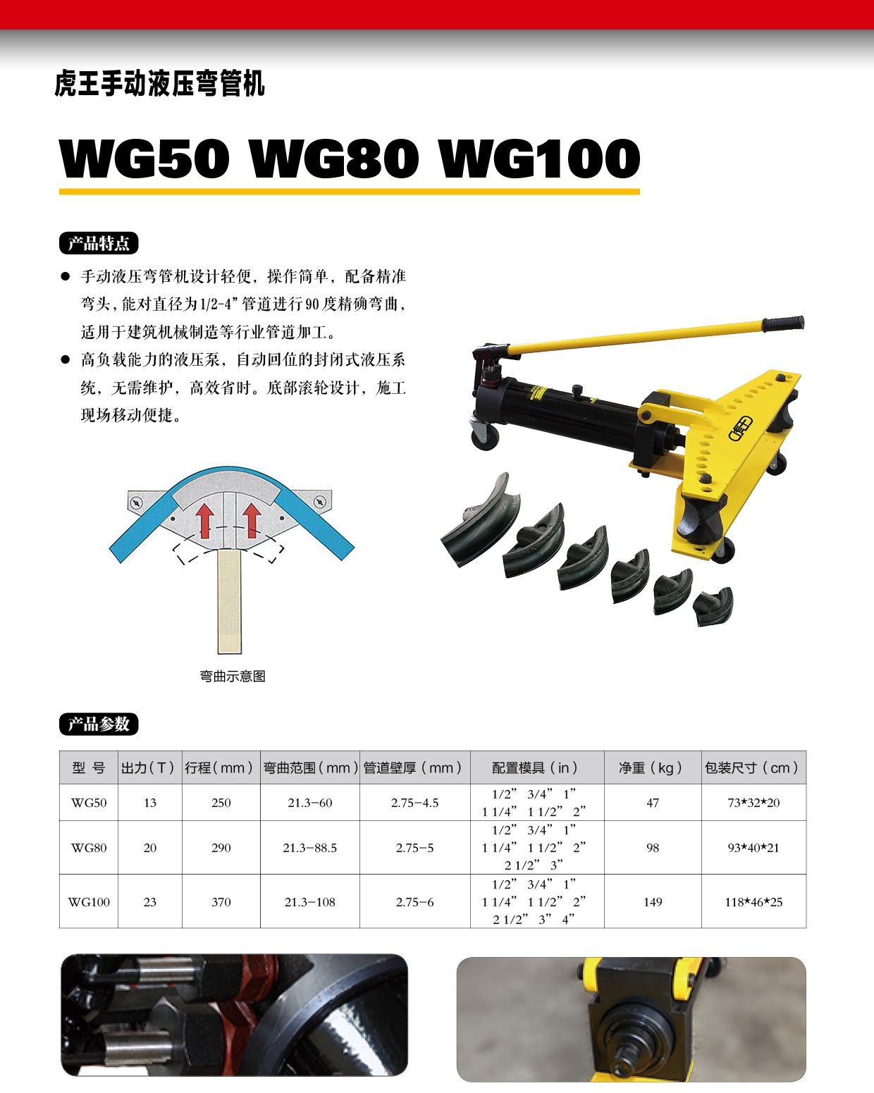 规格 WG25S纯机械套装(适Φ10-25MM),WG50手动液压套装(适Φ22-60外径),WG80手动液压套装(适Φ22-89外径),WG100手动液压套装(适Φ22-108外径),WGD50电动液压套装(适Φ22-60外径),WGD80电动液压套装(适Φ22-89外径),WGD100电动液压套装(适Φ22-108外径)