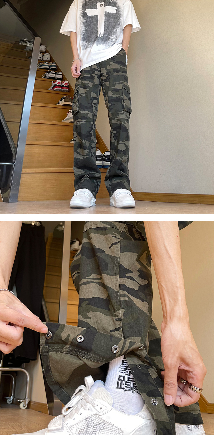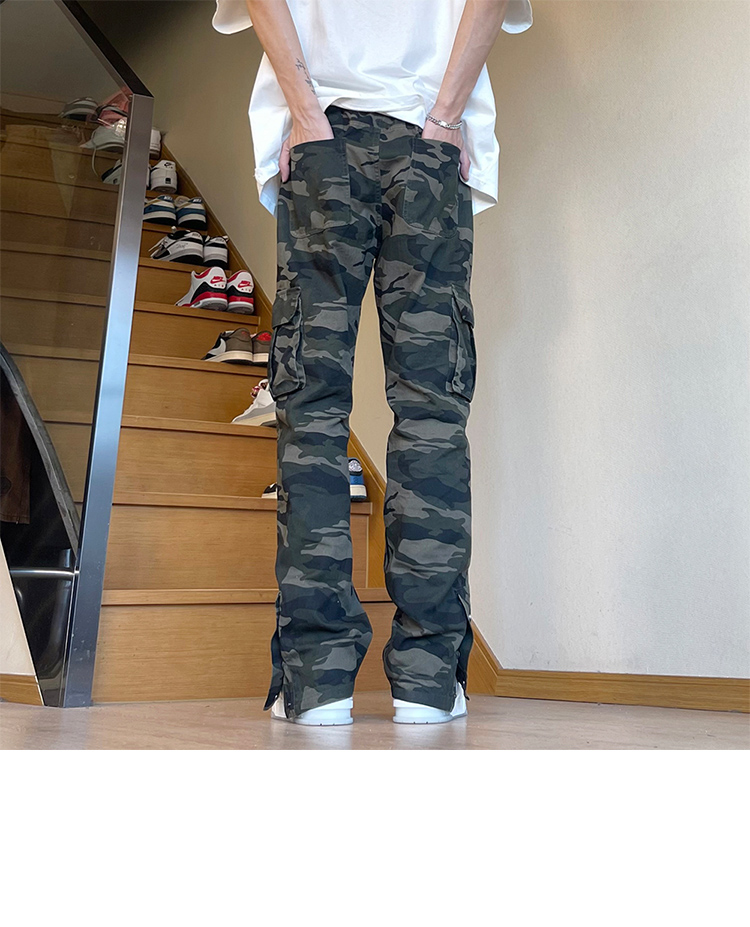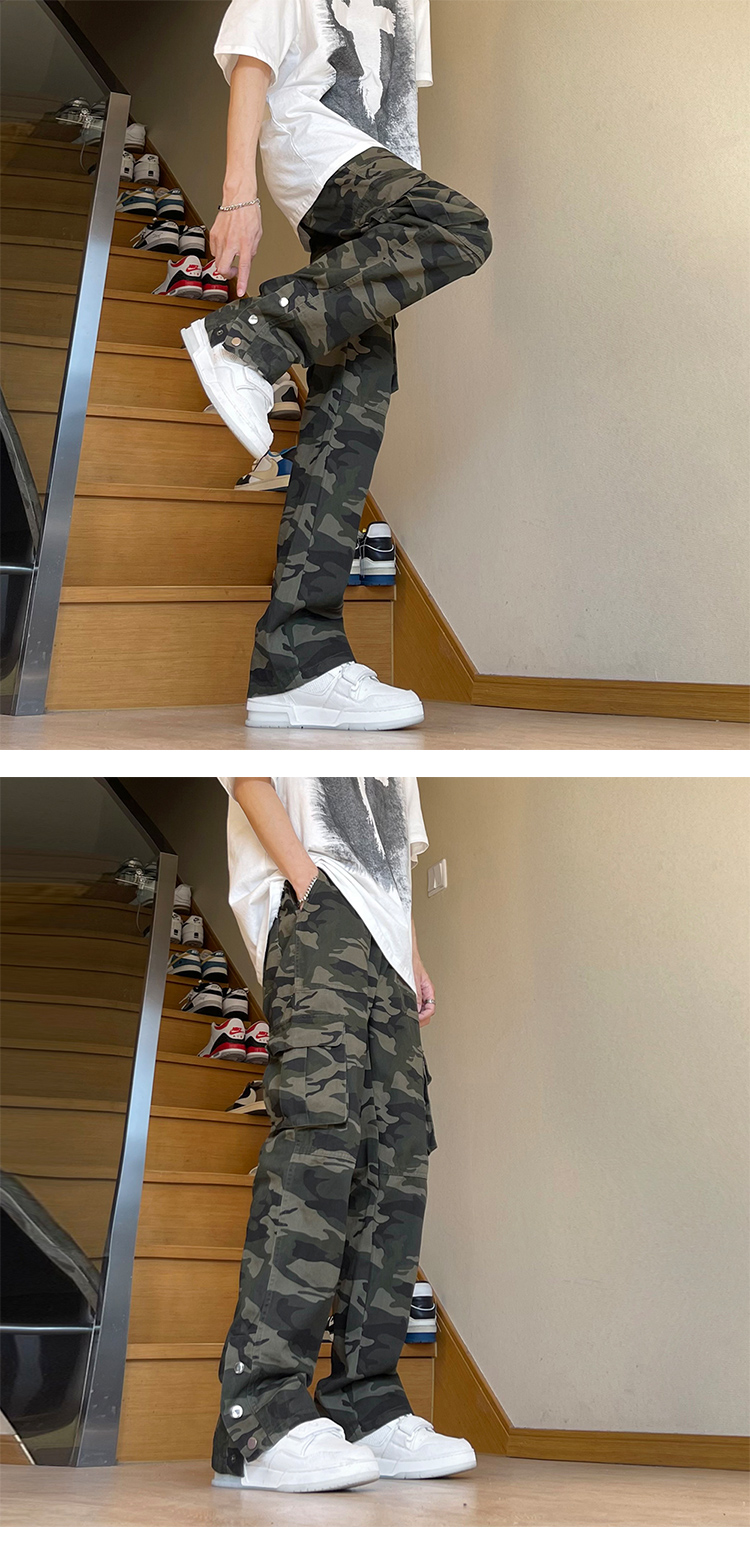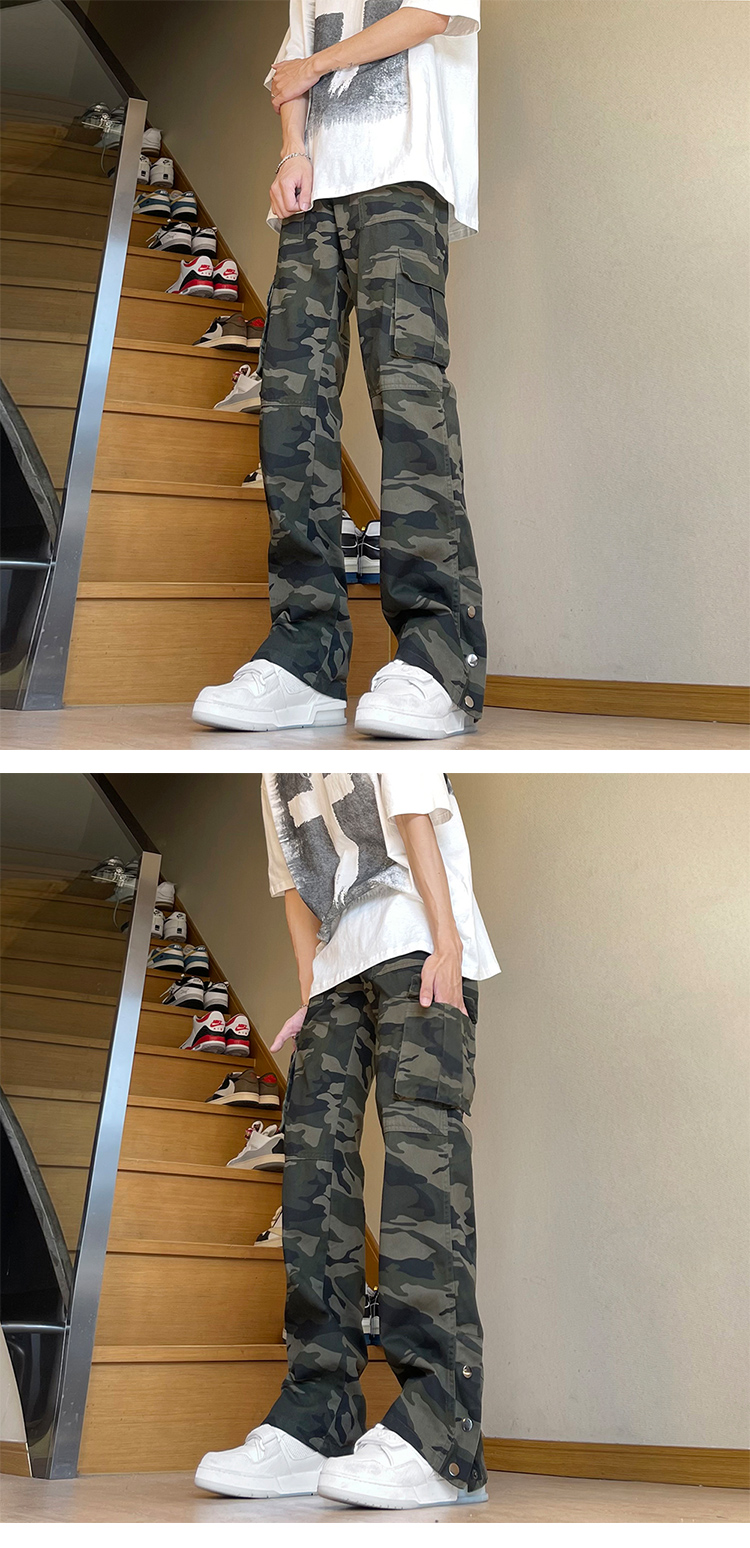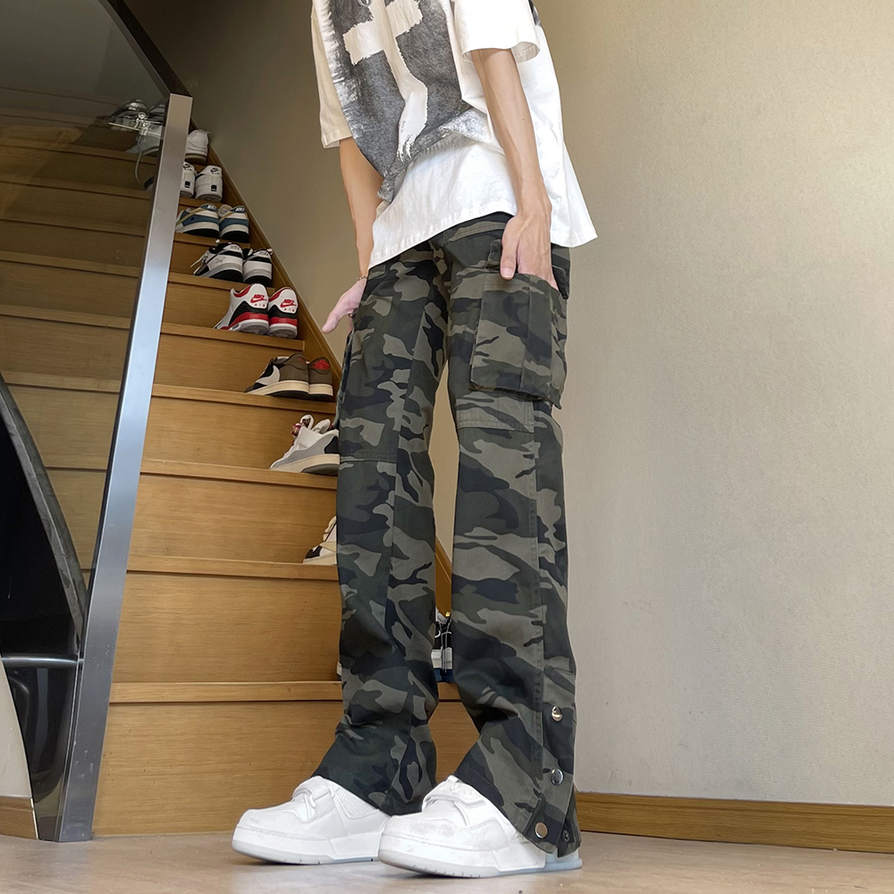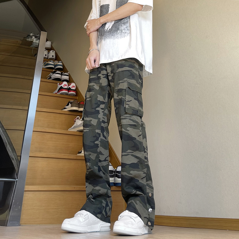 美式復古vibe褲子高街cleanfit伐木迷彩工裝褲男潮直筒排扣微喇叭褲