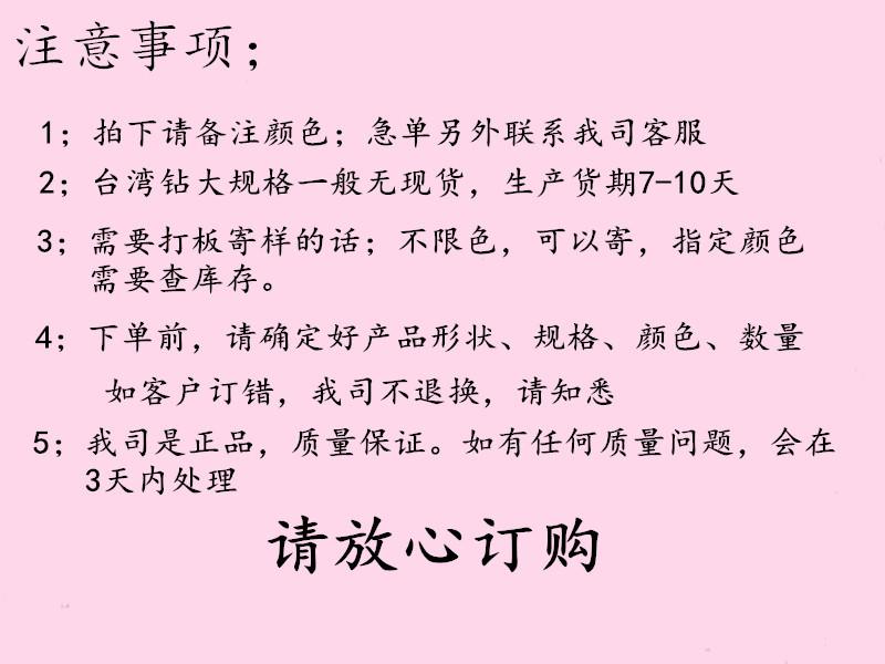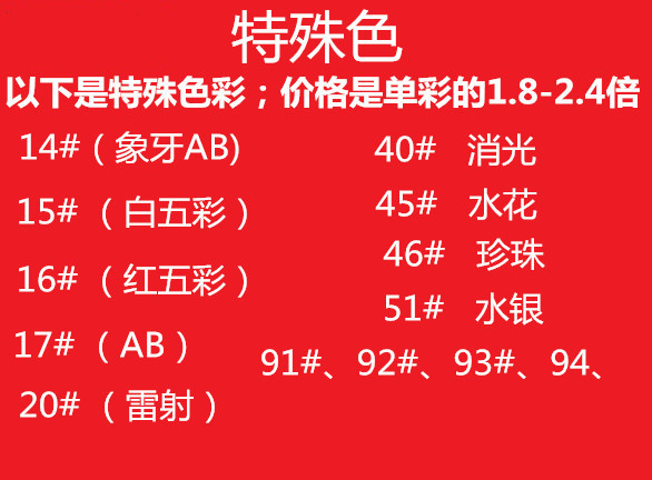 颜色 1#(透明白色),3#(浅粉),6#(大红),9#绿,其它色(参考色卡,不含特殊色