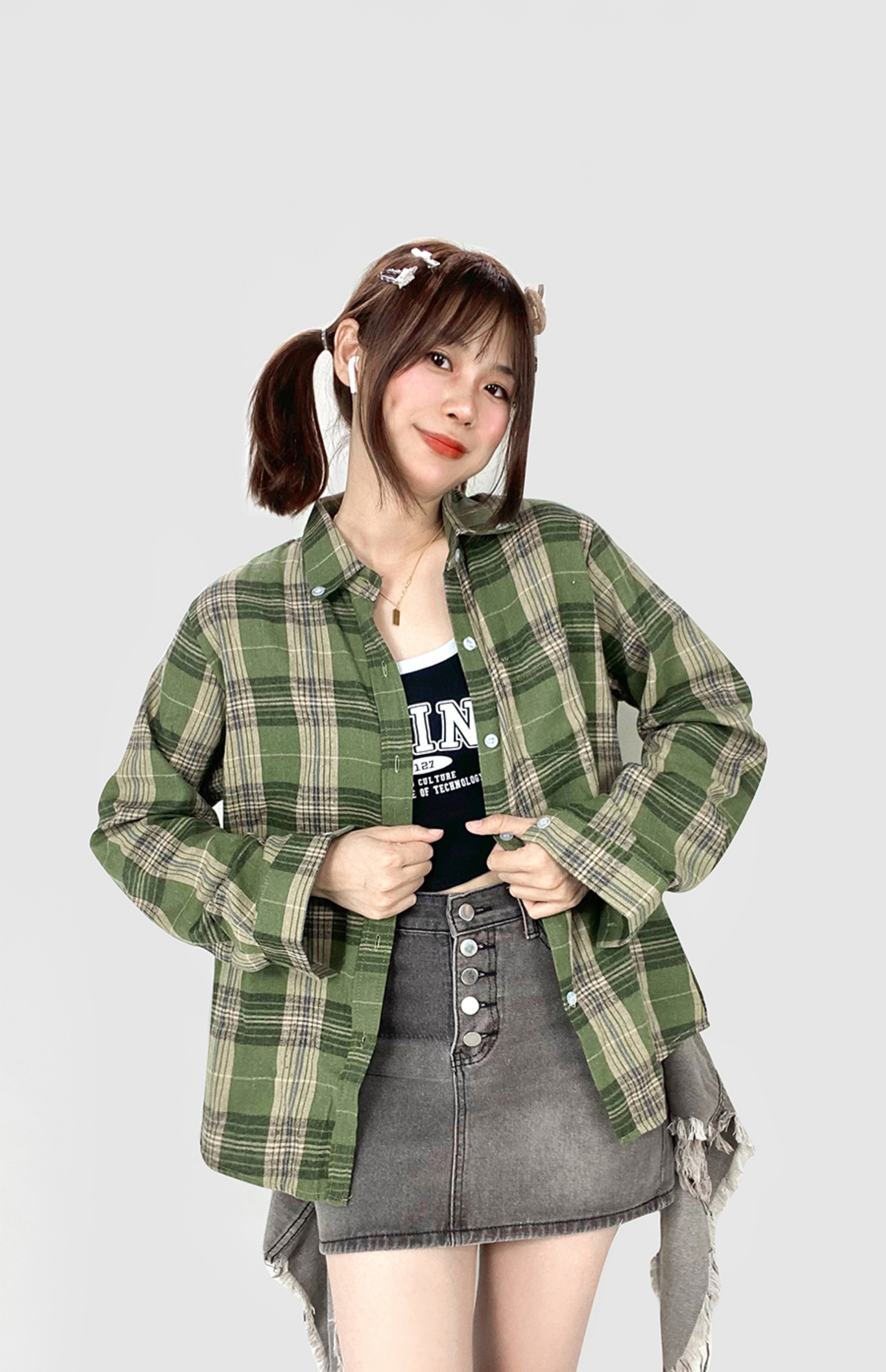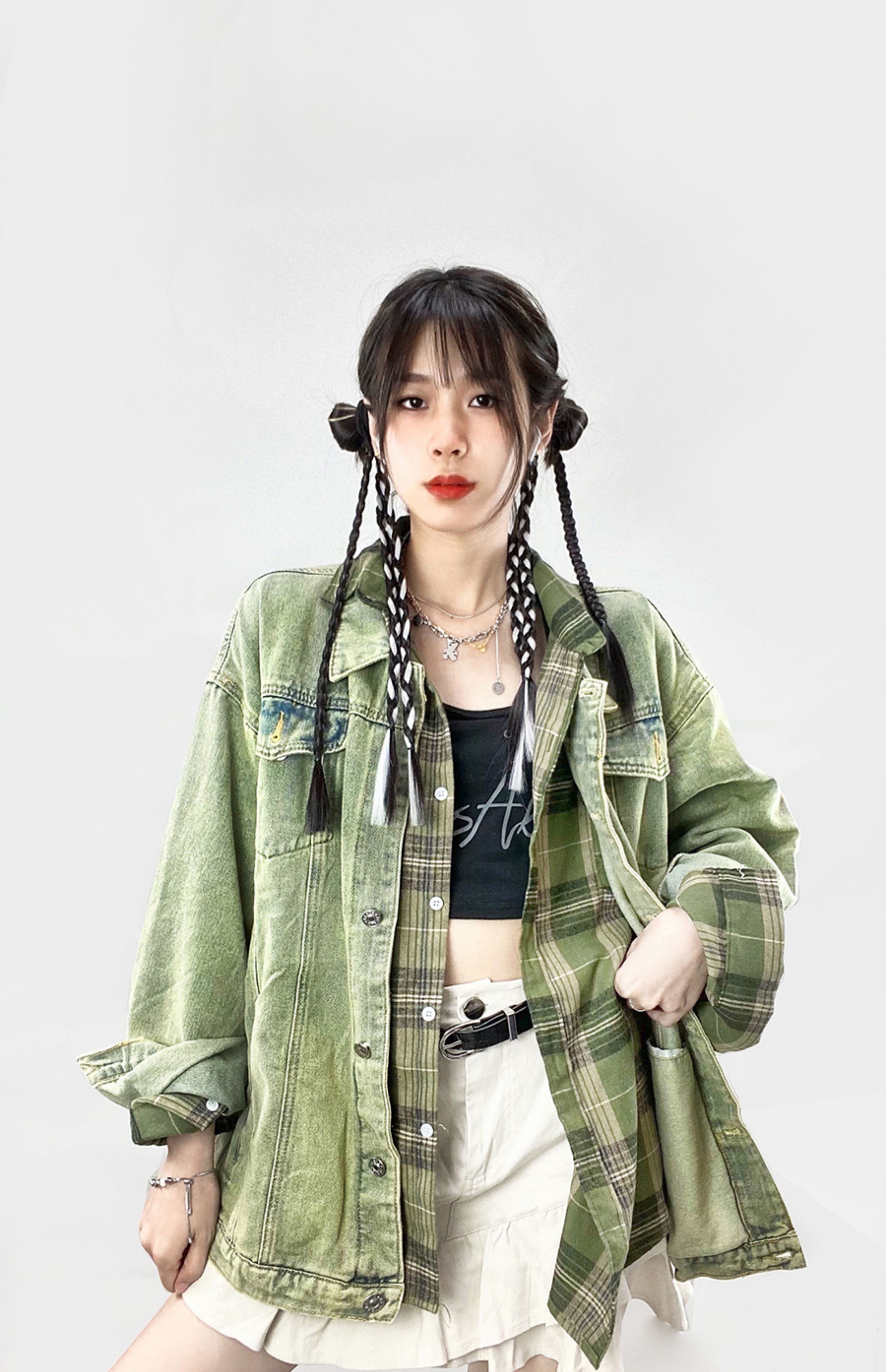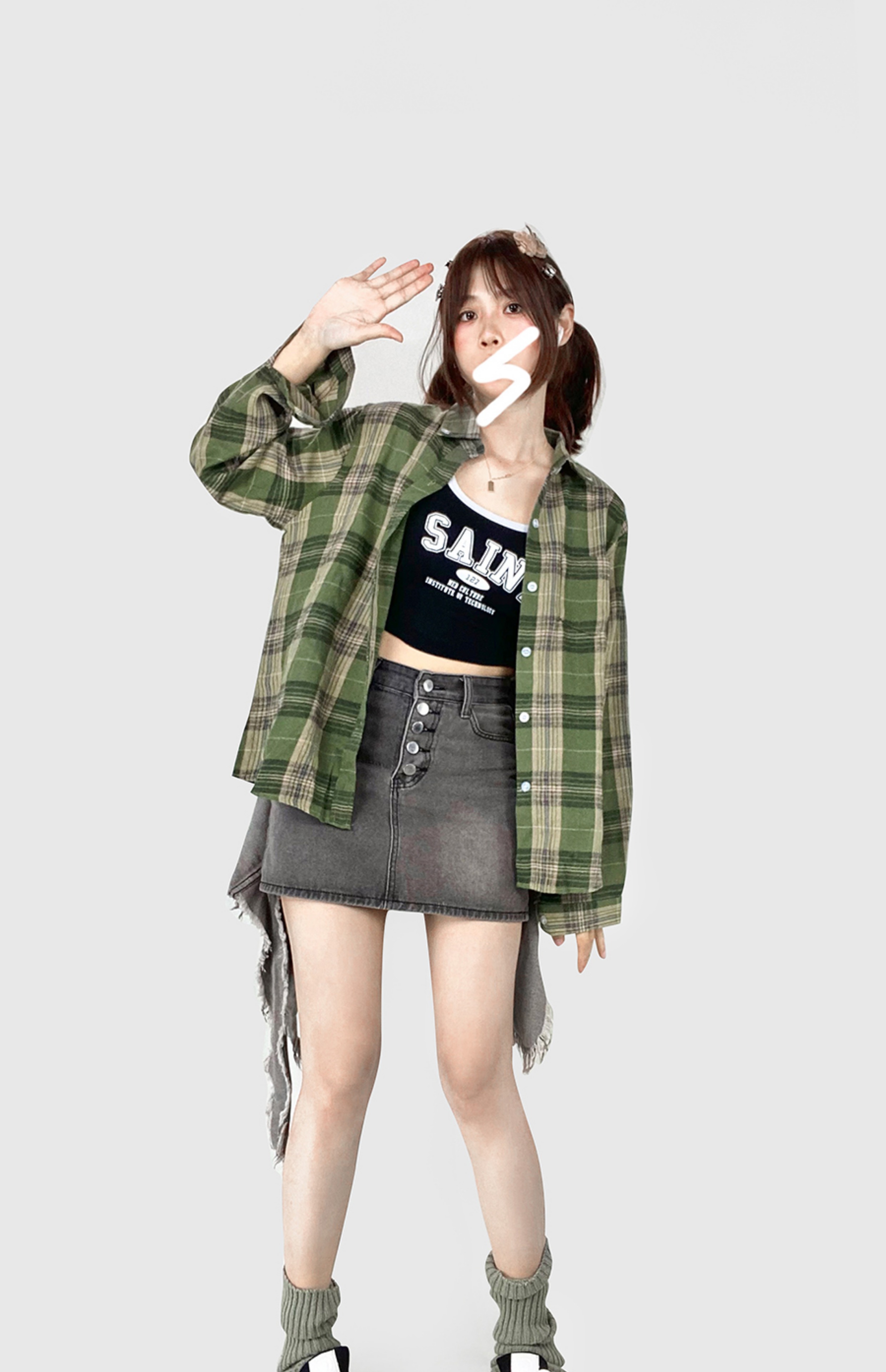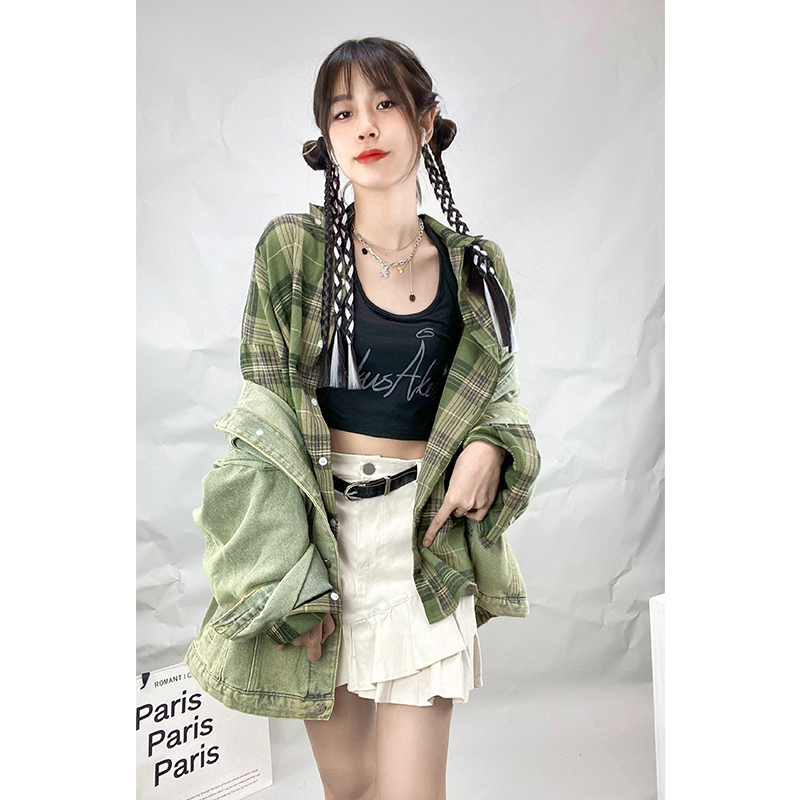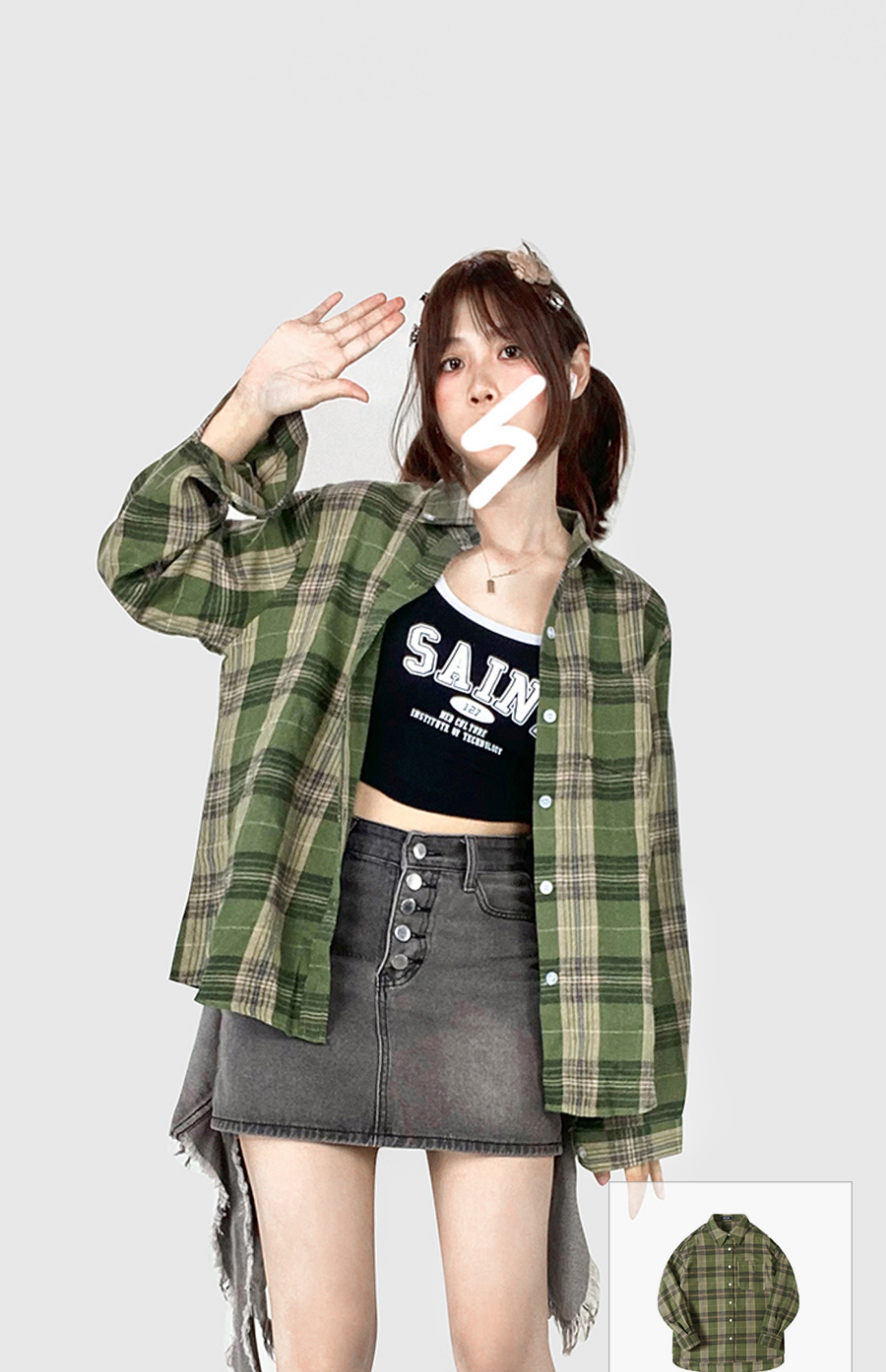 vintage美式復古上衣初秋疊穿外套設計感小眾襯衫綠色格子紋襯衫
