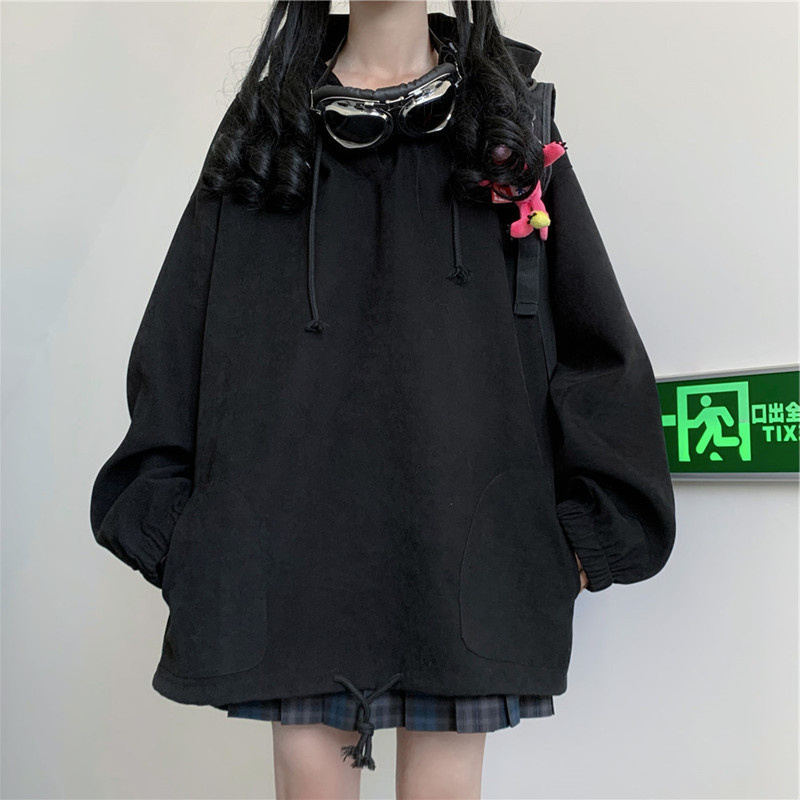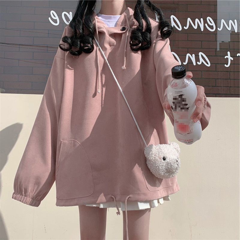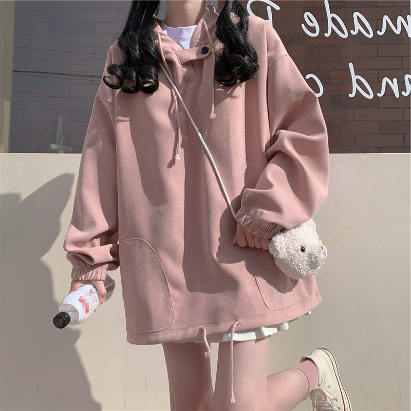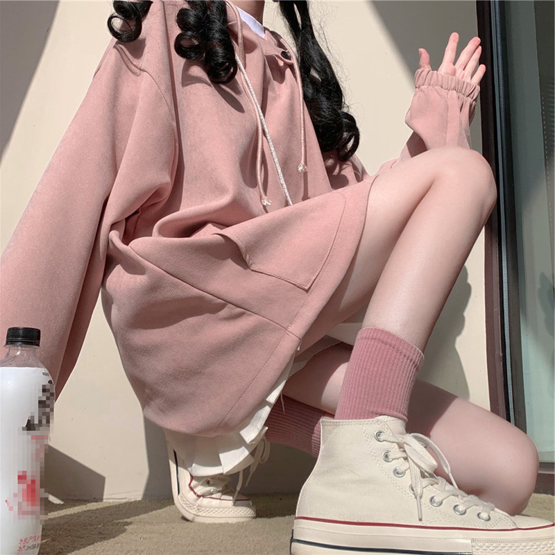 粉色工裝連帽運動衫女秋冬加絨加厚寬鬆bf慵懶風設計感小眾炸街外套
