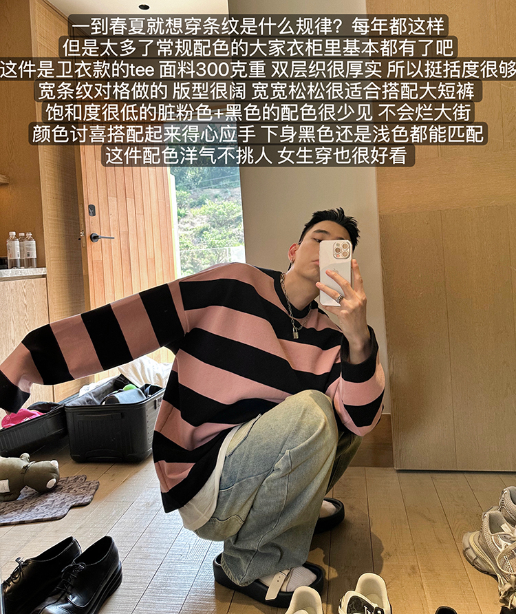 威廉威【休斯頓老街】髒粉寬條紋厚300克棉衛衣TEE