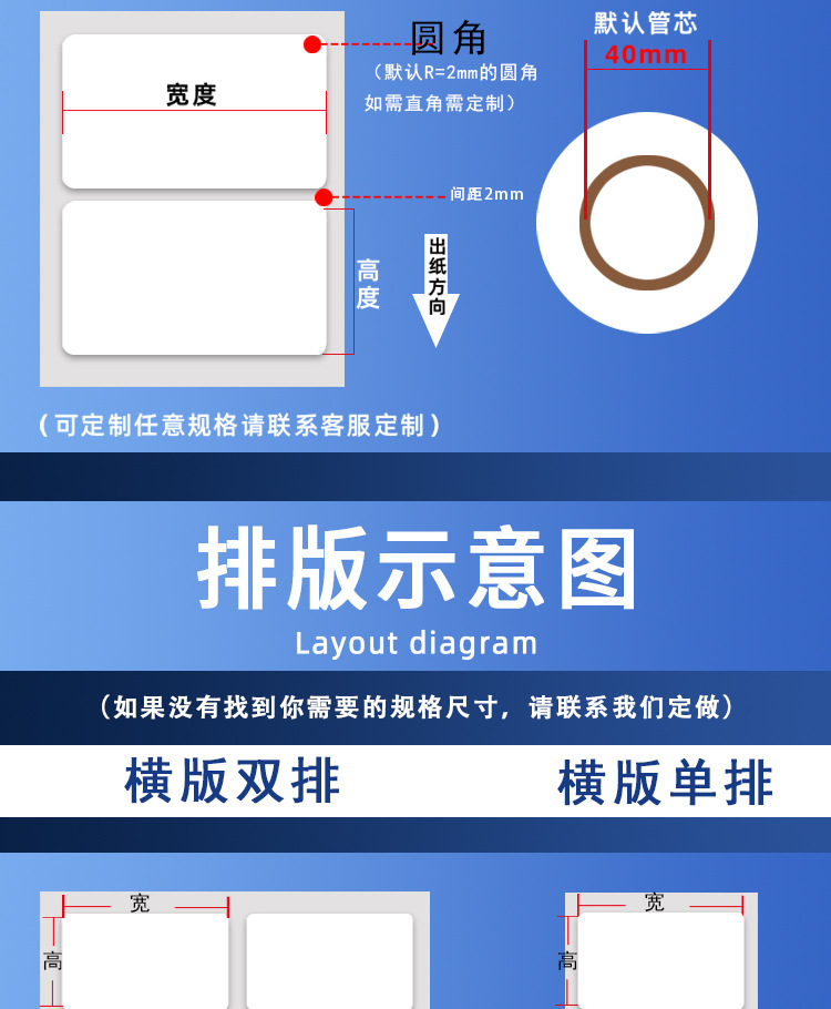 尺寸 30*10mm*3排*10000张(哑面),30*15mm*2排*5000张(哑面),30*20mm*3排*5000张(哑面),40*20mm*2排*4000张(哑面),40*30mm*2排*3000张(哑面 ),50*10mm*1排*5000张(哑面),50X30X1500 张 1排(哑面),50*25mm*双排*3000张(哑面),50*20mm*2排*3000张(哑面),50*30mm*2排*2000张(哑面),50*40mm*2排*2000张(哑面),60*30mm*1排*1000张(哑面),60*40mm*1排*1000张(哑面),70*50mm*1排*1000张(哑面),80*40mm*1排*1000张(哑面),80*50mm*1排*800张(哑面),80*60mm*1排1000张(哑面),100*50mm*1排*1000张(哑面),100*60mm*1排*1000张(哑面),100*70mm*1排*500张(哑面),100*80mm*1排*500(哑面),100*100mm*1排*500张(哑面),100*150mm*1排*250张(哑面),改此
