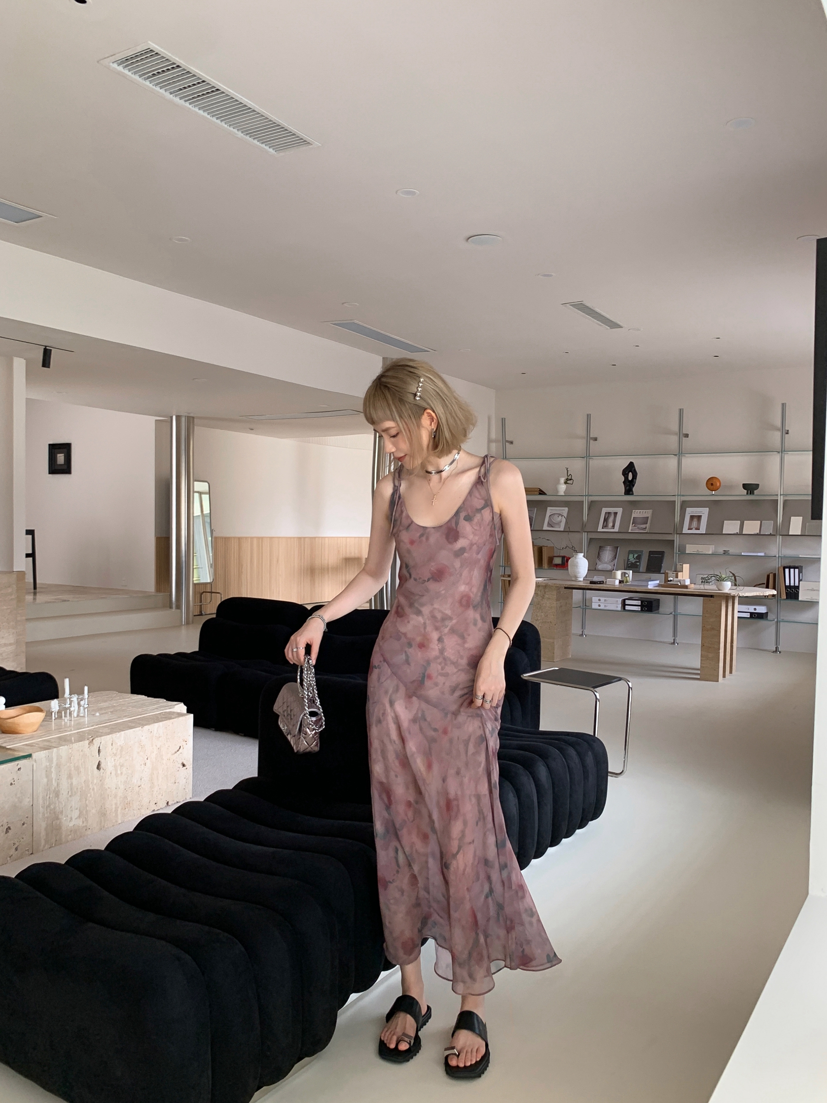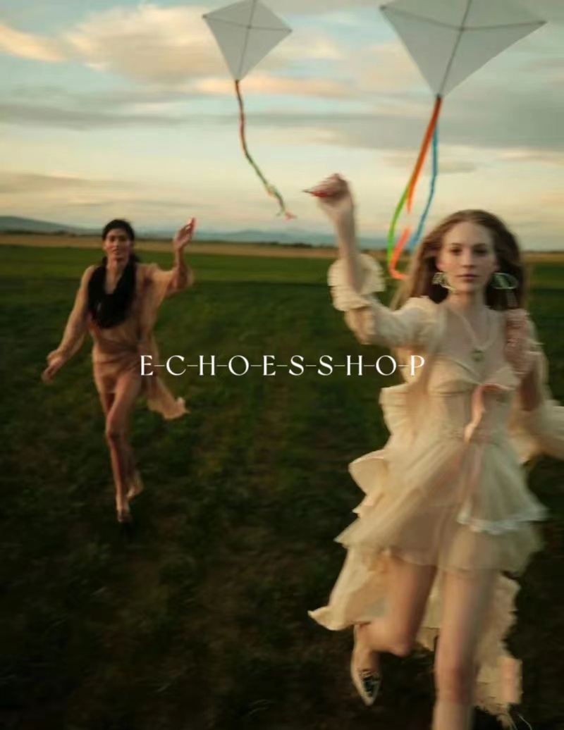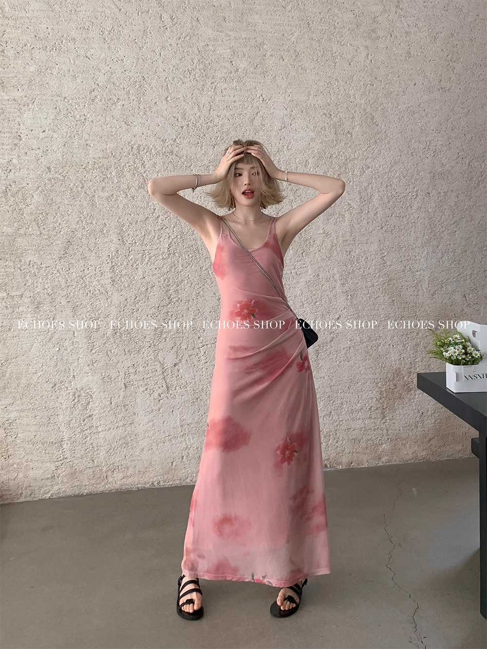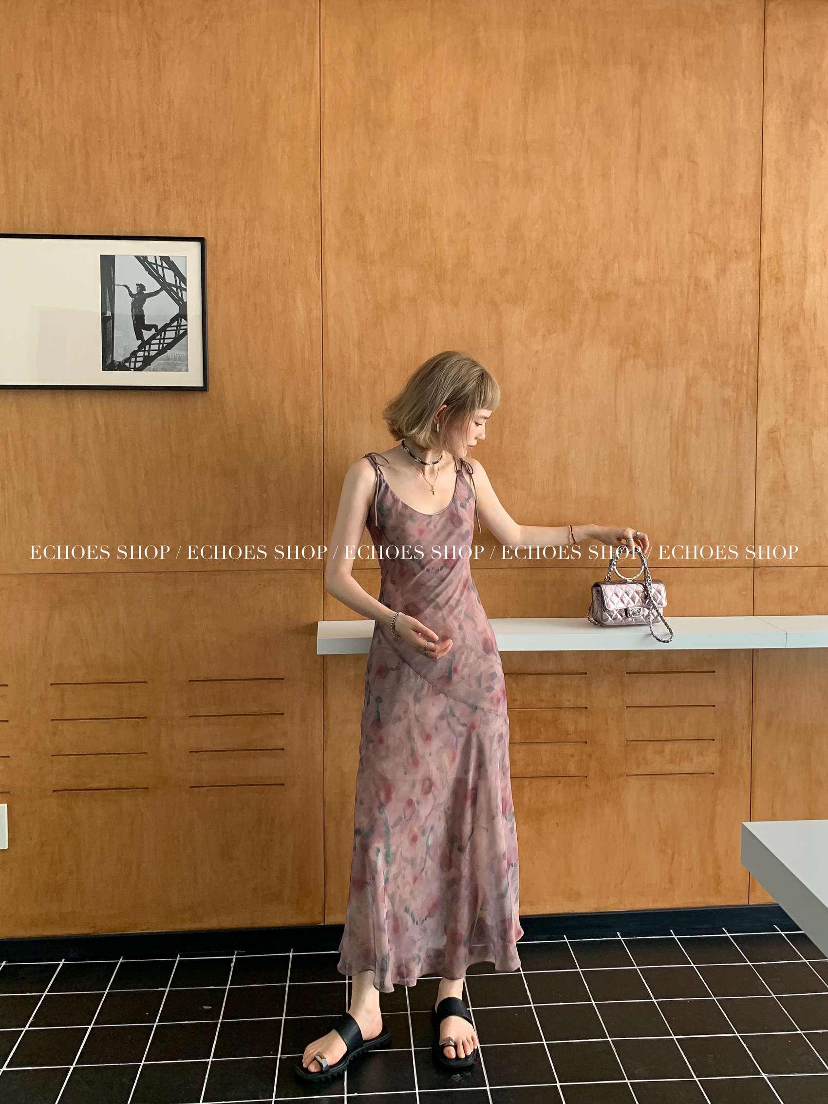 Echoes 「夏日邂逅」暈染印花吊帶洋裝女雪紡收腰修身顯瘦長裙