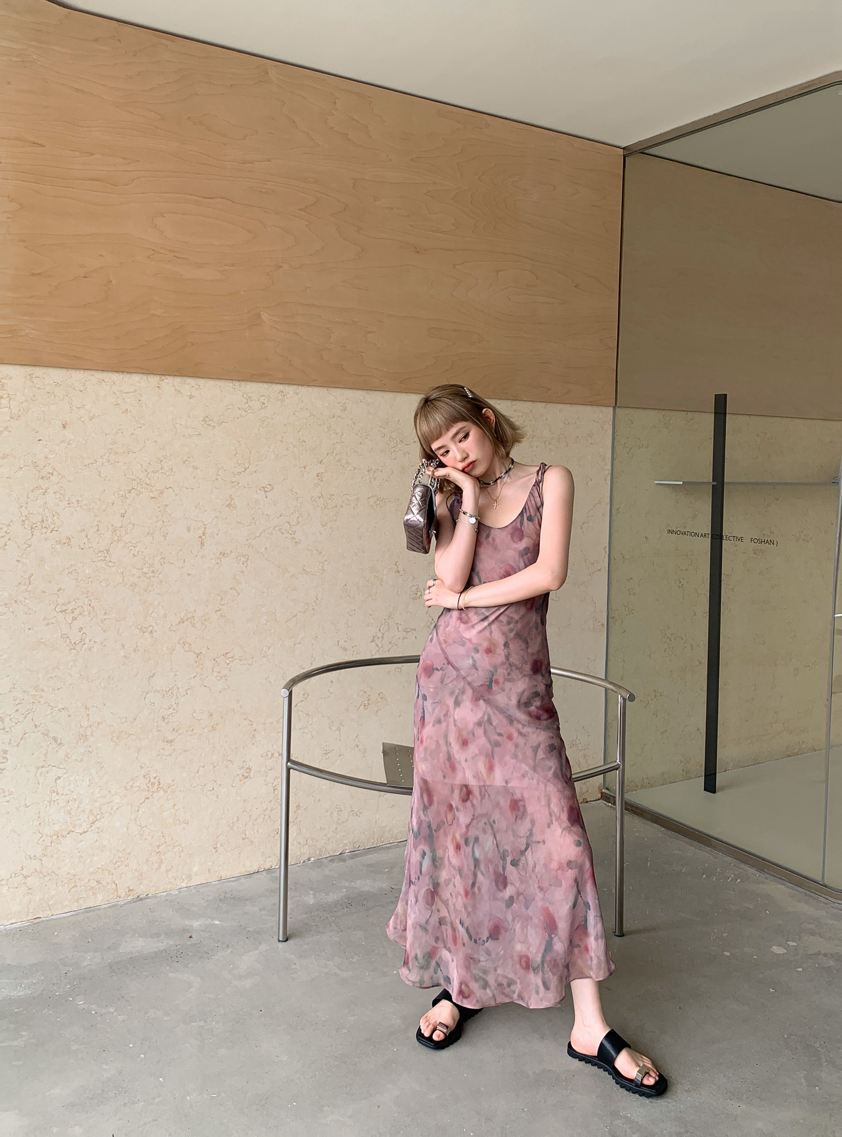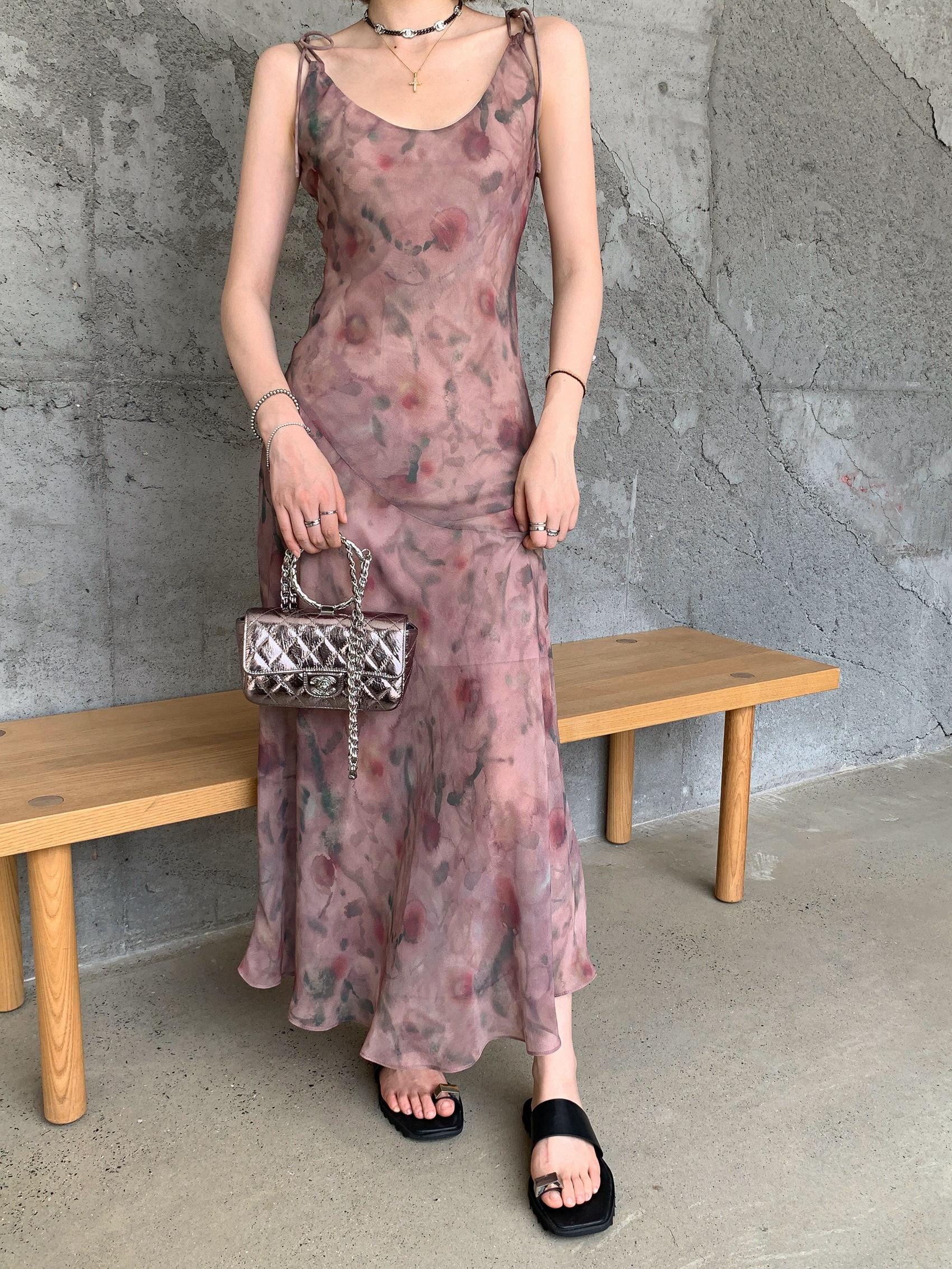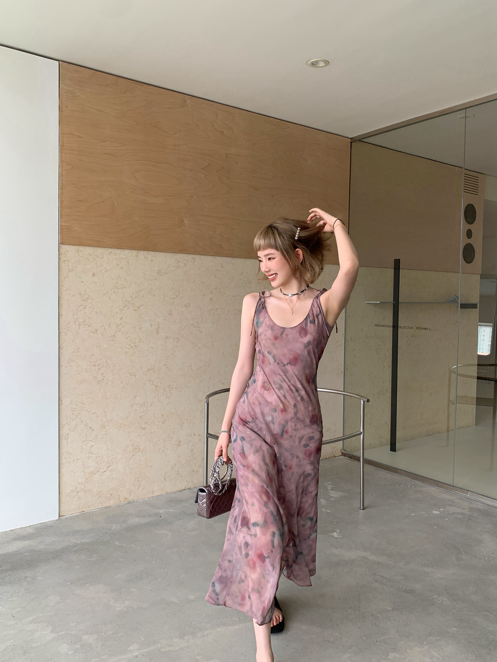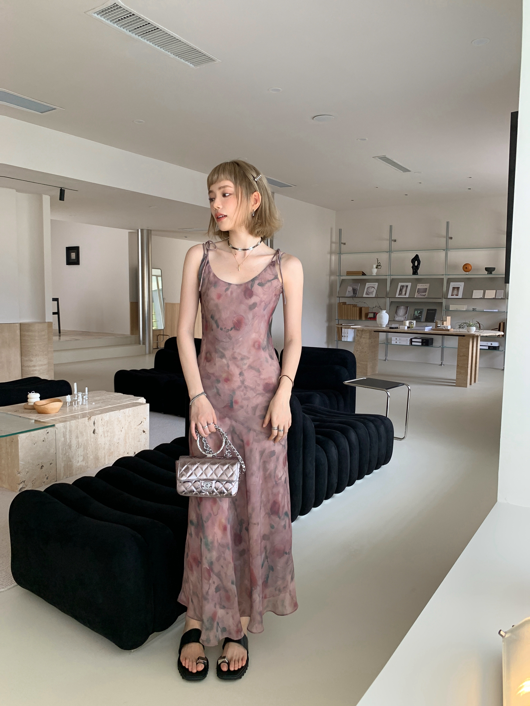 Echoes 「夏日邂逅」暈染印花吊帶洋裝女雪紡收腰修身顯瘦長裙