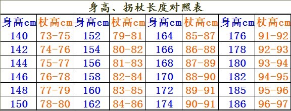 拐杖长度选择:穿鞋站在平地上,两手自然下垂,取立正姿势,然后测定手腕部皮肤横纹至地面的距离,这个距离的尺寸就是老年人使用手杖的理想长度。此乃专家给出的参考方法,依个人的使用习惯为准;仅供参考!