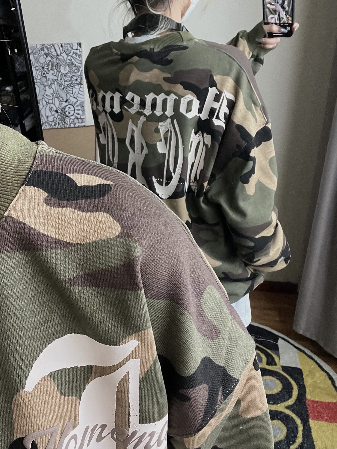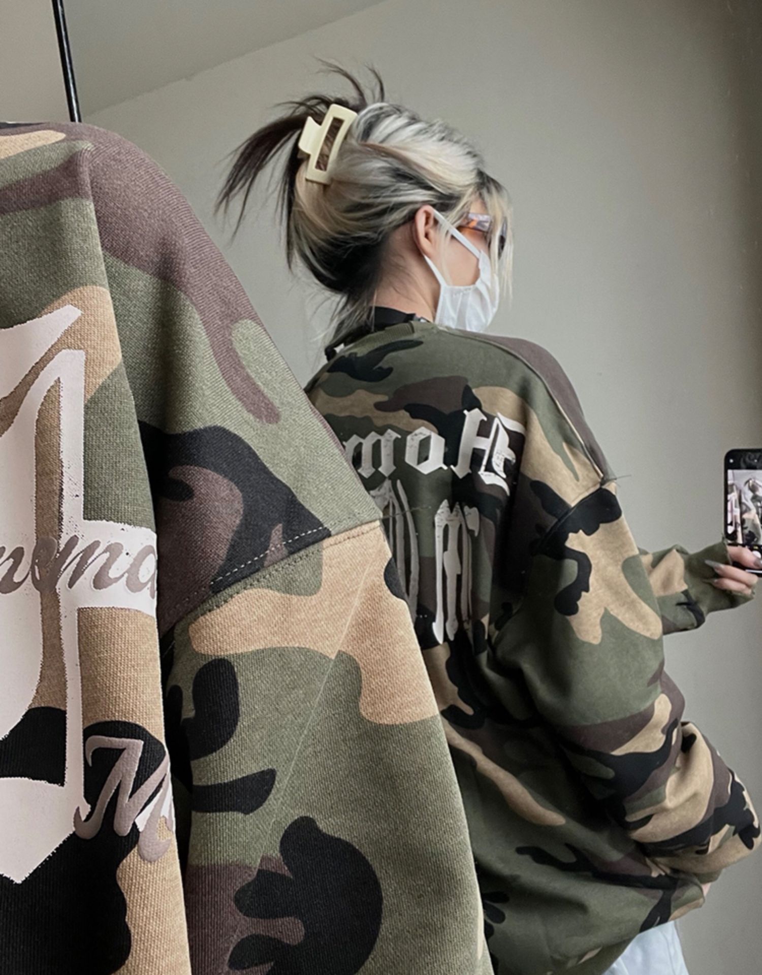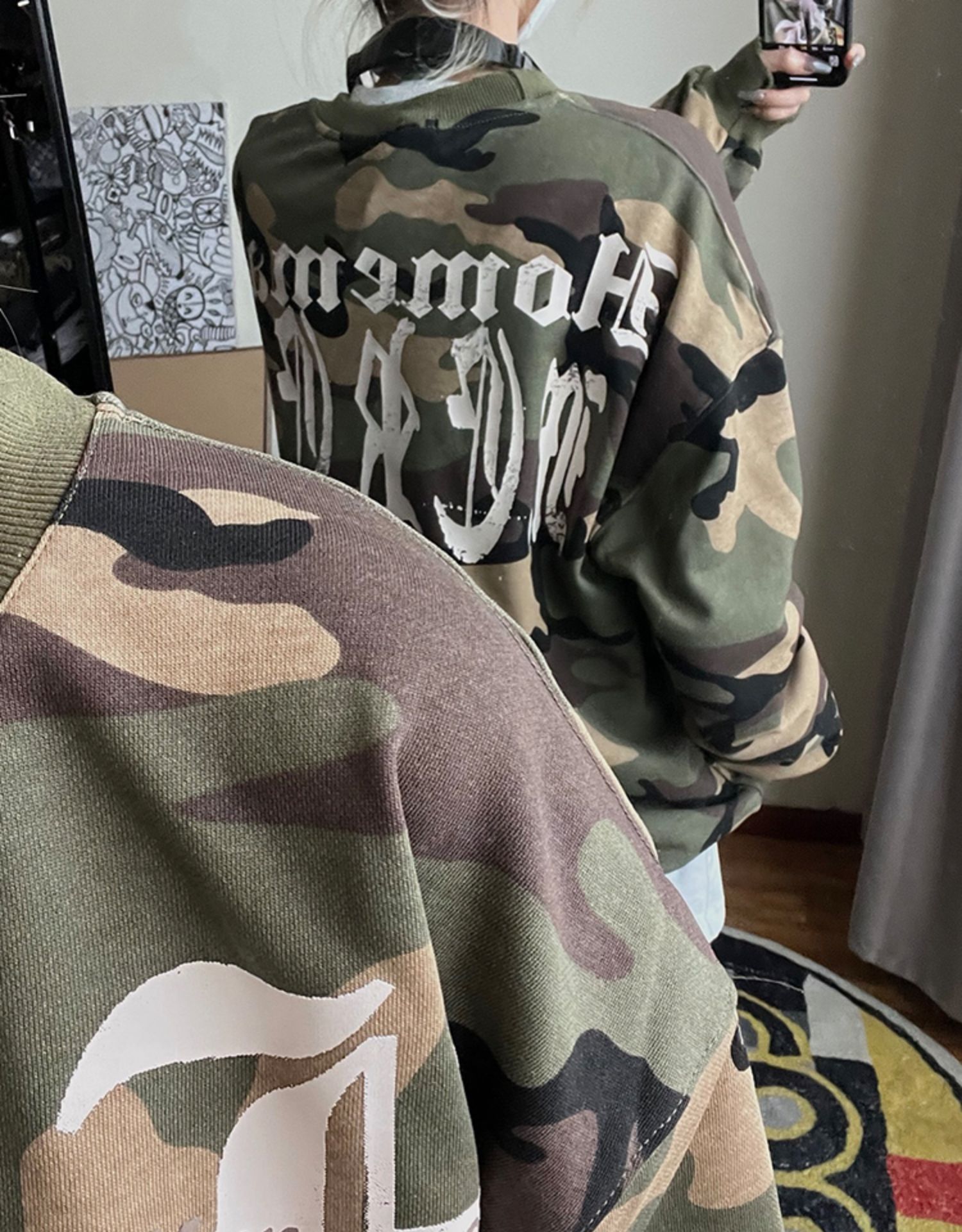 2022年秋季新款美式復古字母塗鴉迷彩圓領厚棉T男女街頭嘻哈上衣潮