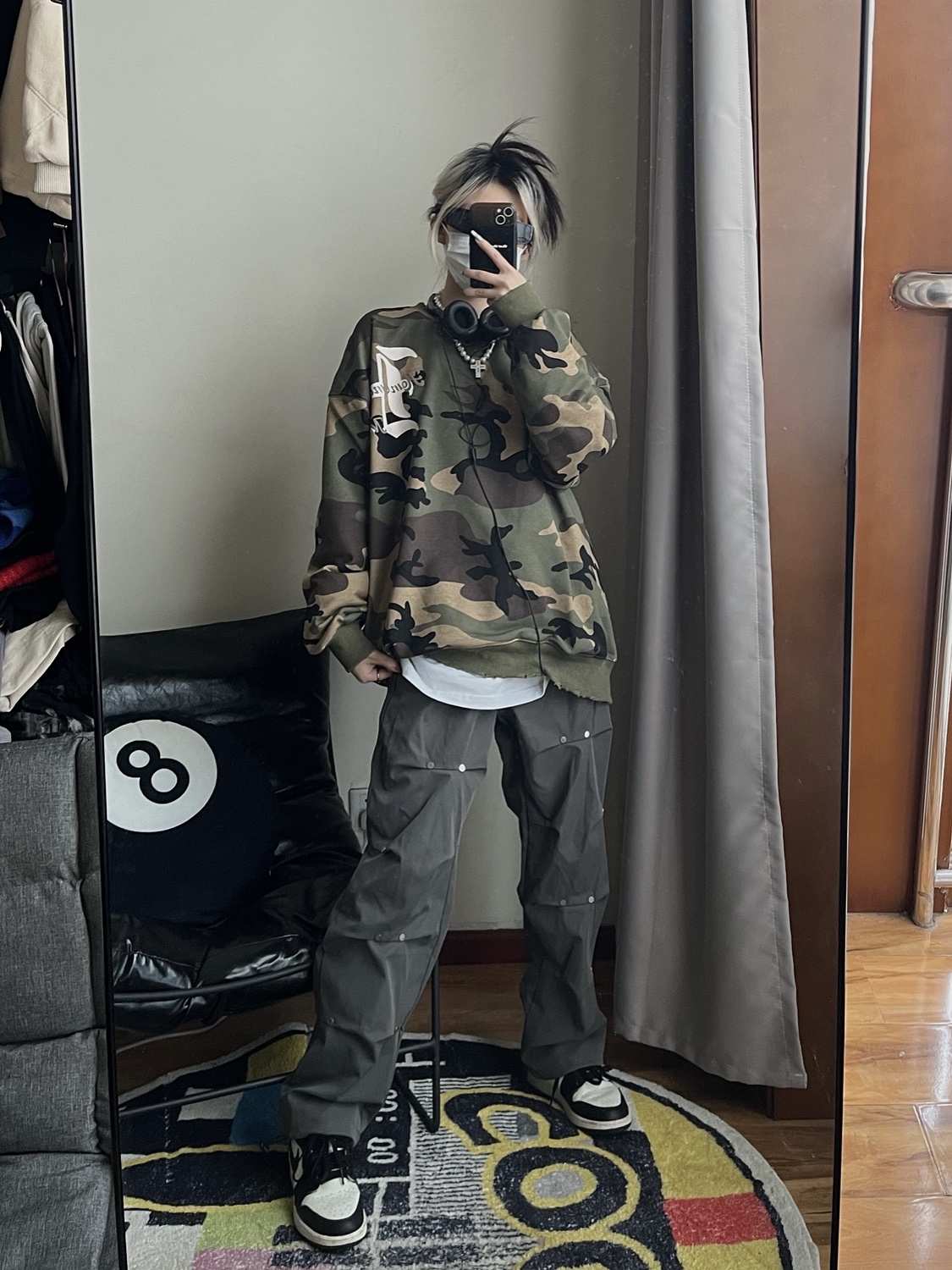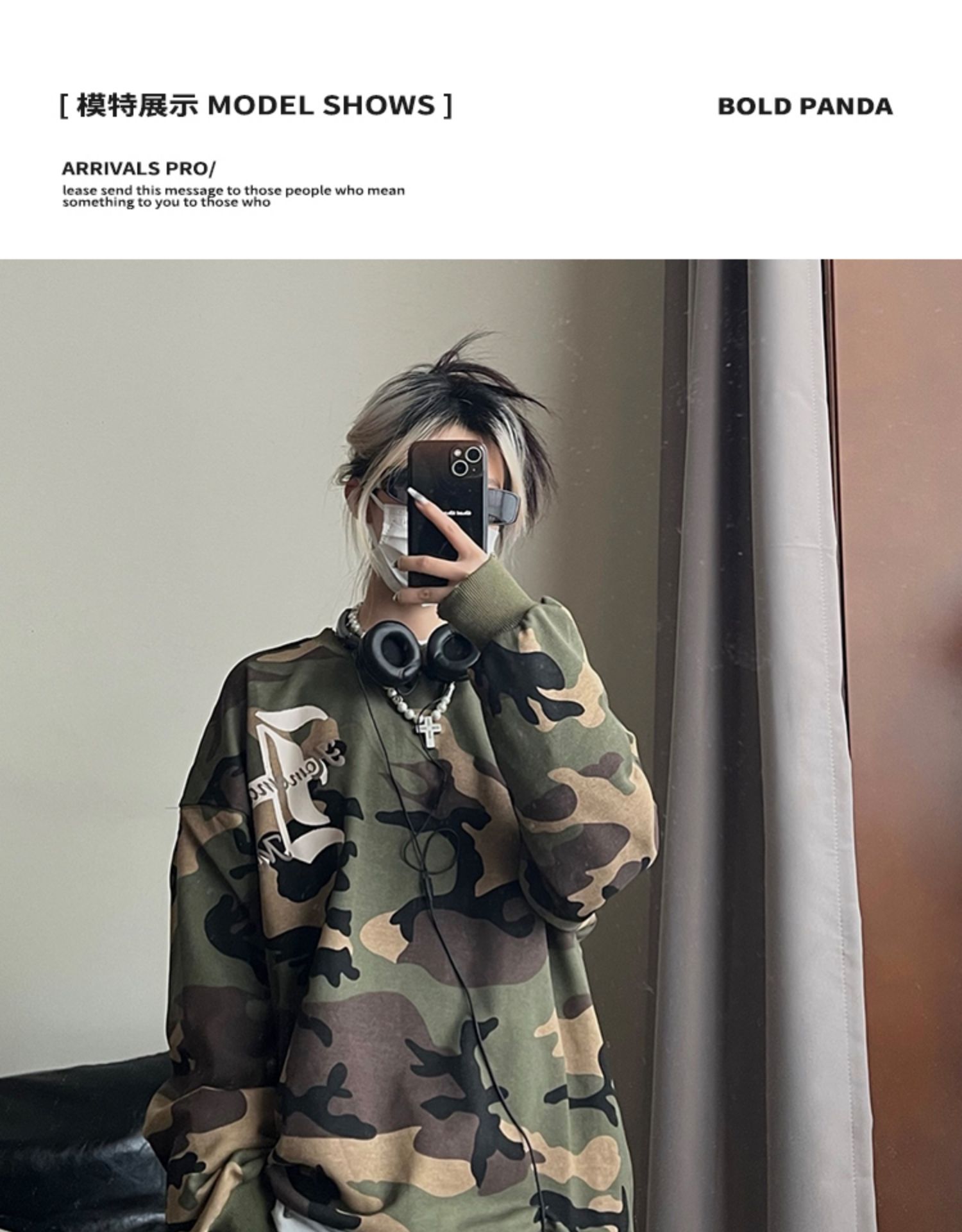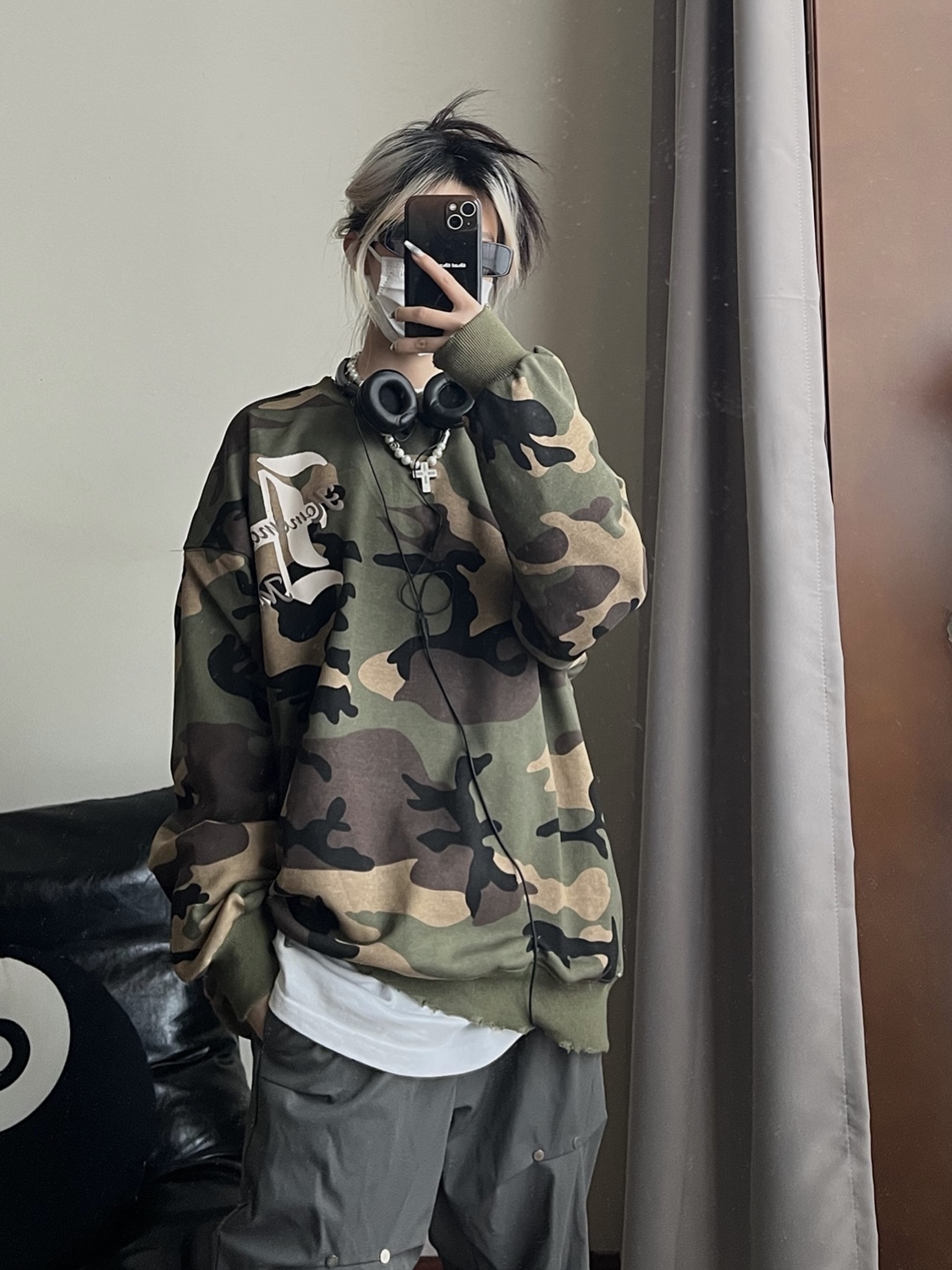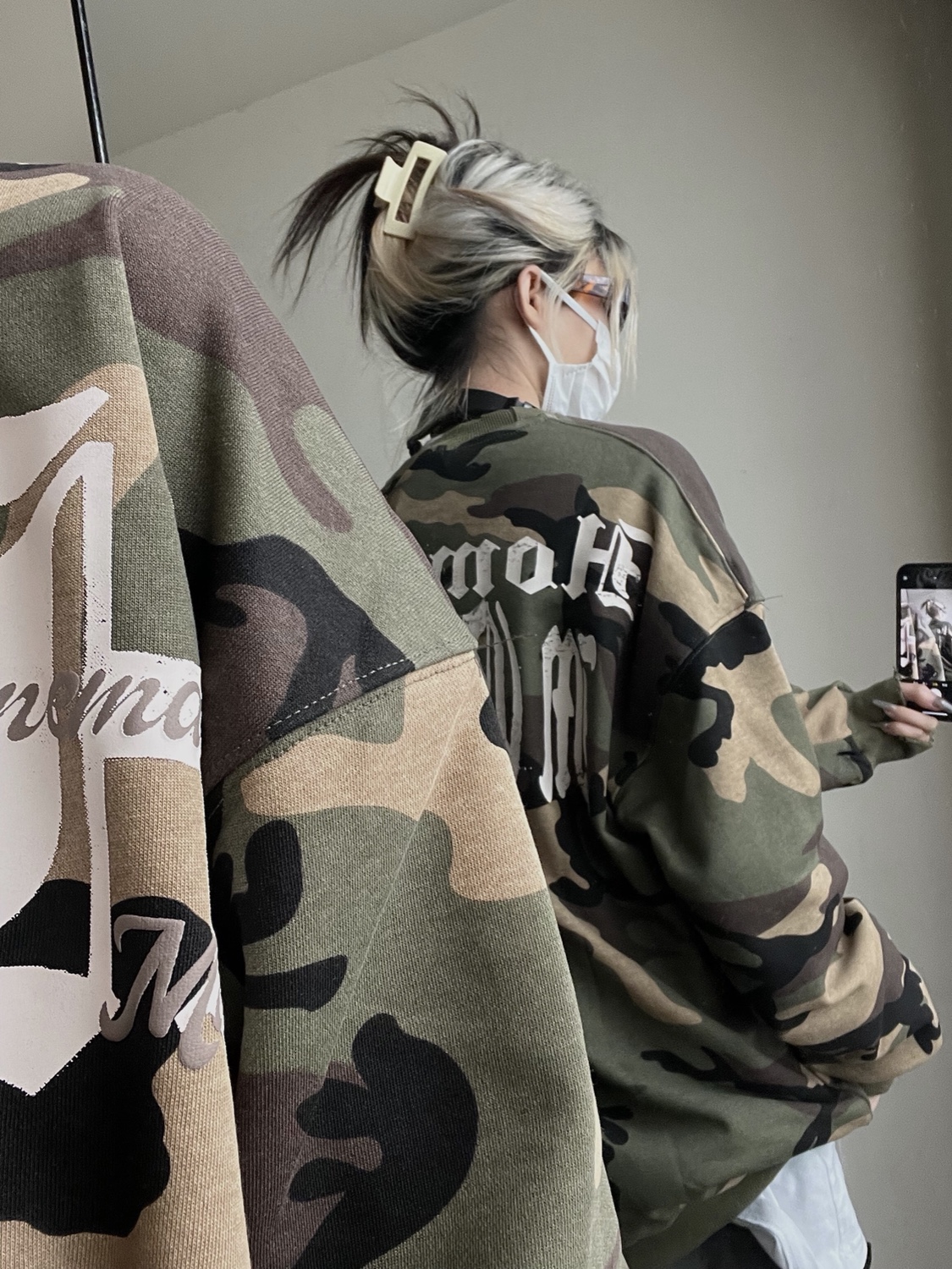 2022年秋季新款美式復古字母塗鴉迷彩圓領厚棉T男女街頭嘻哈上衣潮