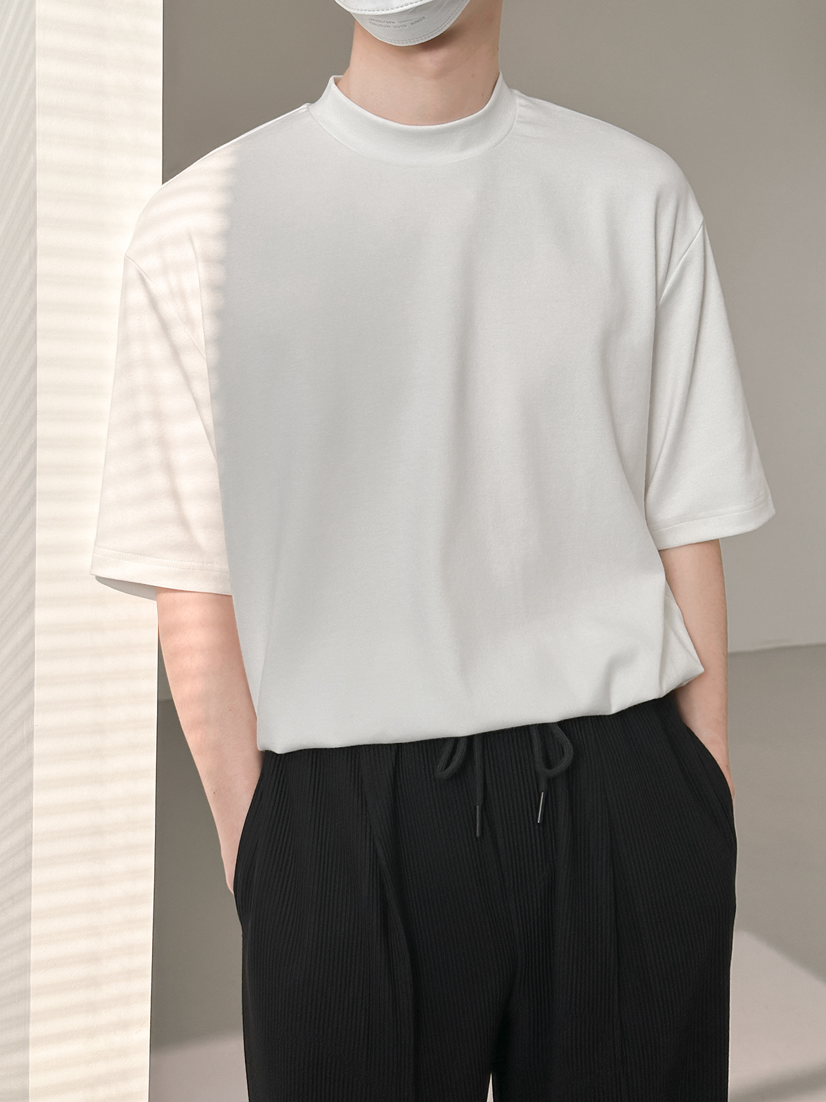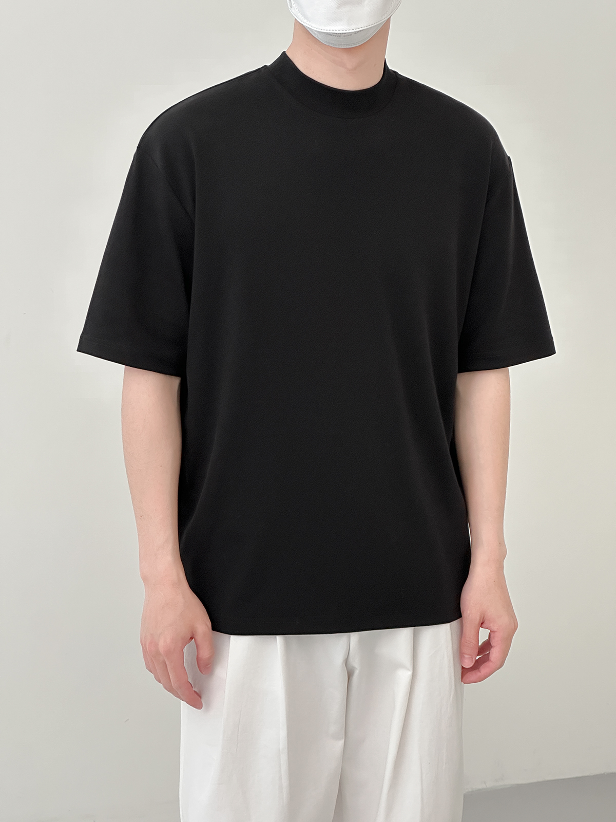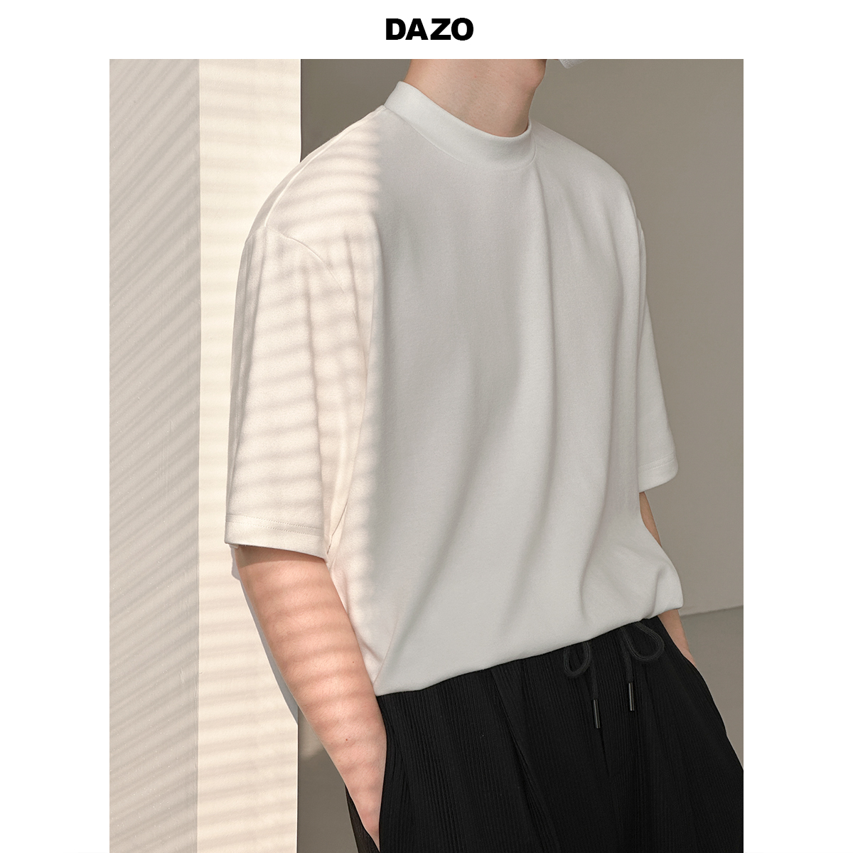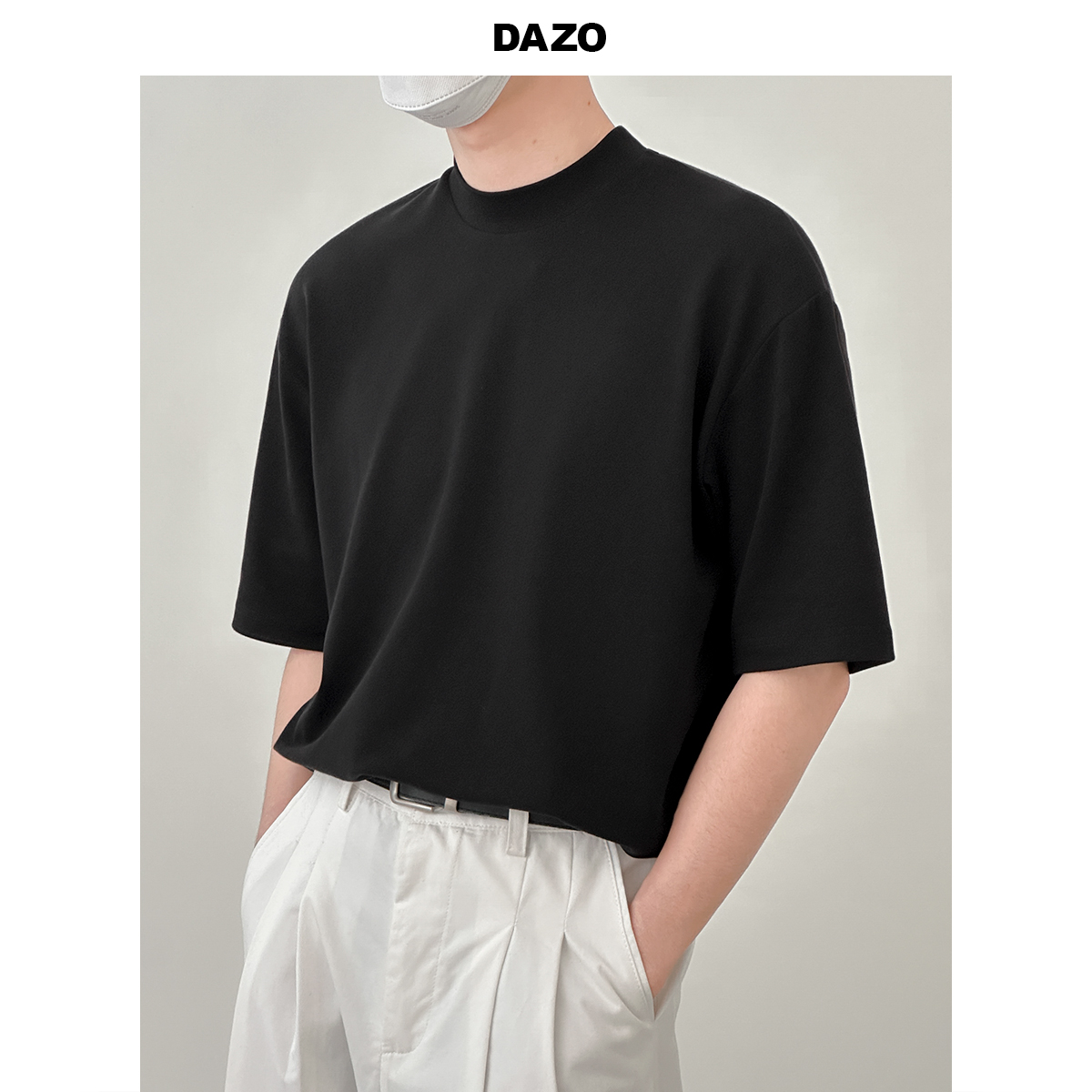 DAZO 高級感純色半高領短袖T恤男夏季小領口五分袖上衣寬鬆百搭潮