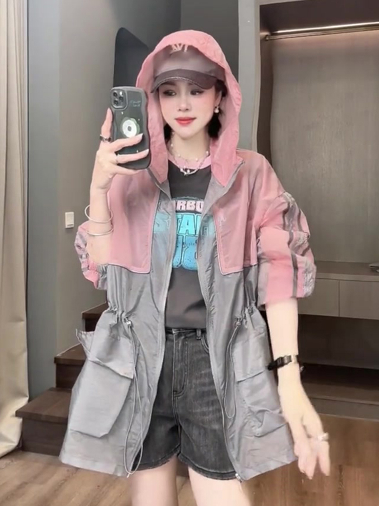 撞色連帽防曬衣女款夏季2023新款設計感中長版抽繩收腰防曬服外套